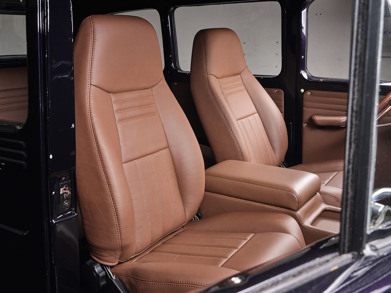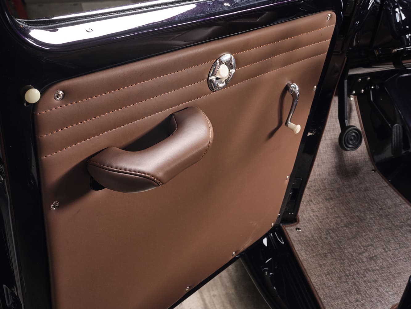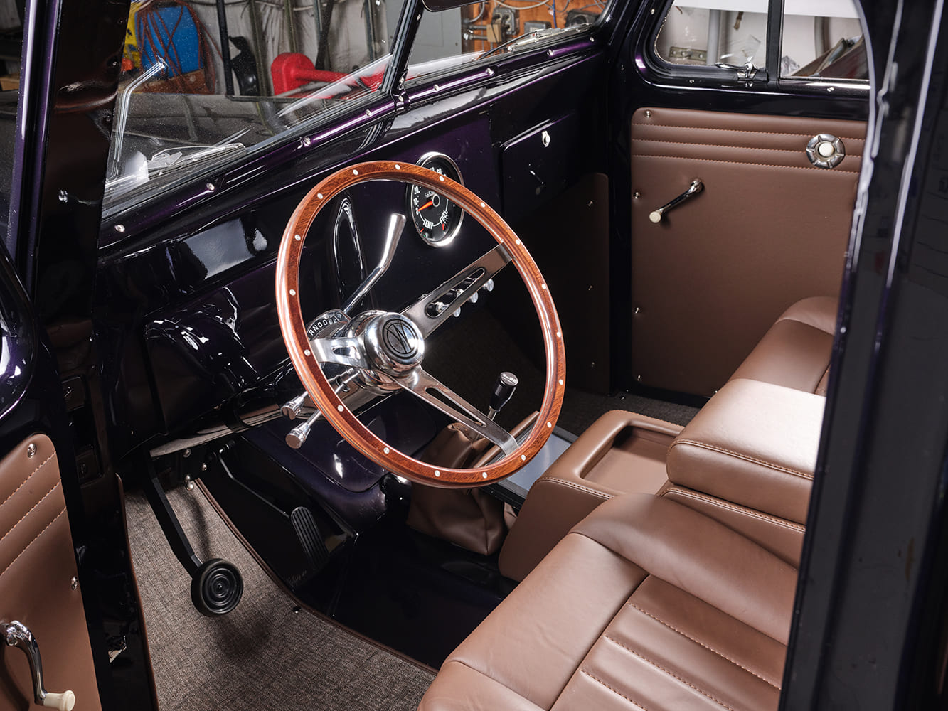 With the interior we wanted to still stay relatively true to the original idea. It had some creature comforts for the time but was also very utilitarian. The front door panels were redone with new leather but the layout and style were kept exactly the same as the original. We incorporate the three raised body lines that run along the top and bottom of the exterior panels into the interior. You’ll see them stitched into the top of the door and rear side panels as well as the seats. The dash was cleaned up and simplified with a replacement large speedometer and new billet knobs to control the headlights, wipers, and center LED pods. The front bend seat was replaced with two individual seats and a center console. The center console has a secret pop-out component that holds a Holley screen so that we’re still getting all the data and can make any adjustments to the motor. The interior is completed with a classic wood steering wheel and custom-made floor mats. They’re made out of marine interior, so easy to clean and they snap in and out so that the floor can be cleaned underneath them.