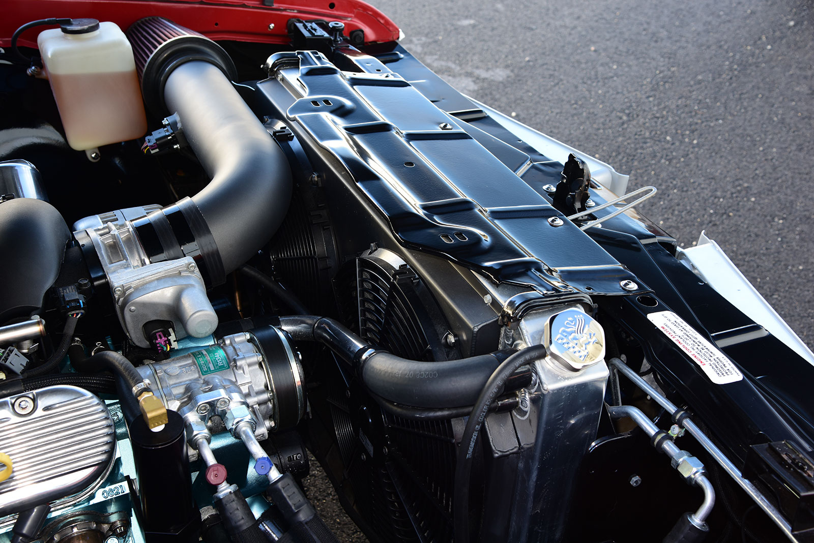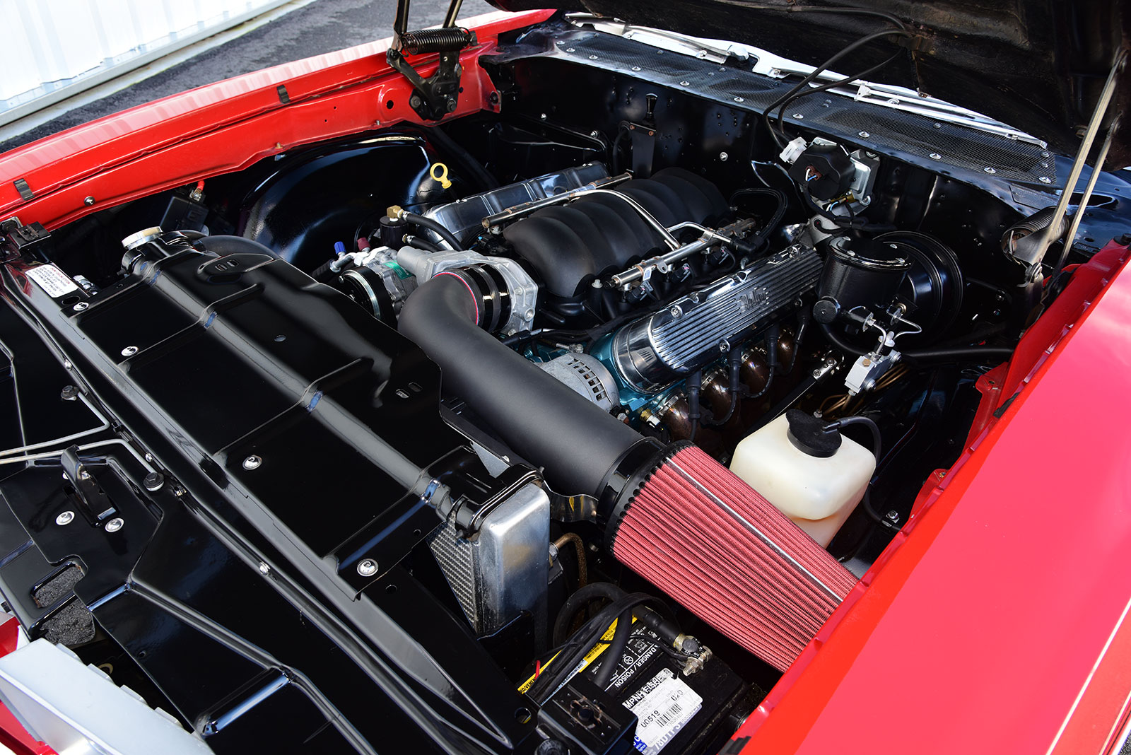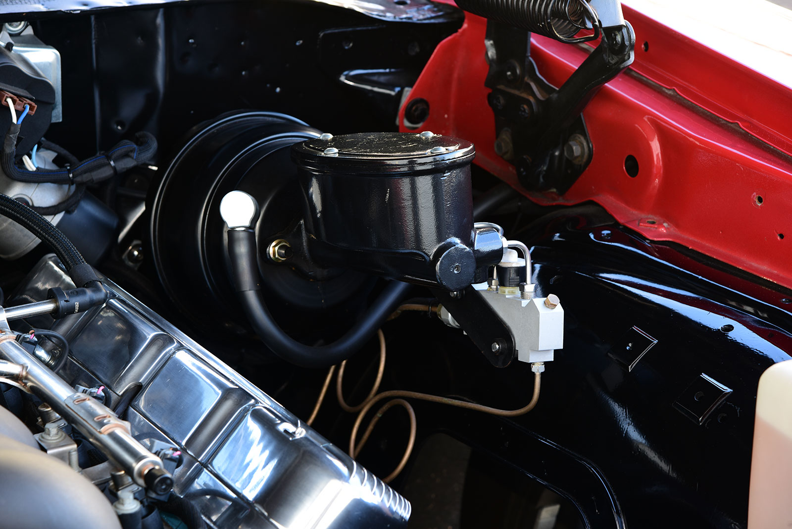 Out back, a Ford 9 inch rear end is filled with 31-spline axles matched to a Strange Engineering Pro-Series nodular iron third member with an Eaton Detroit Truetrac differential spinning 3.70 gears. It’s suspended in place by an RS parallel four-bar with matching Roadster Shop SV fixed valve coilover shocks by Fox and a Panhard bar. To up the ante with supercar–like handling, the Roadster Shop Independent Front Suspension is packed with features, including boxed lower control arms with tubular uppers matched to Wilwood ProSpindles, Roadster Shop SV fixed valve Fox coilover shocks, power rack-and-pinion steering, and heavy-duty sway bar. When it’s time to cut speed, a dual power JEGS master cylinder moves fluid through Roadster Shop custom-fit stainless steel brake line to 13-inch drilled-and-vented two-piece rotors with matching four-piston calipers from a Baer brake kit mounted at each corner. For plenty of vintage style, a set of Draft-Series 18×9 American Racing wheels wear NT555 G2 Nitto tires size 245/45ZR18 front, and NT555 RII Nitto Drag Radials sized P305/40R18 rear.