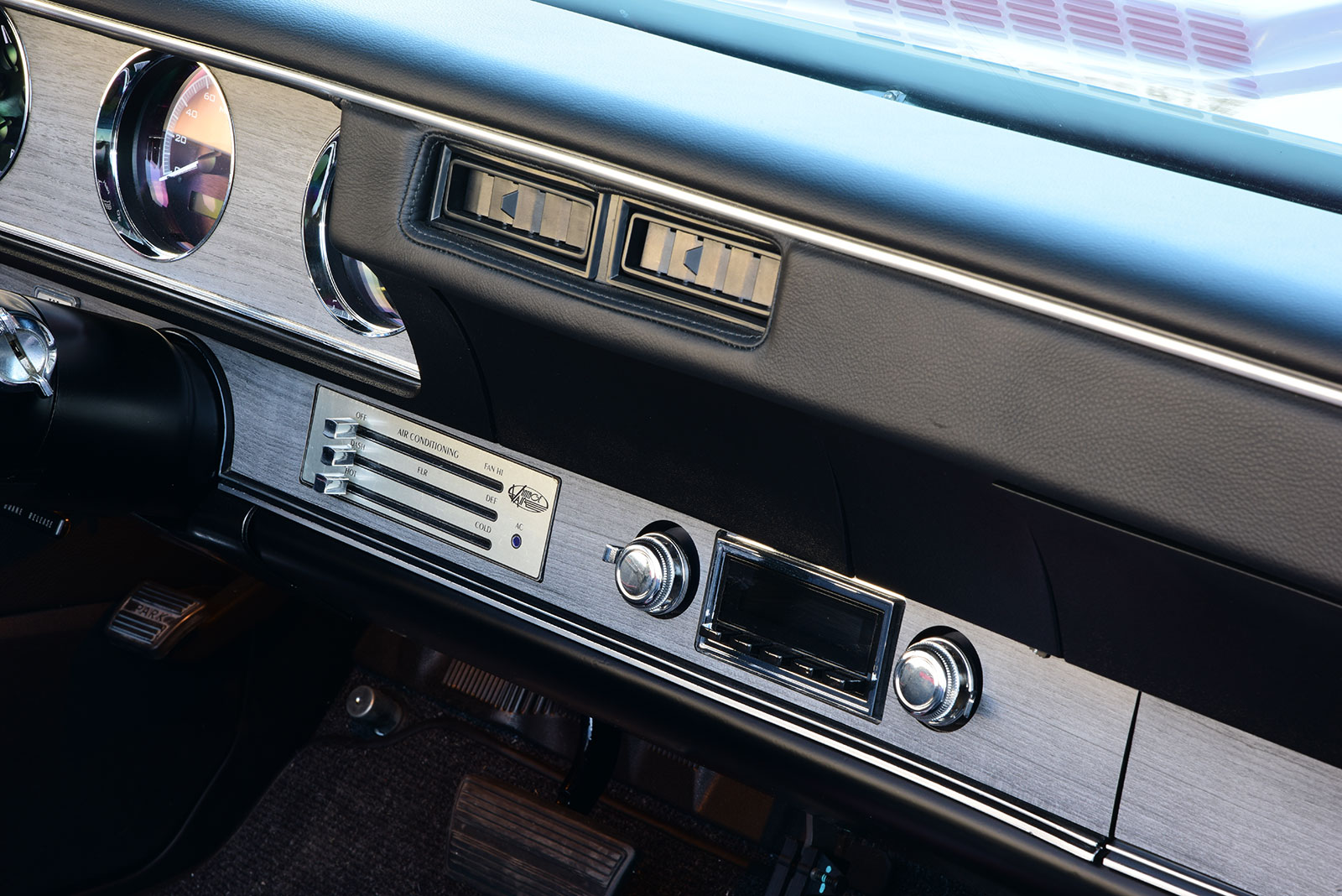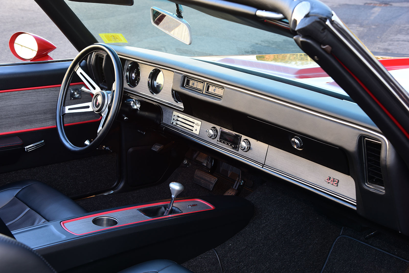 Wanting to give the business office a fresh new look, Bob contacted the talented team at JK Automotive Designs in Stoneham, Massachusetts, to give it new life. Getting started, the factory dash was custom-wrapped and treated to subtle wood inlays while also being fitted with new VHX dials from Dakota Digital to monitor the vitals. A factory replacement 4-4-2 steering wheel from Original Parts Group carves a course through an tilt ididit steering column with cool breezes coming from a Vintage Air SureFit system and an American Autowire system installed by Bayberry Vintage Autos making it all go live. When it came to comfort, JK Automotive Designs crafted full custom seating covered in a modern combination of black and gray leather with just enough red accent, which also carries over to the custom side panels, one-off console, and complementing square-weave carpet. Completing the look, JK Automotive Designs nailed it with a perfectly executed black canvas convertible top.