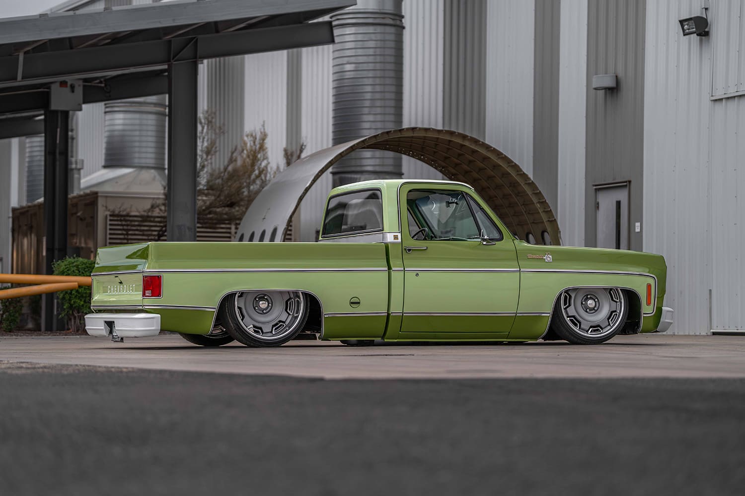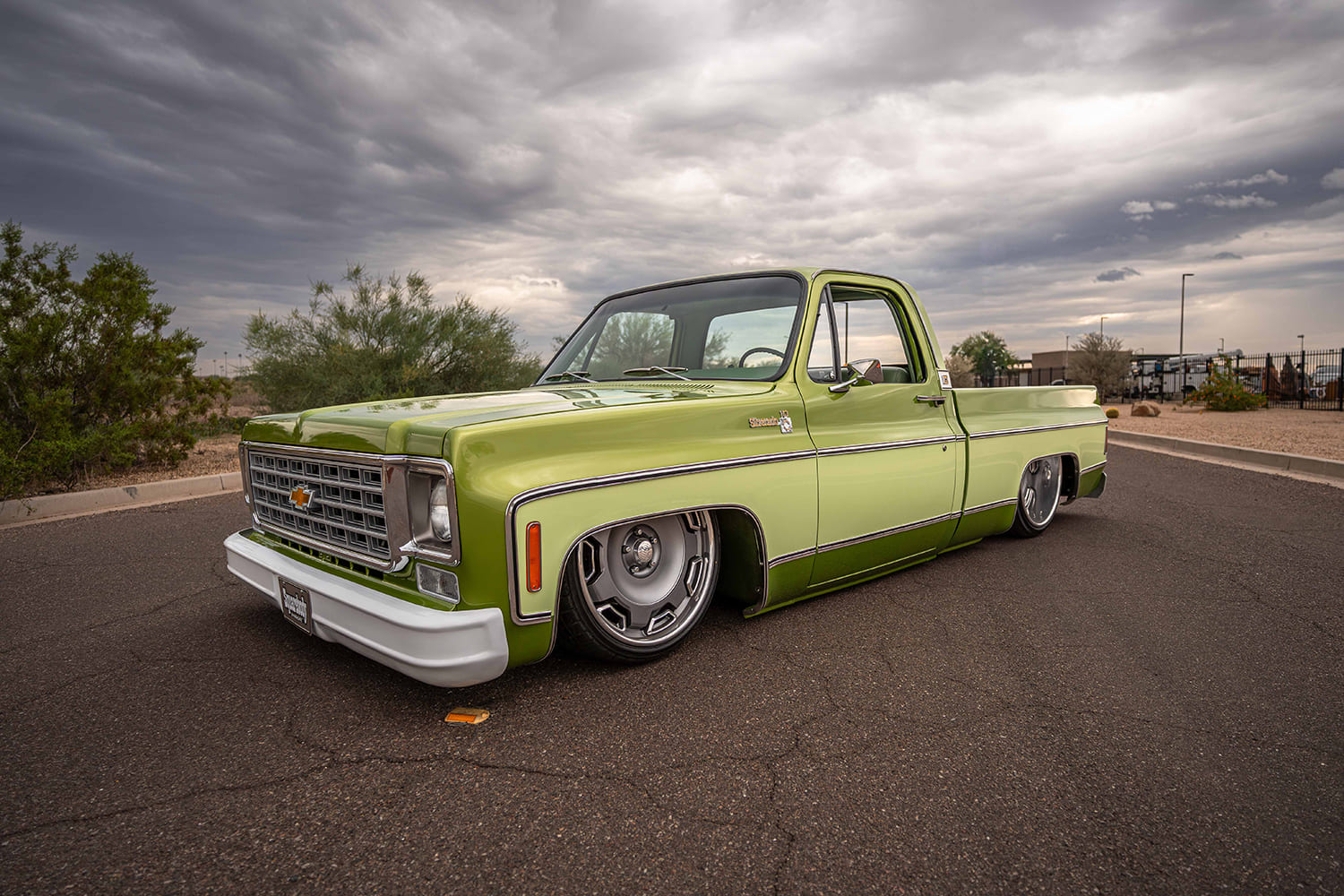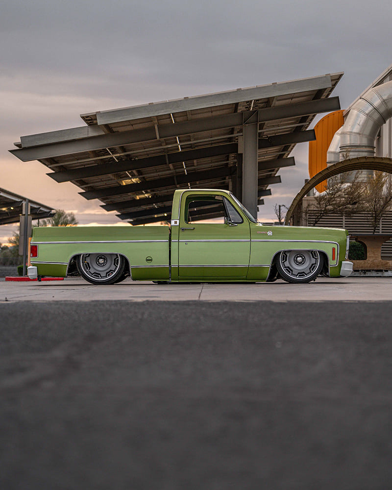 After initially acquiring a seemingly creampuff YE9 (top model option for the “Rounded Line” C/K in 1976) Medium Lime Metallic Silverado in the summer of 2024, Cornerstone Auto Fab kicked things off in August of that year—got the Avocado in the ripening stages, as it were—by appropriately updating the stock chassis. Out back, after Z’ing the frame, a Watts link-assisted parallel four-link was incorporated with the factory (4-inch narrowed) 12-bolt that’s now fitted with 13-inch Baer SS4+ brakes and Air Lift Performance bags. Up front, the stock control arms have been modified for ALP bags and now use 2-inch dropped spindles mounting Baer’s 14-inch Pro+ brakes with KYB shocks dampening the ride and Air Lift 3H/FloAIR control system managing the profile. Replacing the old 5.7 SBC 350 is a new 6.0L LS outfitted with Holley EFI and Terminator xMax ECU, cast-iron exhaust manifolds (feeding a stainless Lyell’s/Flowmaster FLO FX exhaust), and Holley’s mid-mount front drive. AMD’s repop Chevrolet script valve covers were mounted using Delmo Speed billet adapters. U.S. Mags’ recently released Prescott two-piece billets in 22×9 and 22×12 (wearing cast gray-coated centers) wear Lionheart 30-series radials, giving the Silverado a perfect modern-retro look.