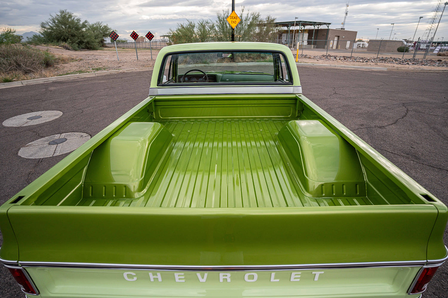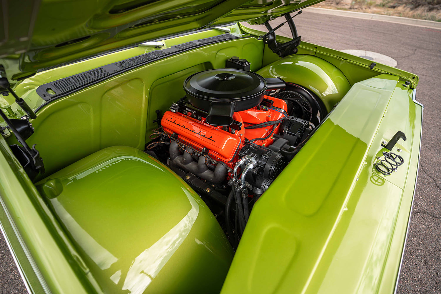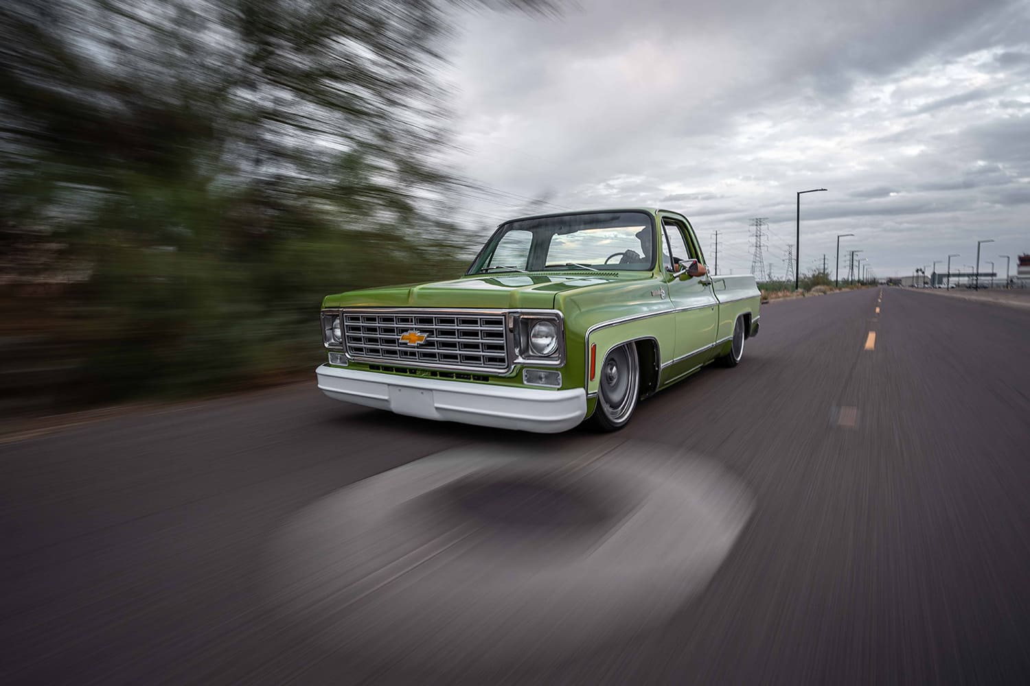 After initially acquiring a seemingly creampuff YE9 (top model option for the “Rounded Line” C/K in 1976) Medium Lime Metallic Silverado in the summer of 2024, Cornerstone Auto Fab kicked things off in August of that year—got the Avocado in the ripening stages, as it were—by appropriately updating the stock chassis. Out back, after Z’ing the frame, a Watts link-assisted parallel four-link was incorporated with the factory (4-inch narrowed) 12-bolt that’s now fitted with 13-inch Baer SS4+ brakes and Air Lift Performance bags. Up front, the stock control arms have been modified for ALP bags and now use 2-inch dropped spindles mounting Baer’s 14-inch Pro+ brakes with KYB shocks dampening the ride and Air Lift 3H/FloAIR control system managing the profile. Replacing the old 5.7 SBC 350 is a new 6.0L LS outfitted with Holley EFI and Terminator xMax ECU, cast-iron exhaust manifolds (feeding a stainless Lyell’s/Flowmaster FLO FX exhaust), and Holley’s mid-mount front drive. AMD’s repop Chevrolet script valve covers were mounted using Delmo Speed billet adapters. U.S. Mags’ recently released Prescott two-piece billets in 22×9 and 22×12 (wearing cast gray-coated centers) wear Lionheart 30-series radials, giving the Silverado a perfect modern-retro look.