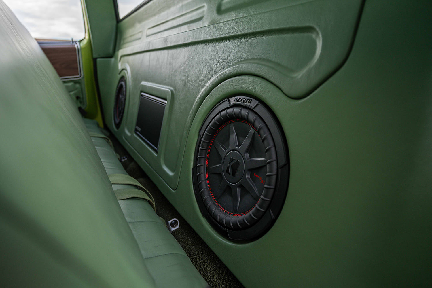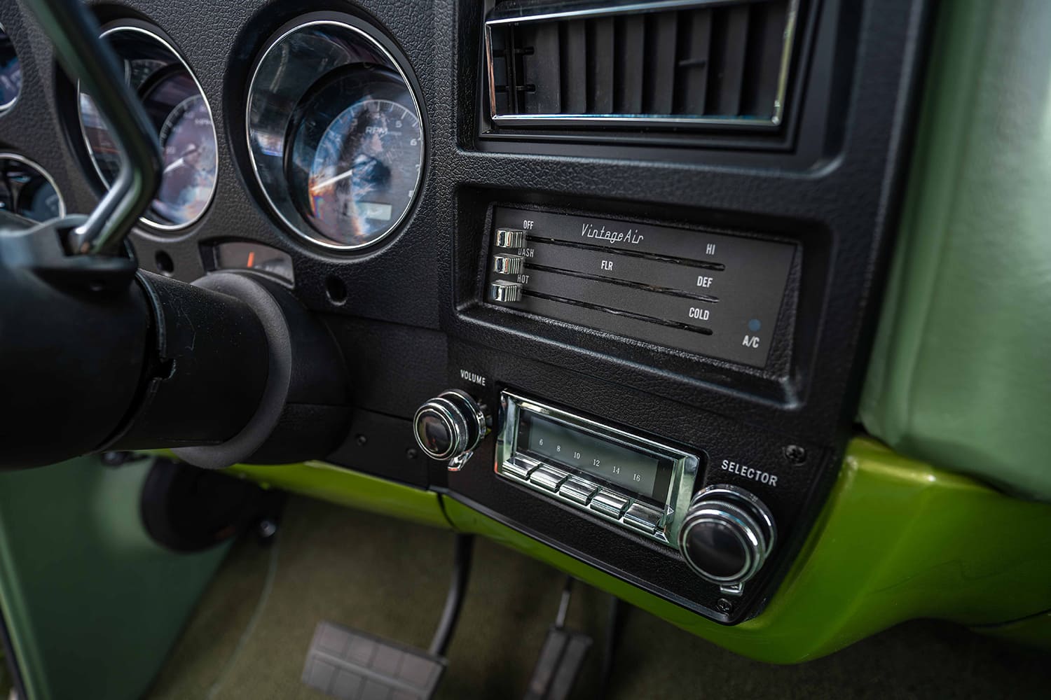 Avocado Truck was wrapped up, literally, without leaving Michael’s shop with the perfectly color-matched Apex Leather interior with complementing ACC carpeting. In the process, a Custom Autosound/Kicker stereo, Vintage Air A/C, and Dakota Digital’s VHX gauges—all that just-right modern-retro manner.
