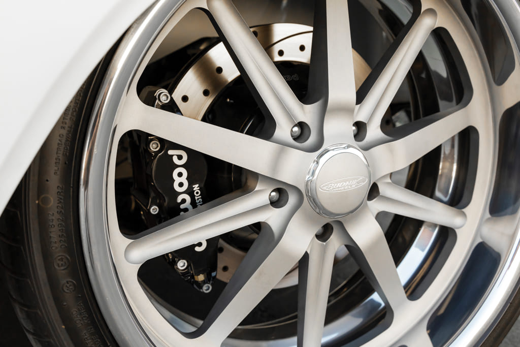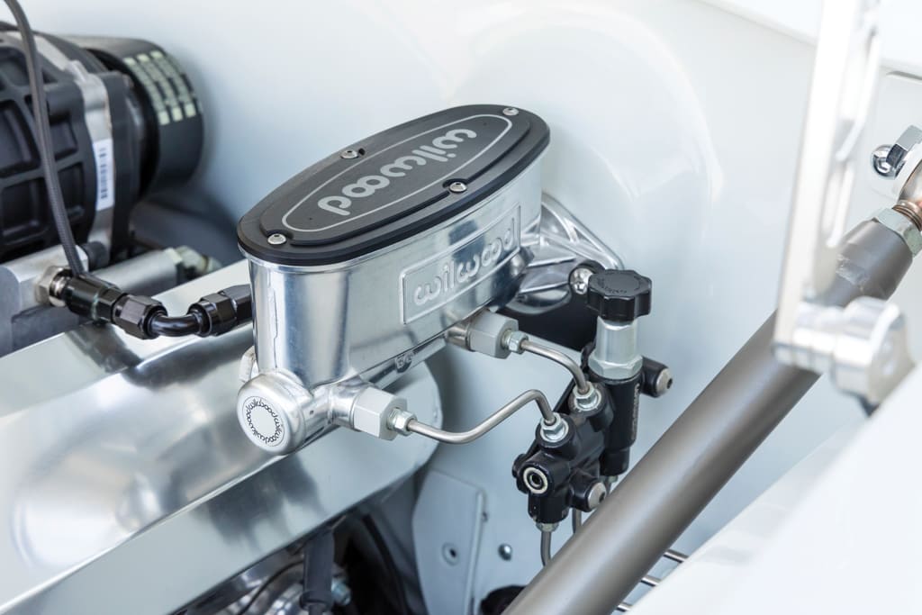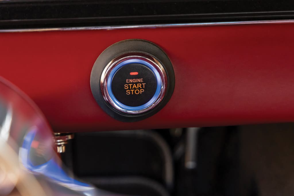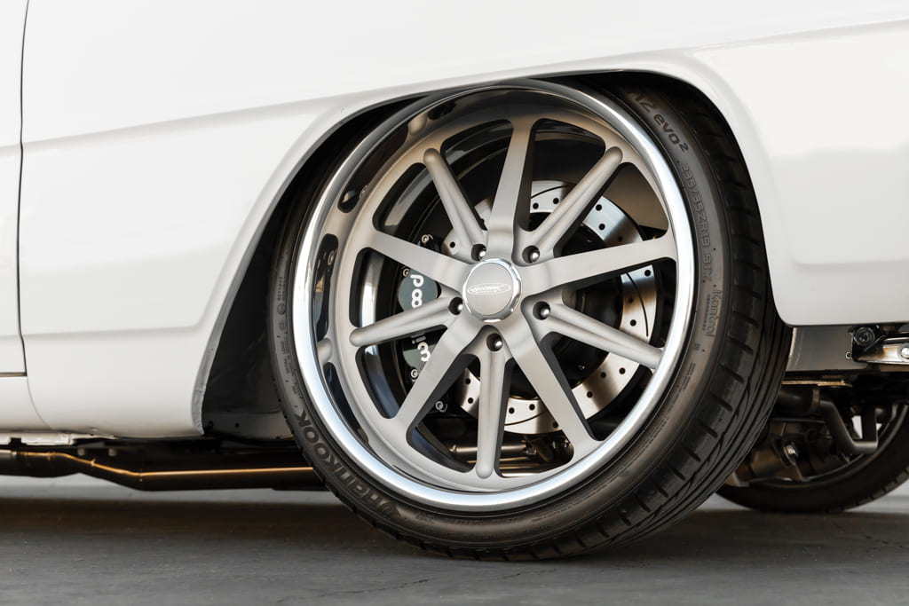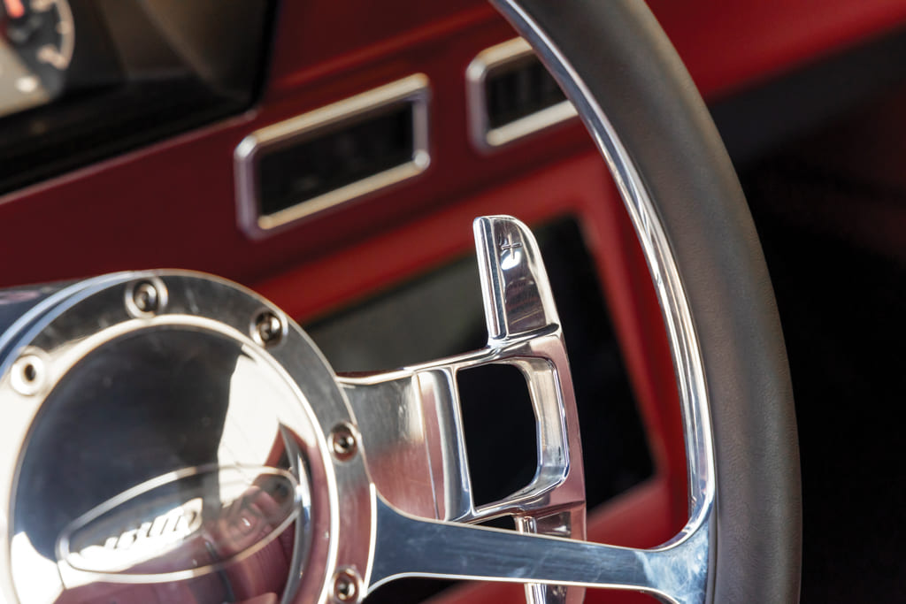 Underneath, the car is equipped with TCI suspension components, including a complete front subframe, subframe connectors, and four-link rear suspension. Christian opted for Ridetech ShockWave air suspension, operated by an AccuAir e-Level system, giving him adjustable ride height and handling capabilities at the push of a button. Braking power comes from a complete Wilwood system, which includes 14-inch front rotors with six-piston calipers and 13-inch rear rotors with four-piston calipers. A Wilwood tandem master cylinder and proportioning valve feeds the system, which is tied together with custom stainless steel lines. Lakeside Speed and Shine mini-tubbed the car, to make room for 20×11 Budnik billet rollers, wrapped in 305/25R20 rubber. Up front, 19×8.5 wheels fill the fenders nicely and provide an excellent stance in combination with the air suspension.