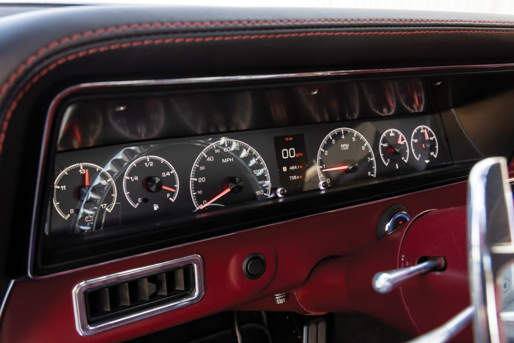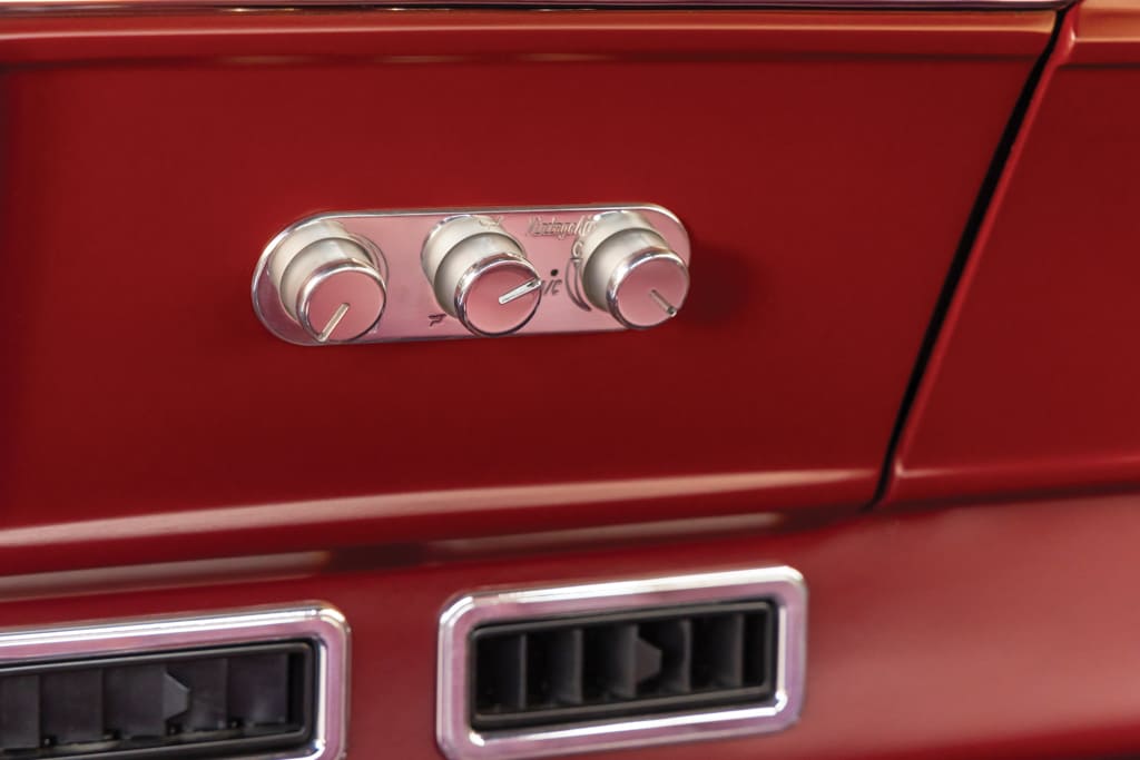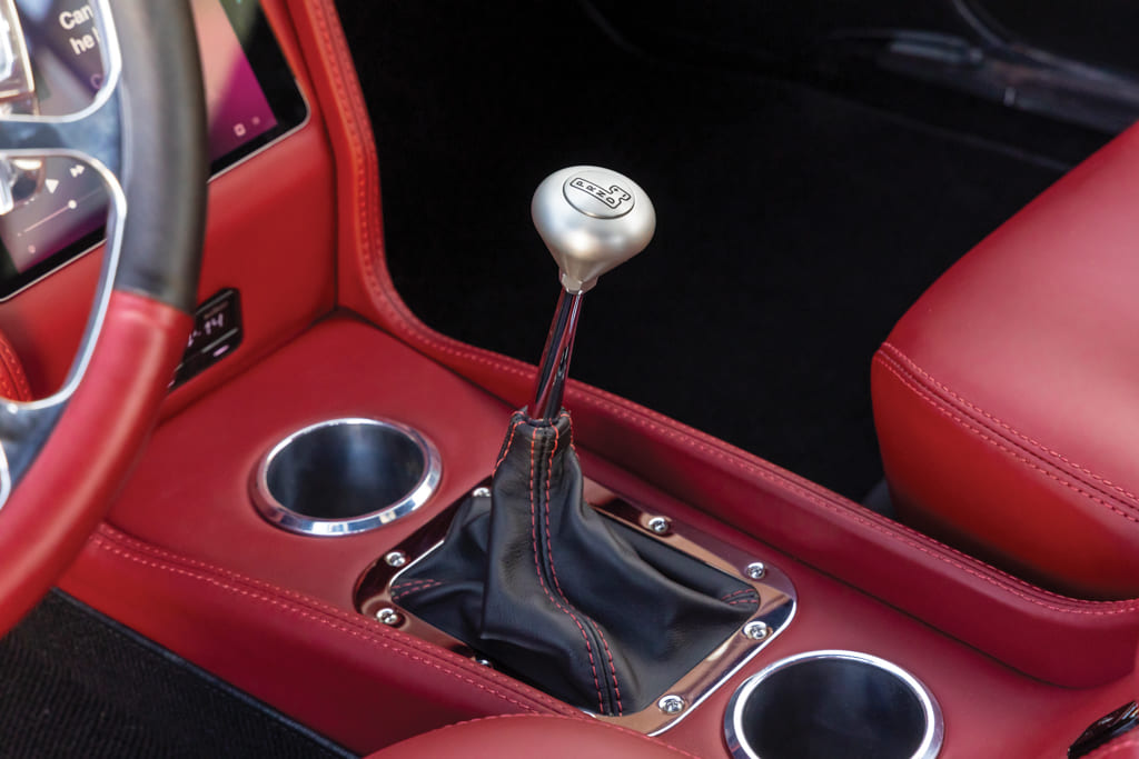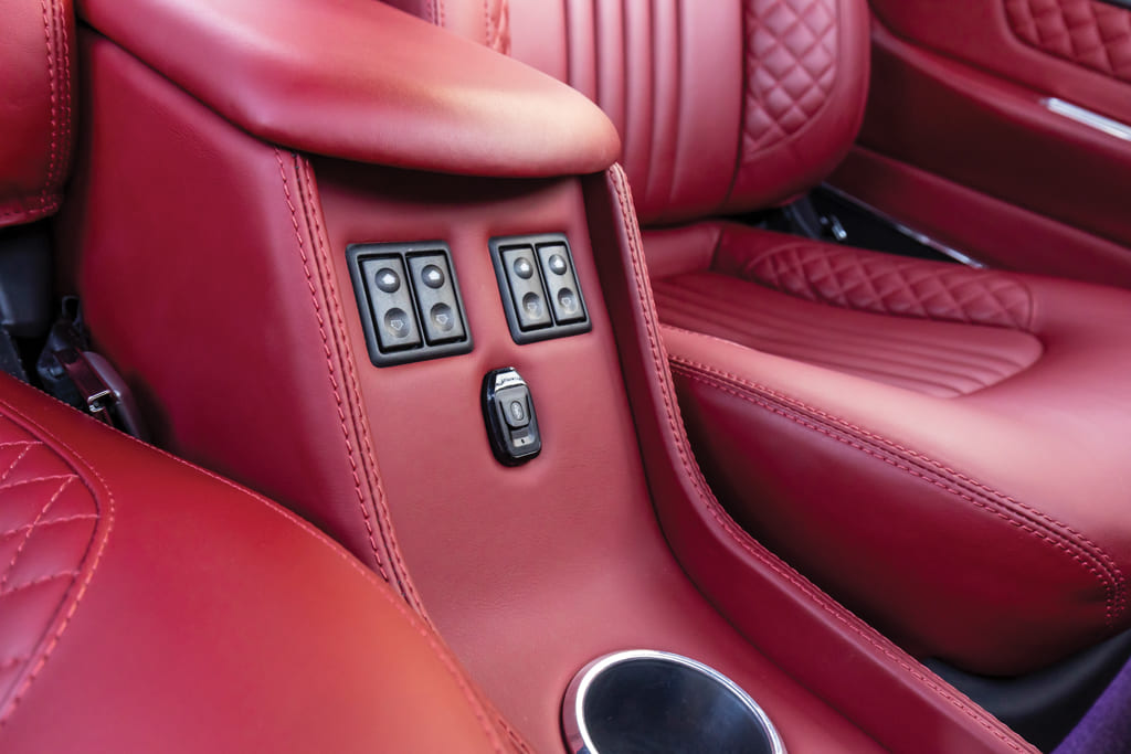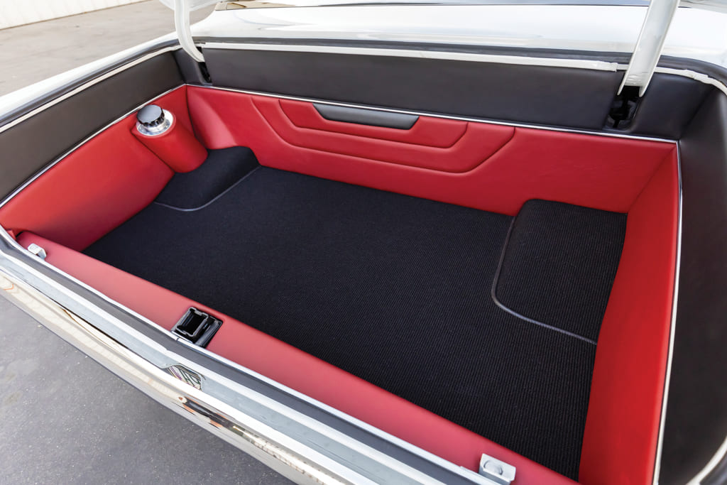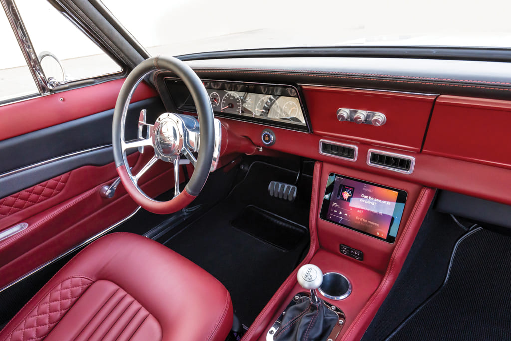 A custom console houses the power window switches, Eddie Motorsports billet cupholders, and an iPad Mini, which serves as the head unit for the custom stereo system. Carlos Rodriguez at The Art of Sound in Upland, California, is responsible for the audio install, which consists of dual Audison amplifiers (one for mids and highs and one for the subwoofers) and an array of speakers. Audison 6.5-inch and 6×9 speakers and dual Fosgate 10-inch subwoofers are tied together and placed tastefully throughout the car. Vibro Solutions insulated the interior and trunk to provide great sound quality.