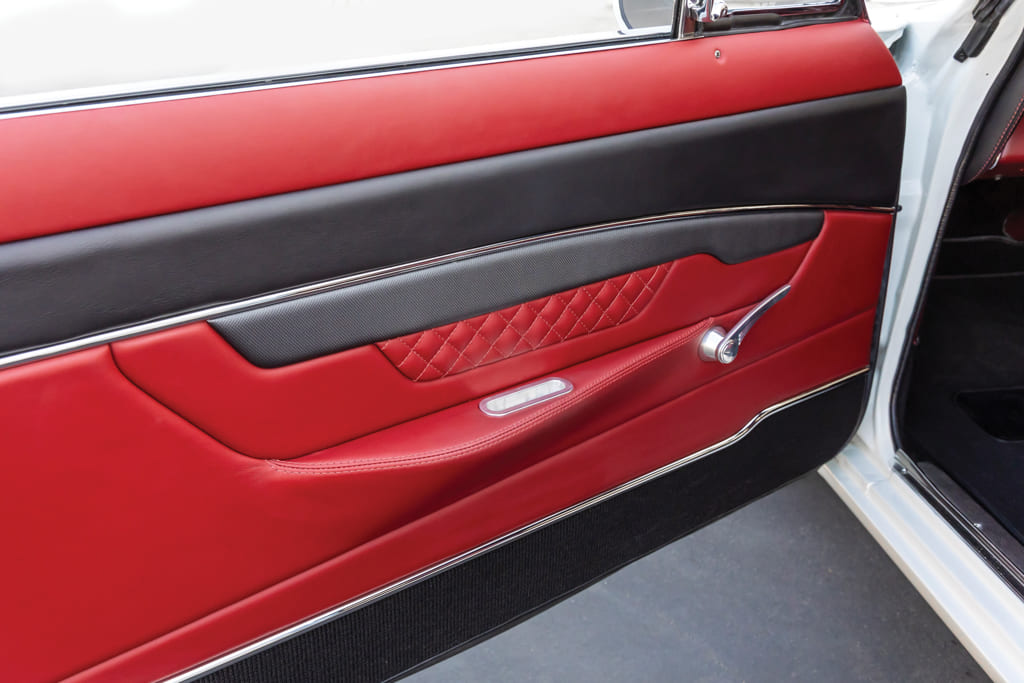 The interior is where Christian’s build went to the next level. He sent the car to Elegance Auto Upholstery in Montclair, California, where Mark Lopez and crew brought many details to life. Maserati Rosso and Mercedes Black were the colors of choice, and the materials include Italian Nappa smooth grain leather and Alcantara suede. The custom seats are from a Lexus SC 300, and the retractable seatbelts came from Retro Belt. Custom door panels are scratch-built with hand-fabricated armrests, chrome-plated brass molding, and Billet Specialties door handles.