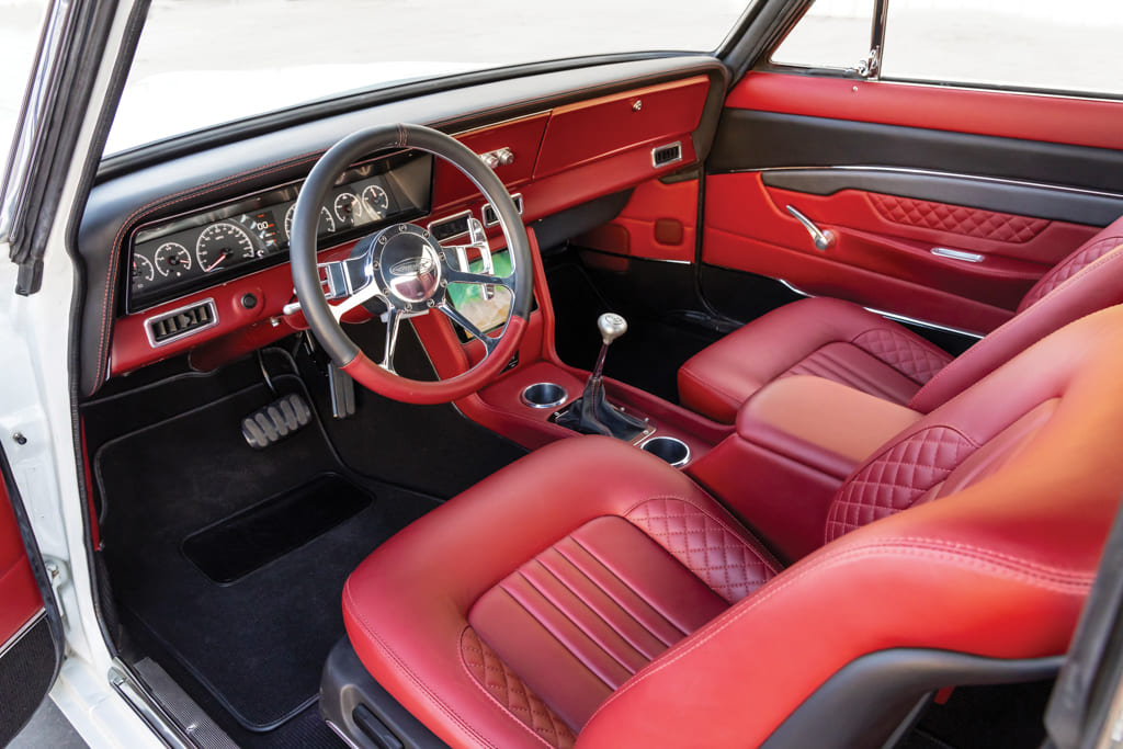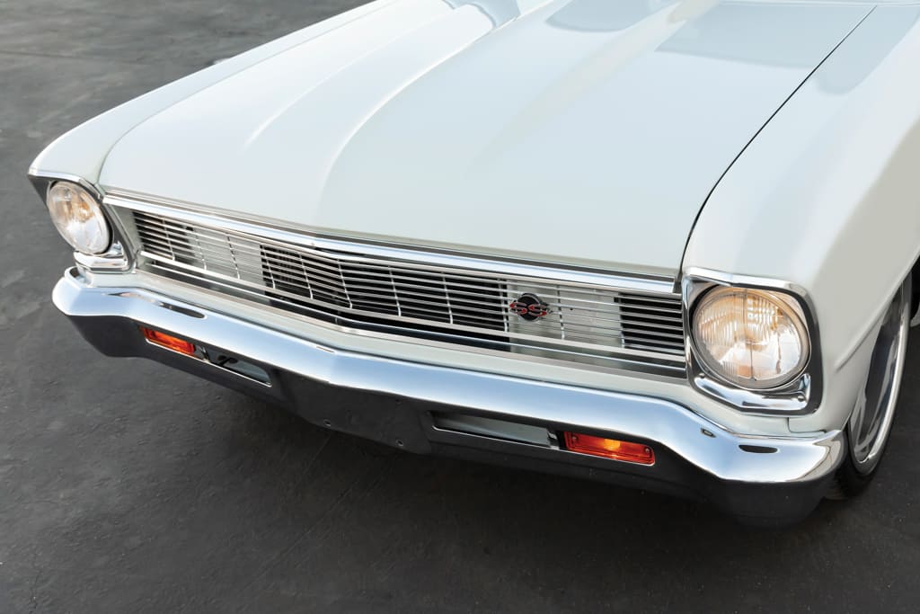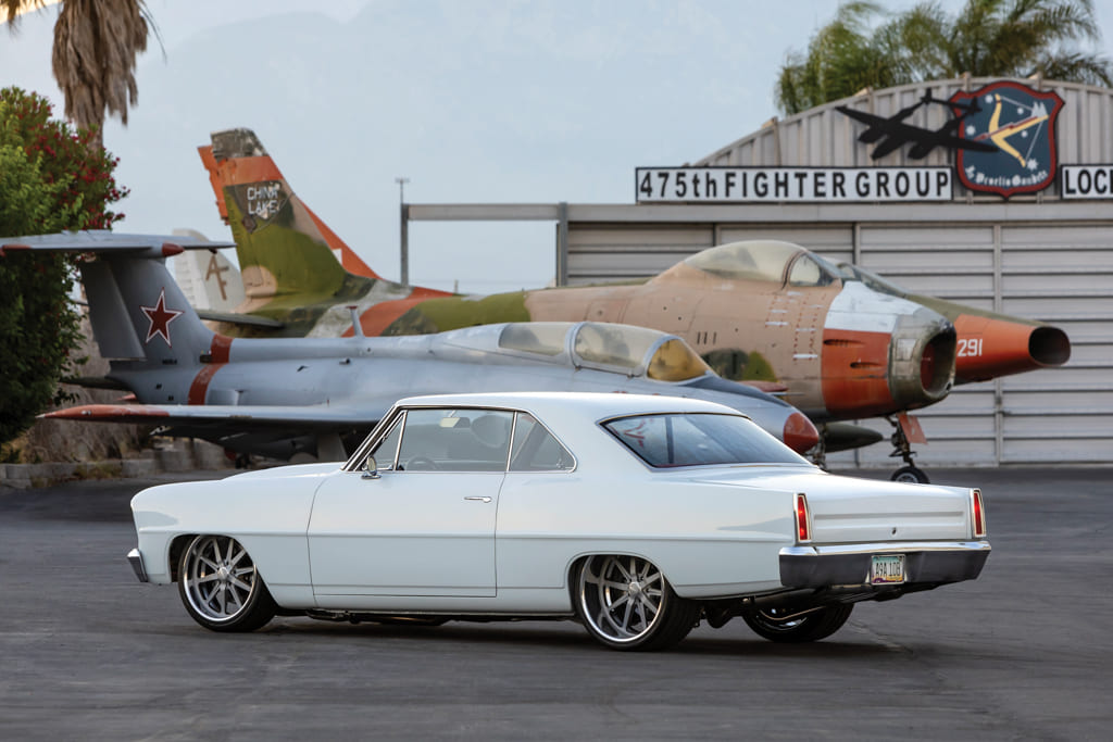 Body modifications are minimal, as Christian feels like the ’66 and ’67 Nova body style is nearly perfect as-is. The subtle modifications include a cowl induction hood, shaved emblems, and flush-fit Kindig-It Design door handles. The body needed repairs and the complete bodywork treatment inside, outside, and underneath. After several cycles of block-sanding and primer, Jim McKay laid down the PPG paint in Carrera White. The bumpers are smoothed and tucked in nicely, and all trim restoration was handled by The Polishing Shop for the perfect finishing touch.