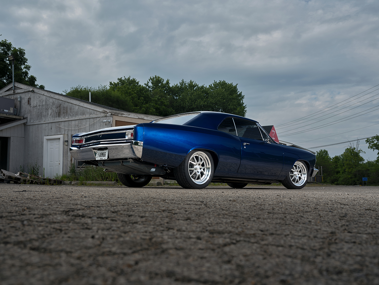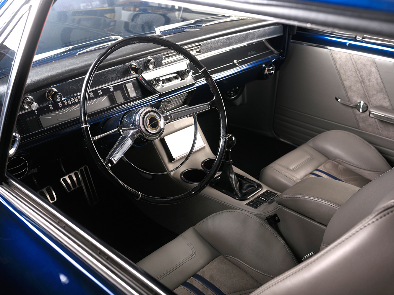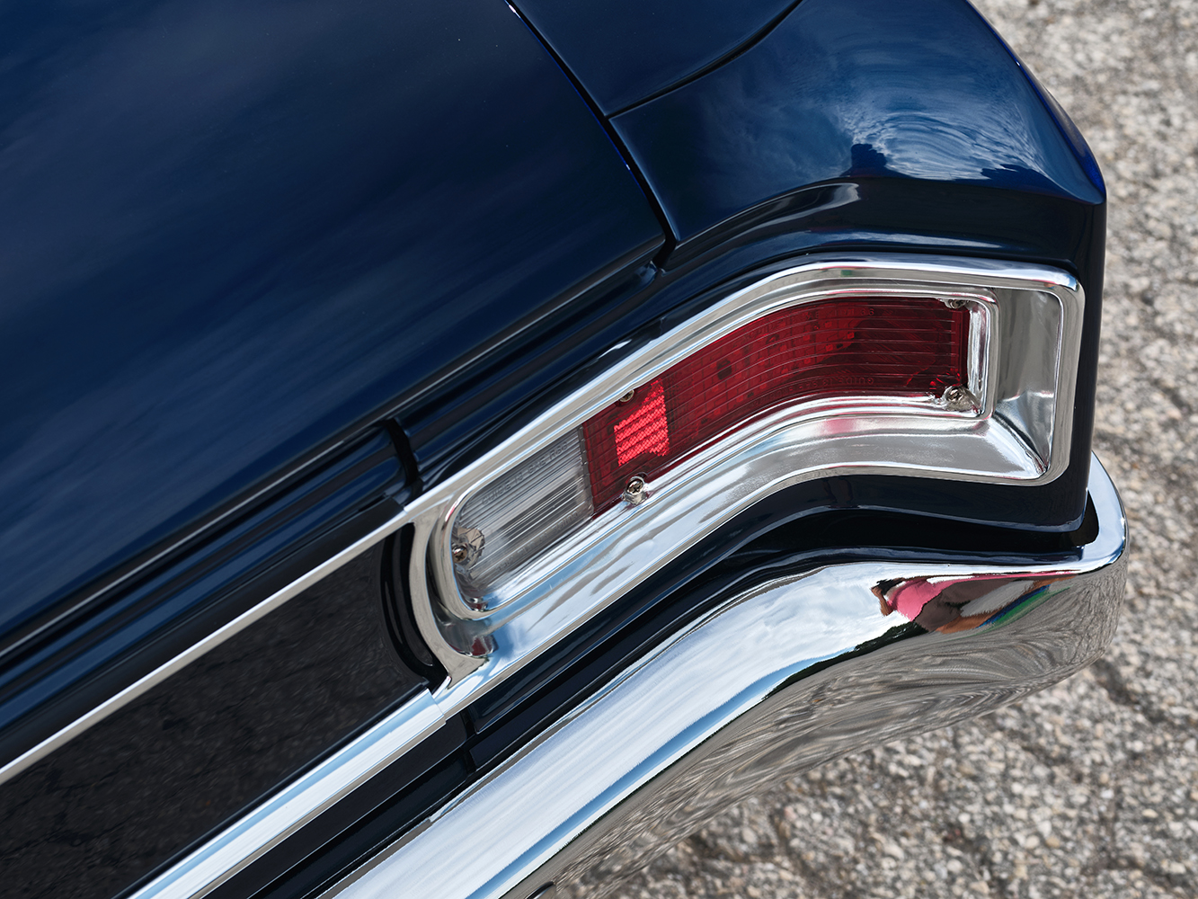 The Chevelle’s exterior is finished in stunning PPG Custom Blue Metallic and Pearl paint. Subtle upgrades enhance the car’s visual appeal while respecting its original DNA. Reproduction side mirrors and glass provide visual clarity while the Auto Metal Direct hood and Resto World grille and bumpers add fresh touches to the classic lines.