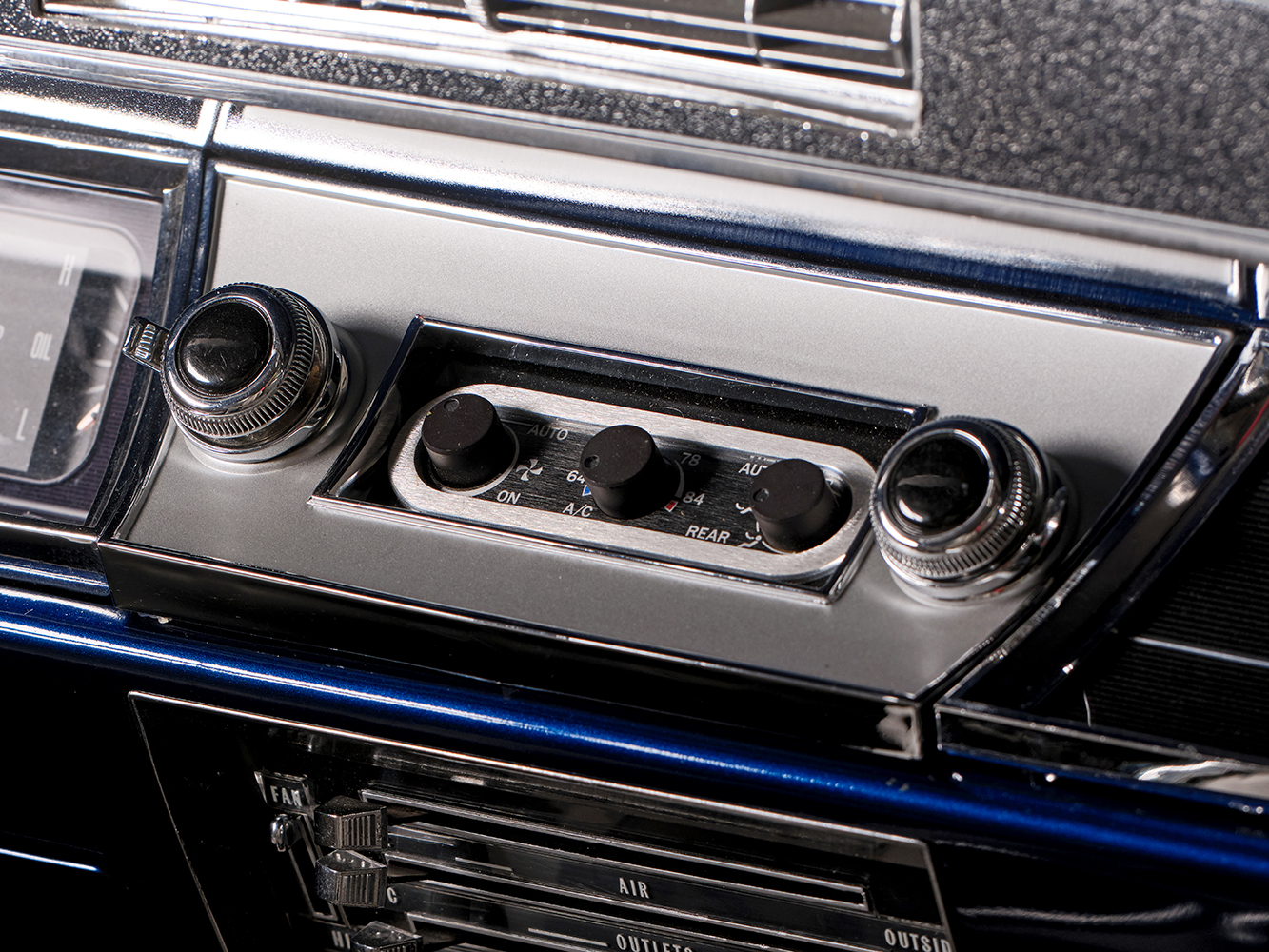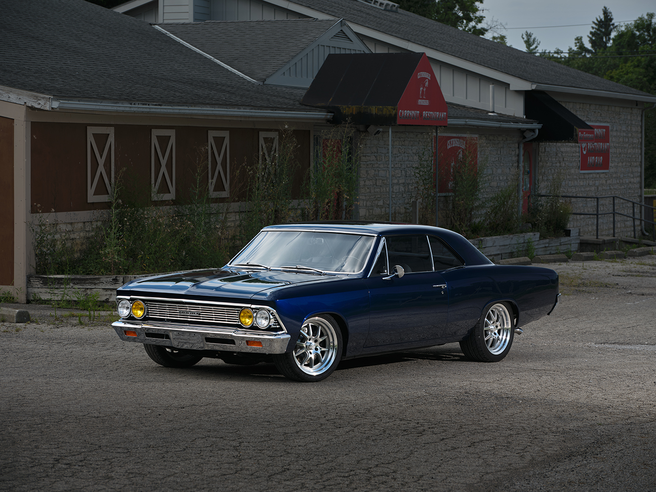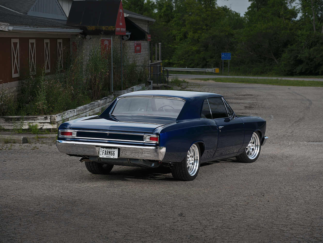 The Chevelle’s exterior is finished in stunning PPG Custom Blue Metallic and Pearl paint. Subtle upgrades enhance the car’s visual appeal while respecting its original DNA. Reproduction side mirrors and glass provide visual clarity while the Auto Metal Direct hood and Resto World grille and bumpers add fresh touches to the classic lines.