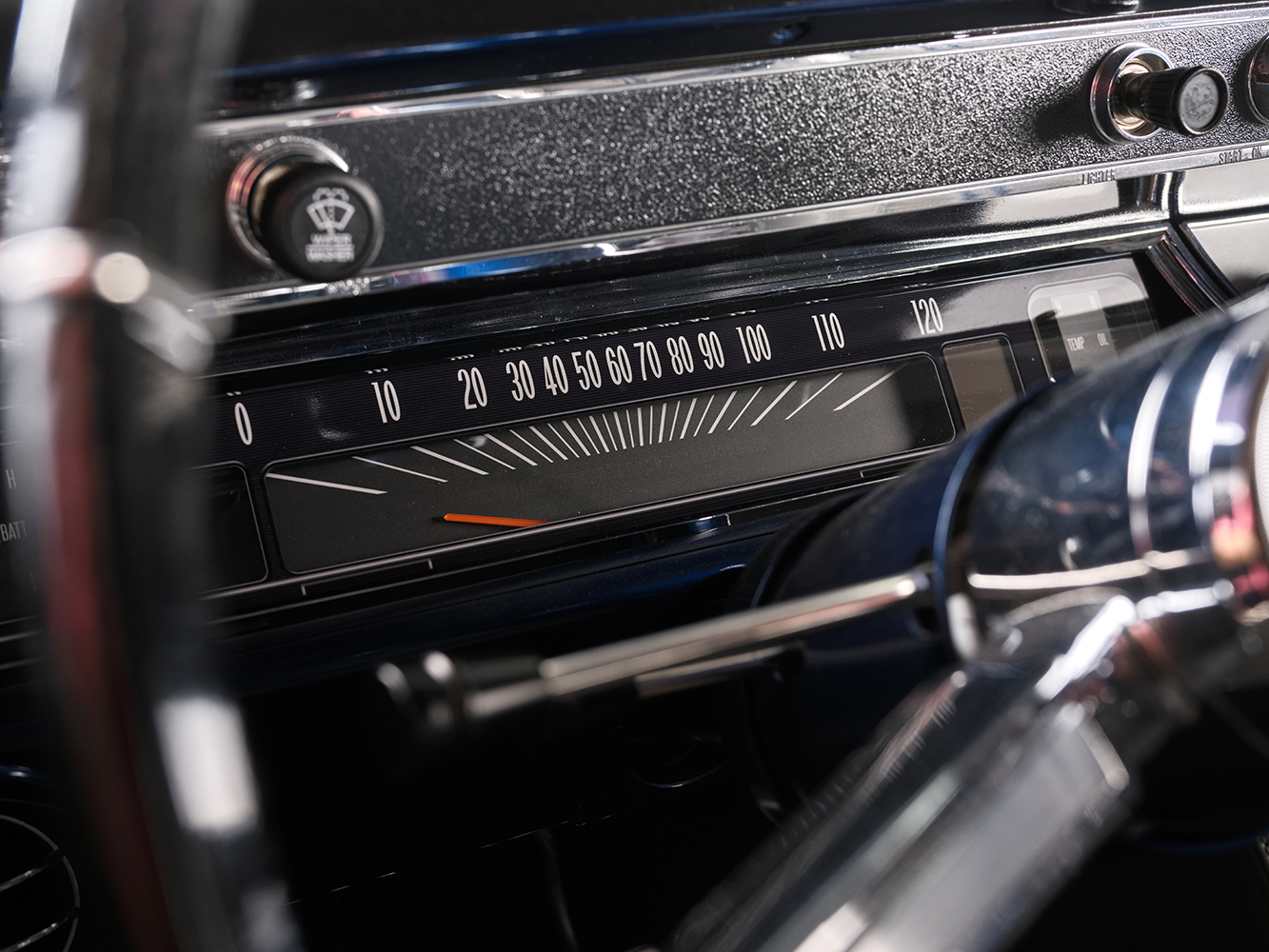 Inside, Mark and his wife, Jen, took on the interior installation by utilizing TMI Dark Gray upholstery, which pairs with black carpeting to create a clean, understated aesthetic. The factory dash was retained and integrates modern Dakota Digital RTX gauges for enhanced functionality.