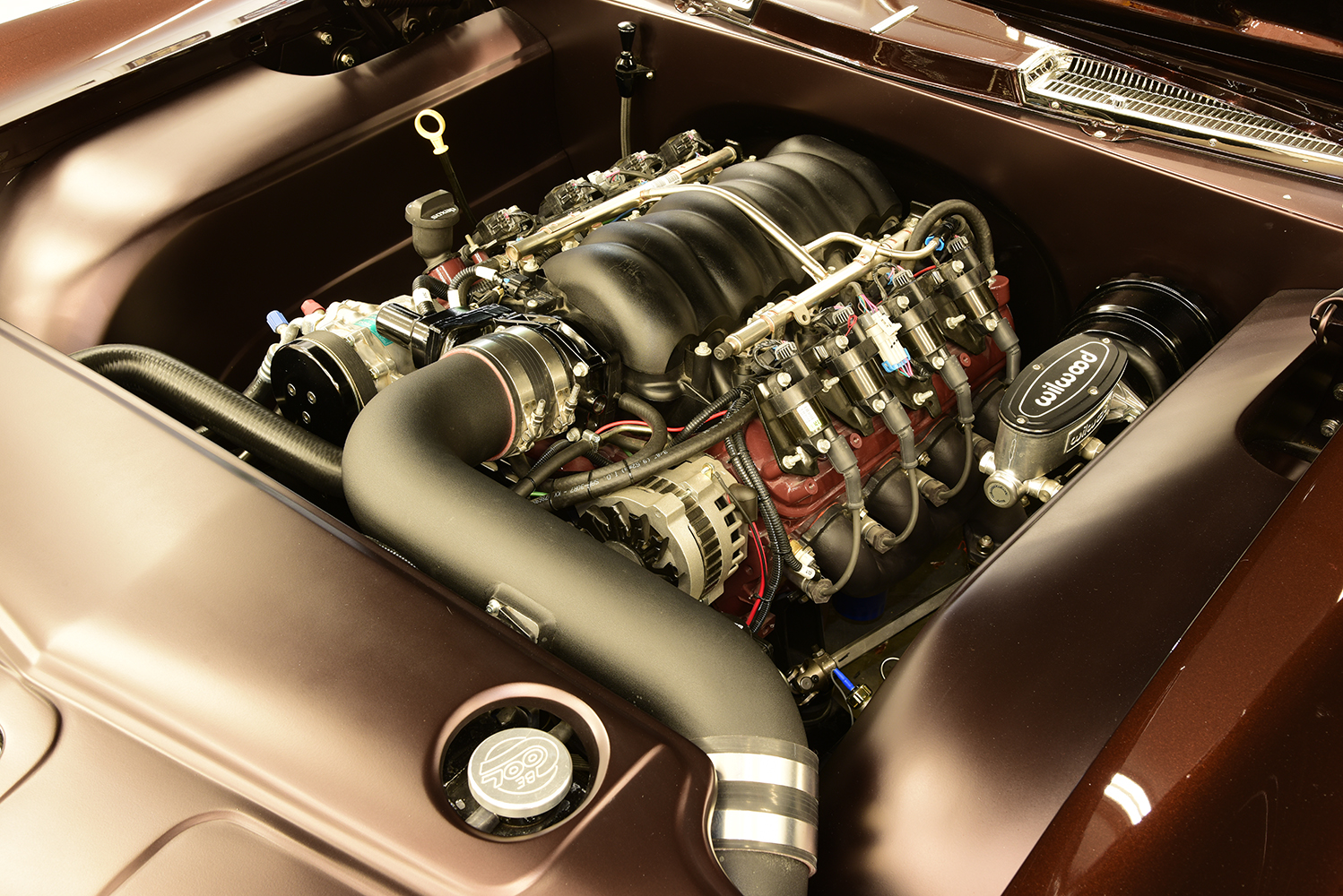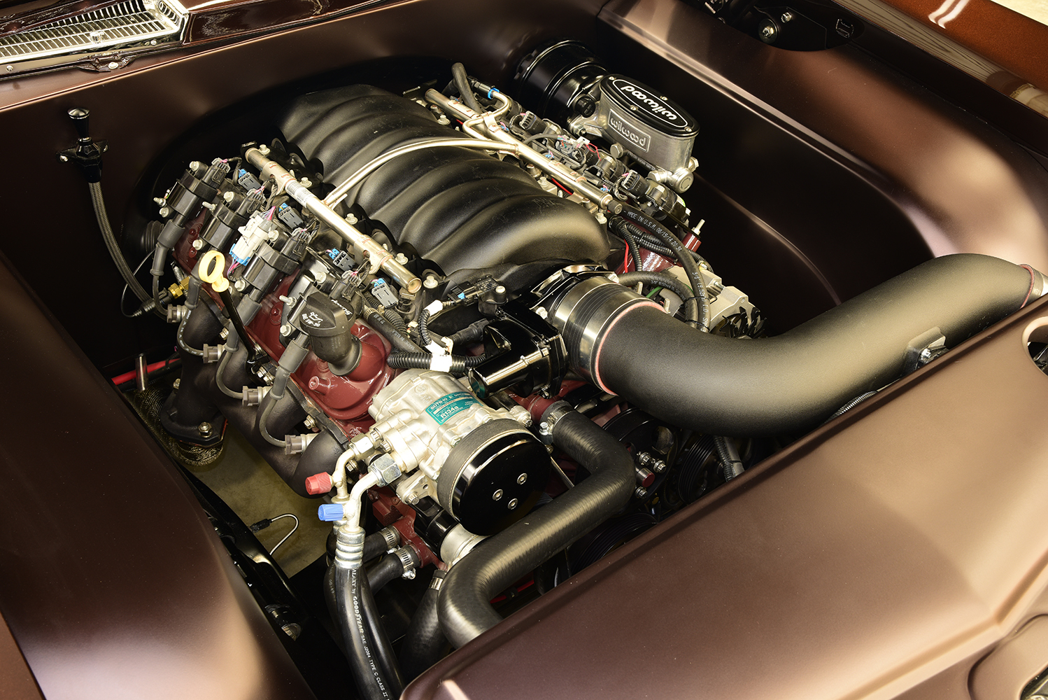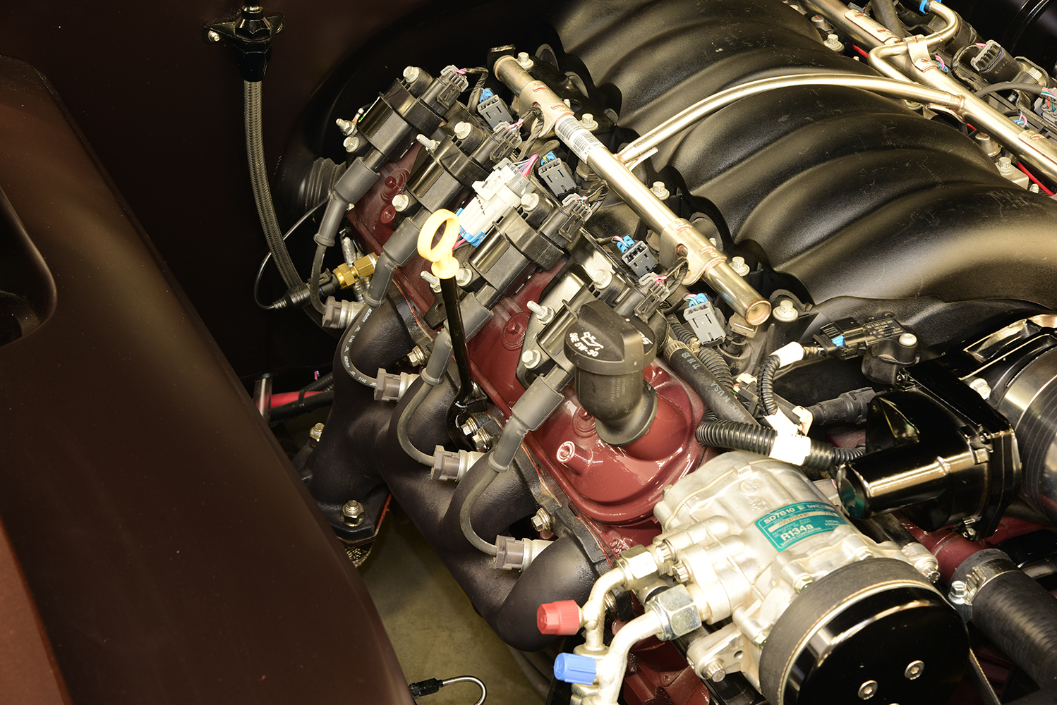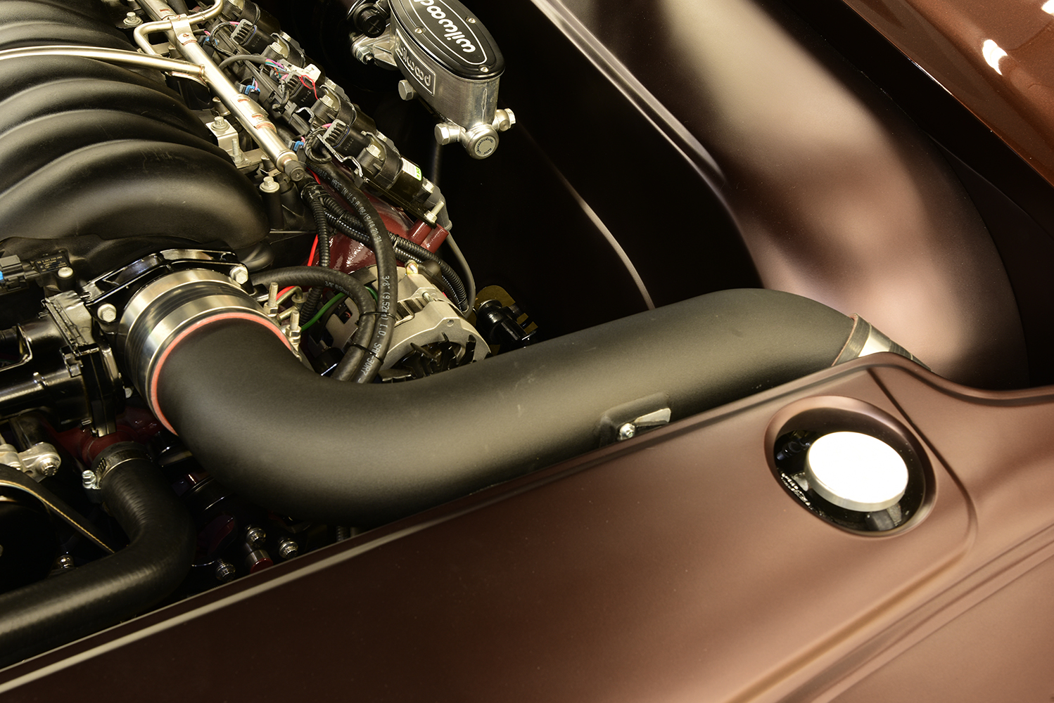 On top, a factory intake, throttle body, and injectors complete the setup, all controlled by GM electronics. A Vintage Air Front Runner drive system and a custom cold air intake by ECHRG finish the look. A stock ignition ignites the engine, with exhaust flowing through factory headers to a custom 2-1/2-inch stainless exhaust featuring Flowmaster Super 50-Series mufflers by ECHRG. To handle the power, a Gearstar Stage III GM 4L65-E transmission and all related GM electronics were paired with a custom driveshaft.