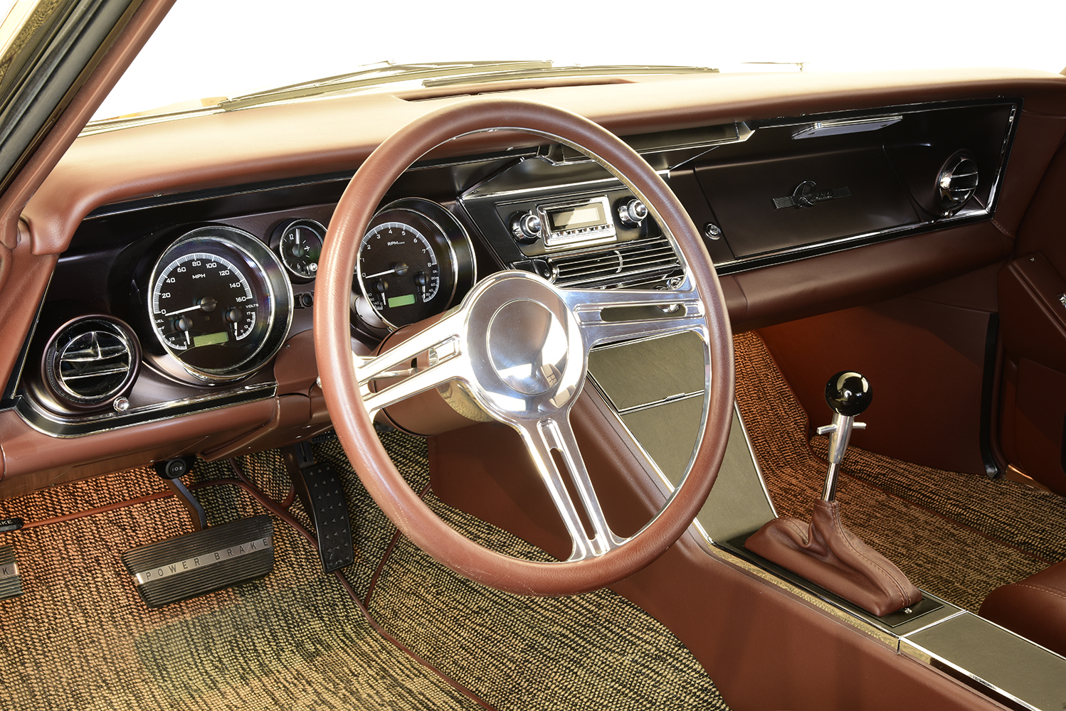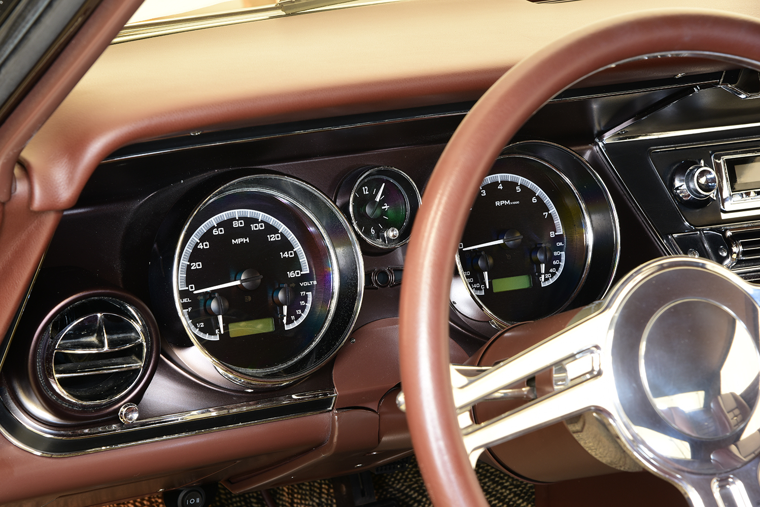 When it came to the interior, it was time to restore and introduce a newfound sophistication to the experience. The factory dash and console were meticulously restored and upholstered in chocolate brown leather from Moore & Giles. New VHX-Series dials from Dakota Digital monitored essential functions. A Billet Specialties BLVD 03-Series wheel navigates through a Flaming River tilt column while shifts engage through a Lokar stick, and Vintage Air keeps the cabin comfortable. Everything comes together through a custom wiring system crafted by team member Henry Stewart.