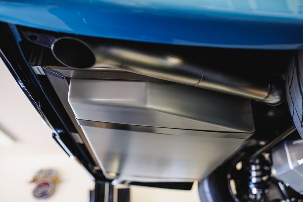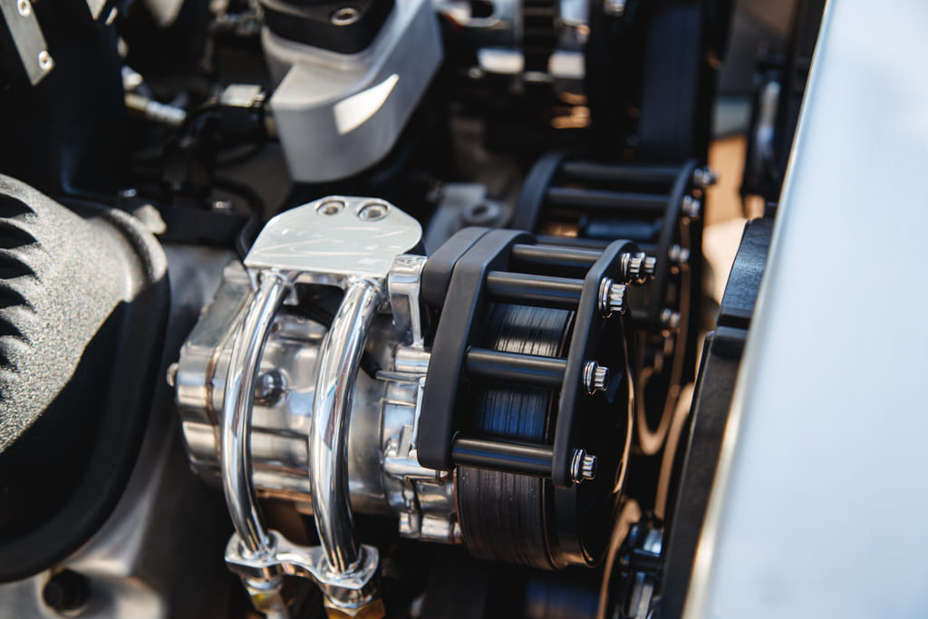 The heart’of the beast—the engine—became a symphony of power and precision that transcends the ordinary. Set on a 502ci Chevy big-block, John’s vision extends beyond the confines of ordinary crate engines. Enlisting the expertise of legendary race engine builders at Ryan Falconer Racing Engines, located just a town over in Chino Valley, Arizona, injected a new life into the big-block. Adorned with bespoke billet components, a mock-Hilborn setup powered by a covert MoTeC M800 ECU, and an exquisitely modified Billet Specialties serpentine drive system, the engine is a melodic work of art in itself. The intricate details extend to a breathtaking set of headers and a complete exhaust system, a testament to Matt Tomb’s artistry.