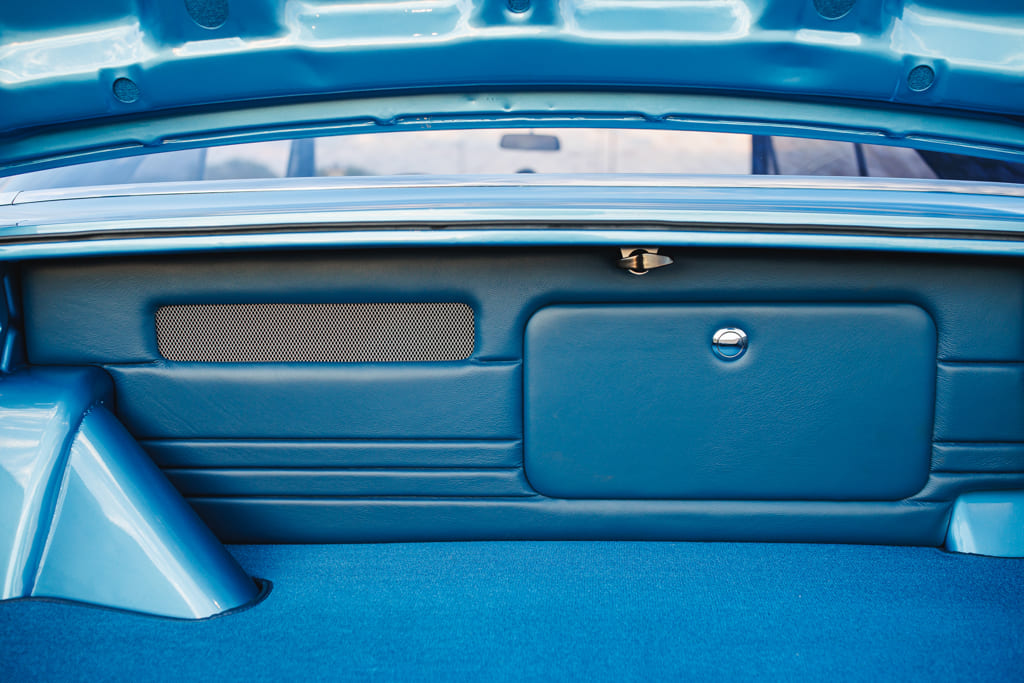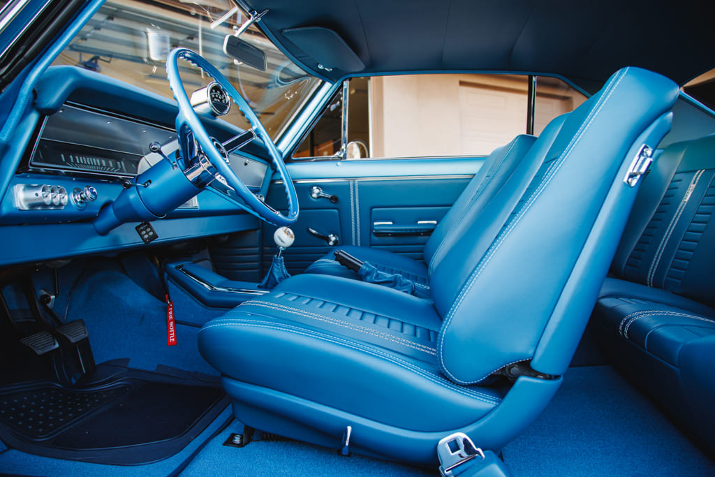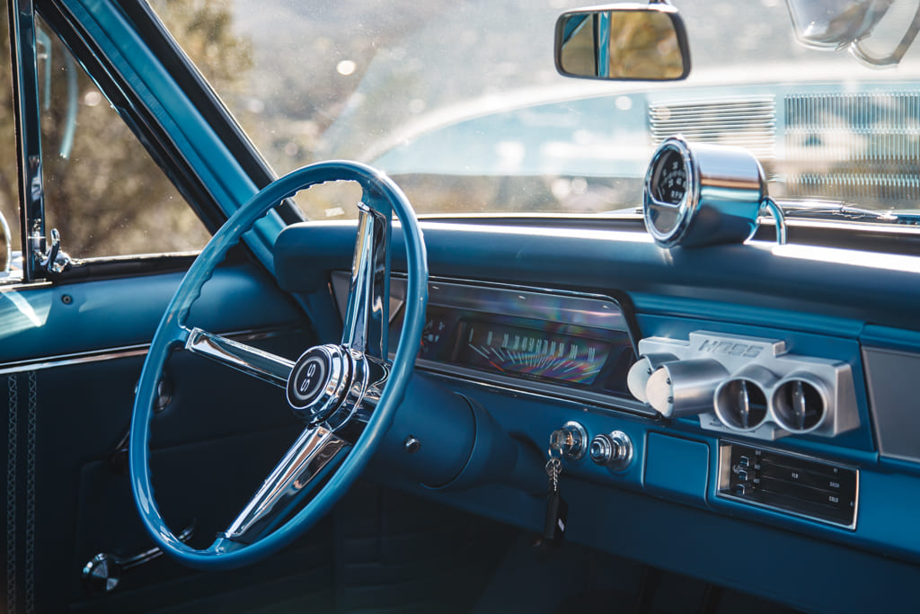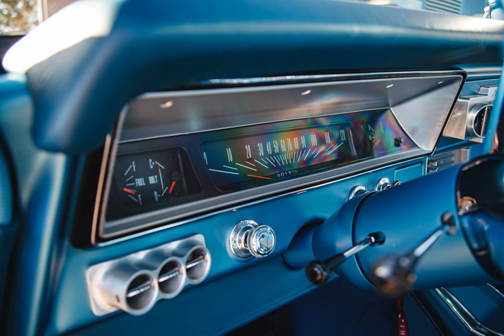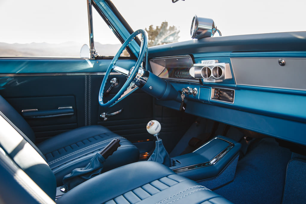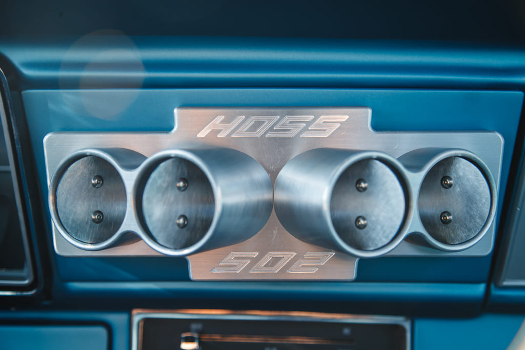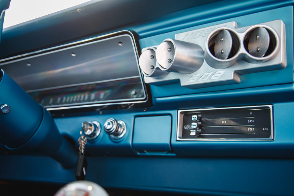 For all the concealed wonders beneath the hood, the marina blue-clad exterior beckons attention—a siren’s call in the vast ocean of automotive aesthetics. Opting for a more strategic choice, John’s decision to embrace the traditional tire and Halibrand replica wheel ensemble gracefully complements the car without succumbing to the ephemeral constraints of contemporary trends. Transitioning from the depths beneath the hood to the celestial expanse under the roof unveils a blue-hued interior crafted by the skillful hands of Mark Lopez of Elegant Interiors in Upland, California. A timeless and luxurious style dominates the interior, interrupted only by custom billet aluminum air conditioning vents—a stunning detail created by the enigmatic Falconers, Erik and Ryan. This specialized creation pays homage to John’s confidant, the esteemed Hardy “Hoss” Allen, all while prompting the presence of the 502 beneath the hood.