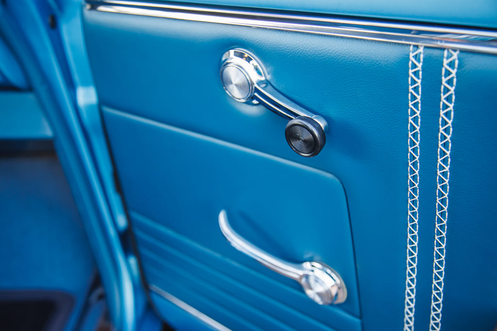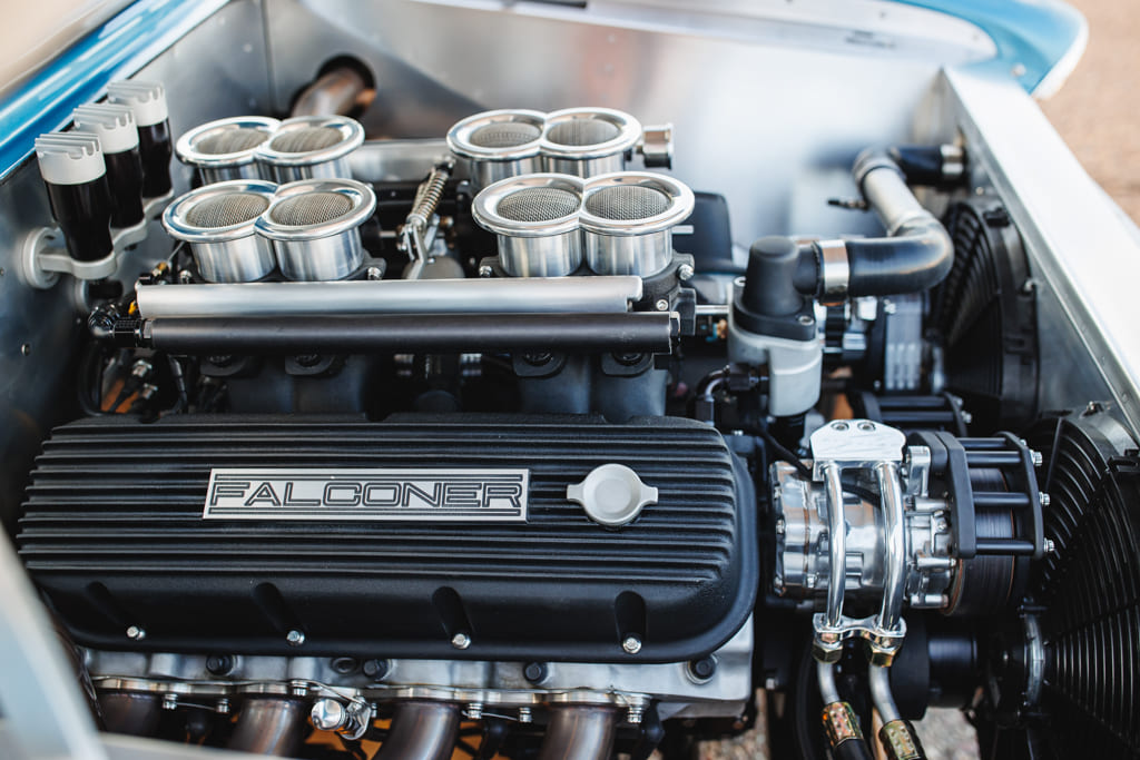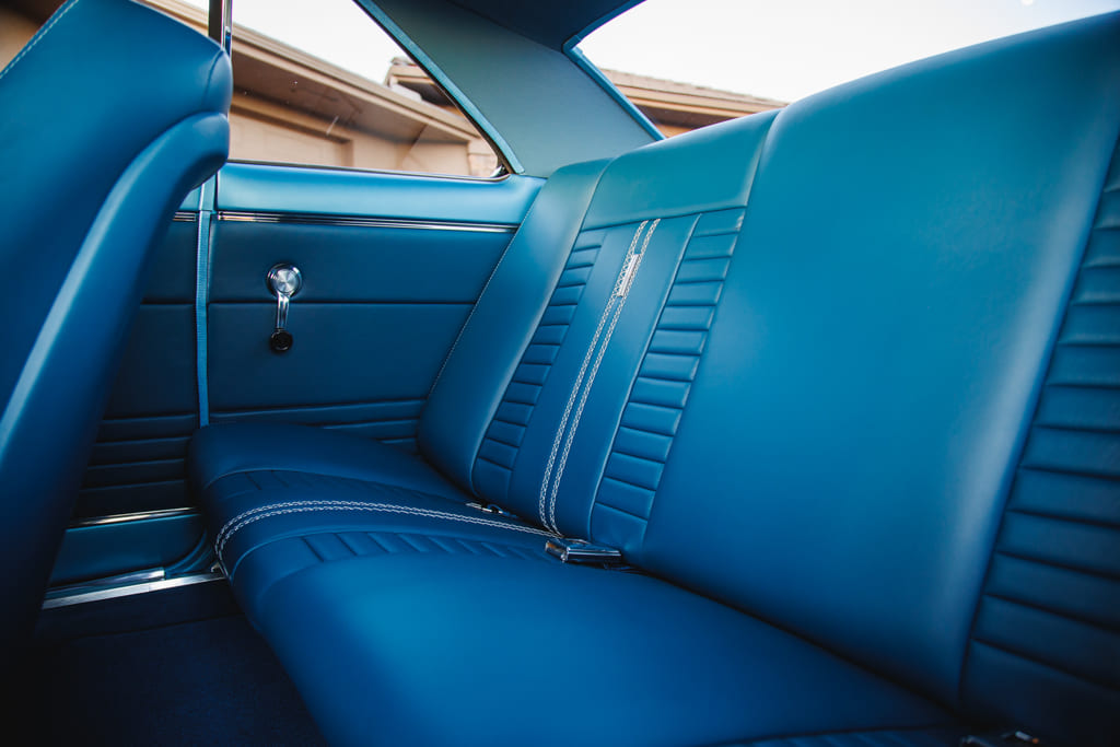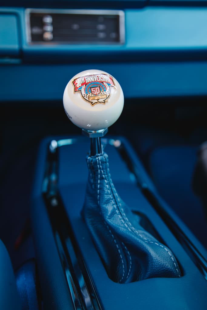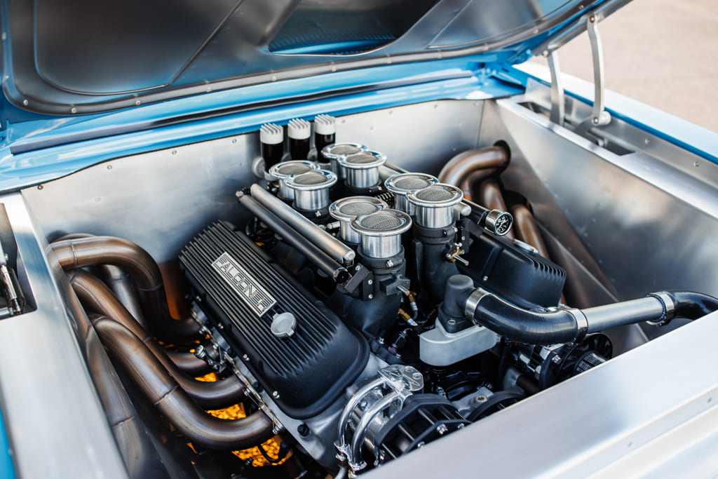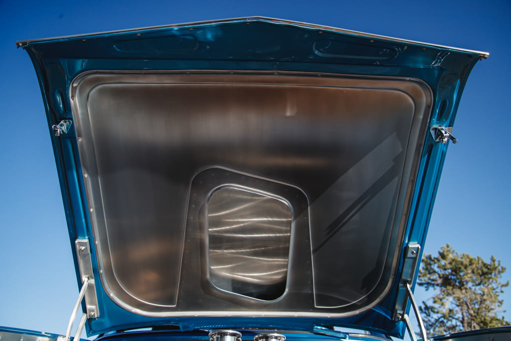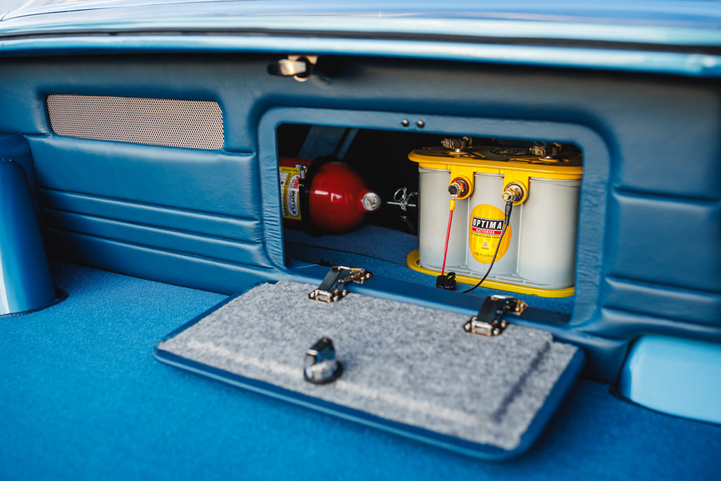 For all the concealed wonders beneath the hood, the marina blue-clad exterior beckons attention—a siren’s call in the vast ocean of automotive aesthetics. Opting for a more strategic choice, John’s decision to embrace the traditional tire and Halibrand replica wheel ensemble gracefully complements the car without succumbing to the ephemeral constraints of contemporary trends. Transitioning from the depths beneath the hood to the celestial expanse under the roof unveils a blue-hued interior crafted by the skillful hands of Mark Lopez of Elegant Interiors in Upland, California. A timeless and luxurious style dominates the interior, interrupted only by custom billet aluminum air conditioning vents—a stunning detail created by the enigmatic Falconers, Erik and Ryan. This specialized creation pays homage to John’s confidant, the esteemed Hardy “Hoss” Allen, all while prompting the presence of the 502 beneath the hood.
