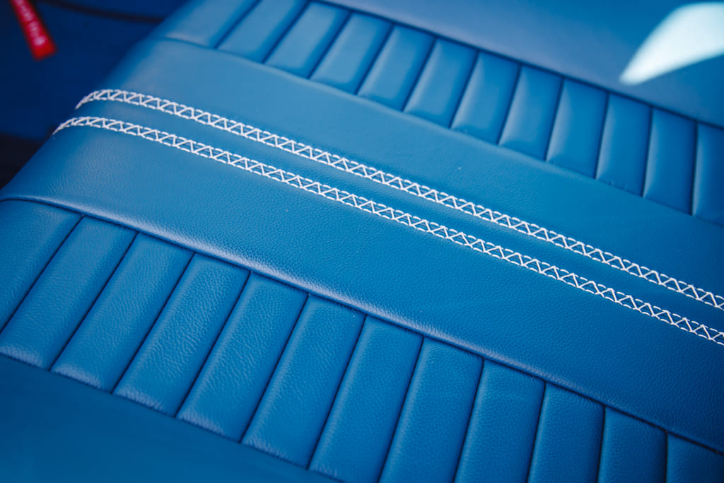 Upholstery: Blue leather with center white stripes in seats and door panels, custom stitching