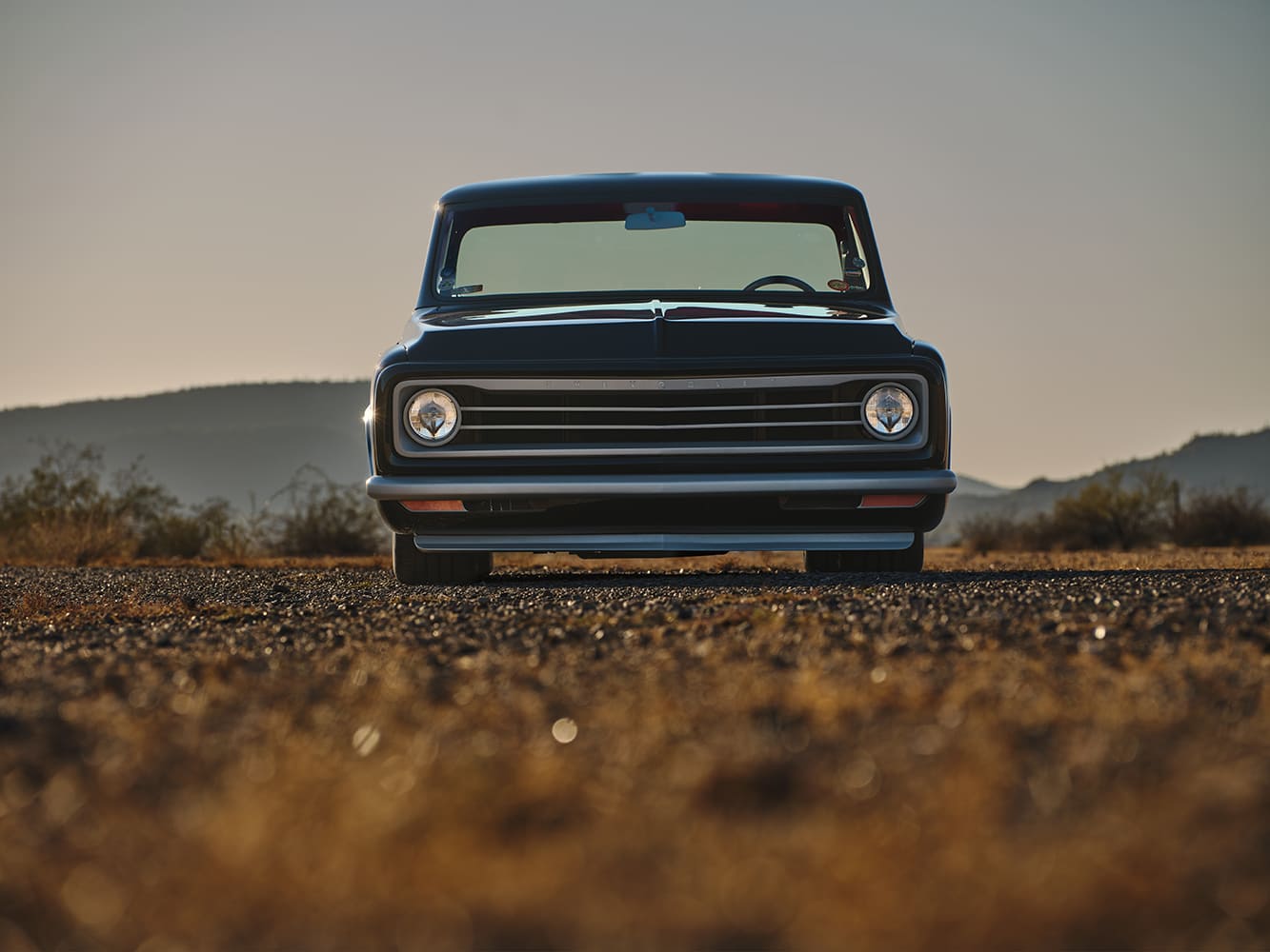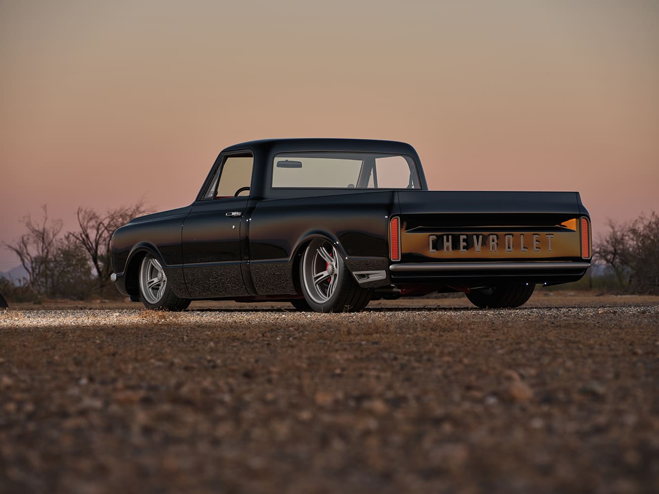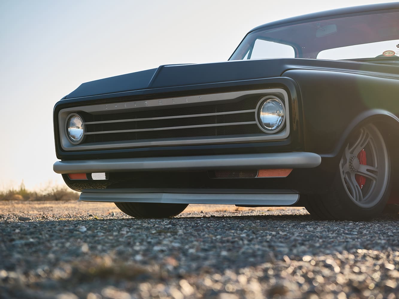 “When I asked Dean Livermore about the sheetmetal changes made to this 1972 Chevy C10, he chuckled and replied, ‘What wasn’t changed?’ The modifications start at the front with significant reconfigurations to the cowl and firewall. Everything from the dashboard forward has been custom made to ensure the cowl fits snugly at the back of the hood, allowing it to close properly while clearing the doors and fenders. The side markers have been filled and the entire grille area, including surrounds, is custom built with backlit Chevrolet emblems crafted from acrylic framed-in steel. Additionally, all turn signal indicators and buckets are 3-D-printed. The fender openings have undergone extensive alterations, as well. The top of the front wheel openings was lowered by ½ inch, while the front and rear edges were pulled closer together by 3 inches and dropped approximately 2 inches. This creates a more-aggressive look compared to the stock openings. The top of the cab was chopped by 3 inches, and the center crown was reduced by 2 inches, resulting in a flatter roof profile.