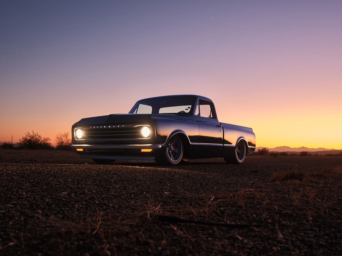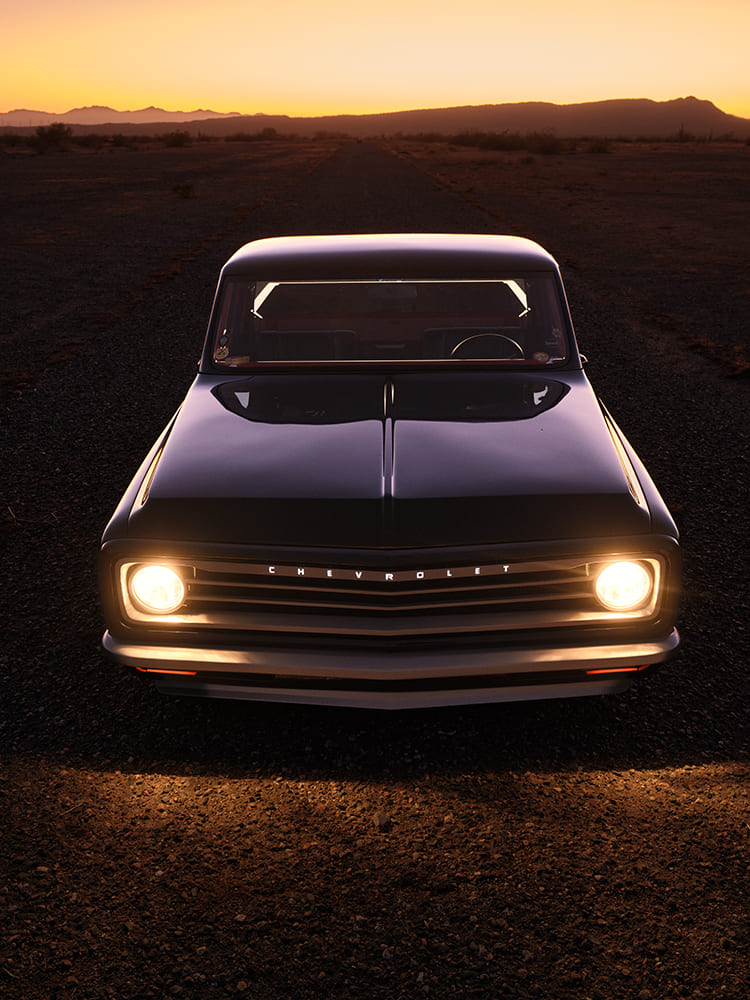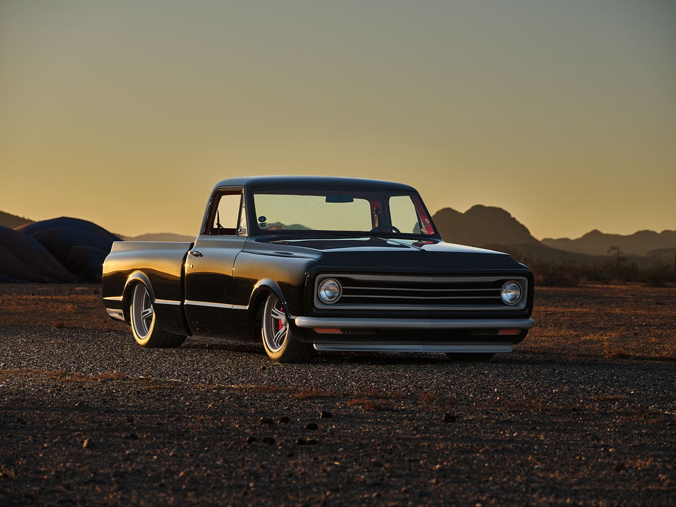 “When I asked Dean Livermore about the sheetmetal changes made to this 1972 Chevy C10, he chuckled and replied, ‘What wasn’t changed?’ The modifications start at the front with significant reconfigurations to the cowl and firewall. Everything from the dashboard forward has been custom made to ensure the cowl fits snugly at the back of the hood, allowing it to close properly while clearing the doors and fenders. The side markers have been filled and the entire grille area, including surrounds, is custom built with backlit Chevrolet emblems crafted from acrylic framed-in steel. Additionally, all turn signal indicators and buckets are 3-D-printed. The fender openings have undergone extensive alterations, as well. The top of the front wheel openings was lowered by ½ inch, while the front and rear edges were pulled closer together by 3 inches and dropped approximately 2 inches. This creates a more-aggressive look compared to the stock openings. The top of the cab was chopped by 3 inches, and the center crown was reduced by 2 inches, resulting in a flatter roof profile.