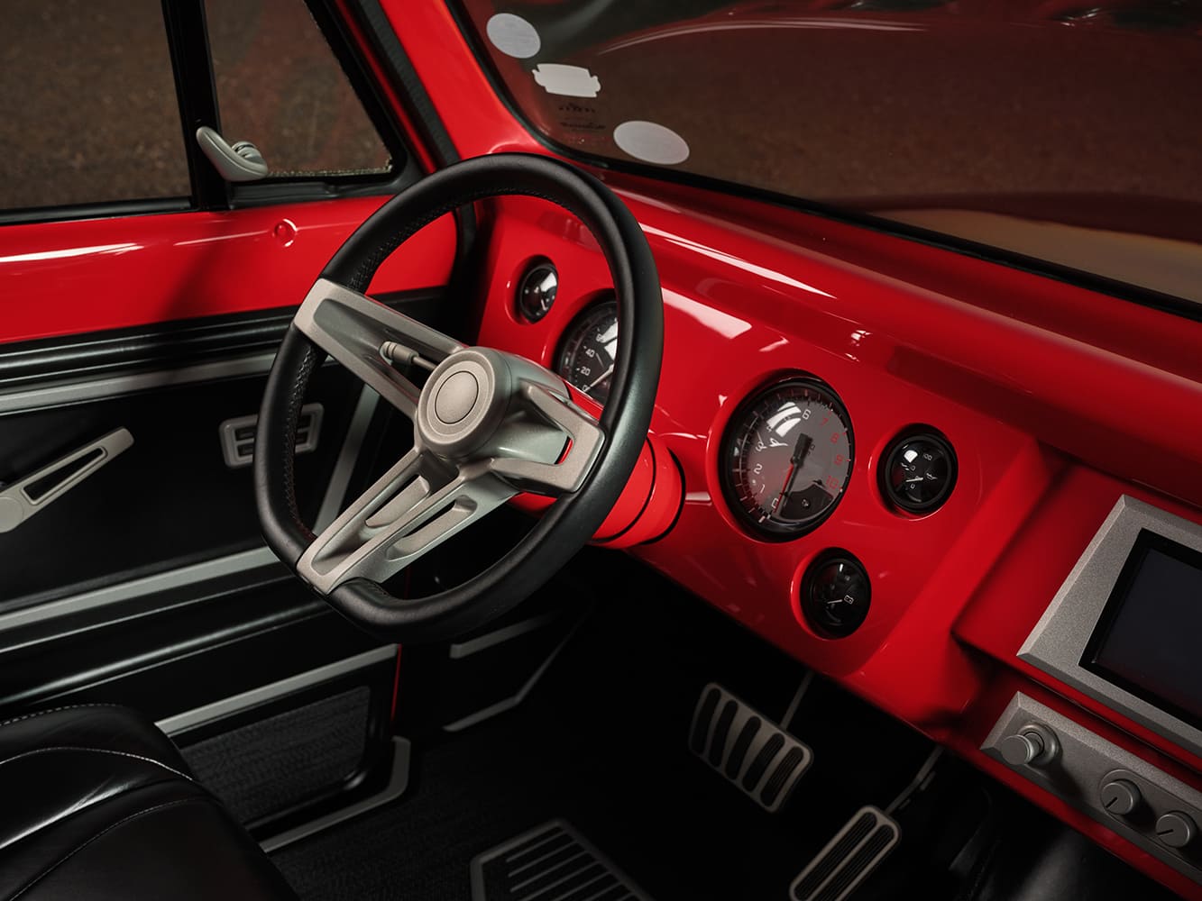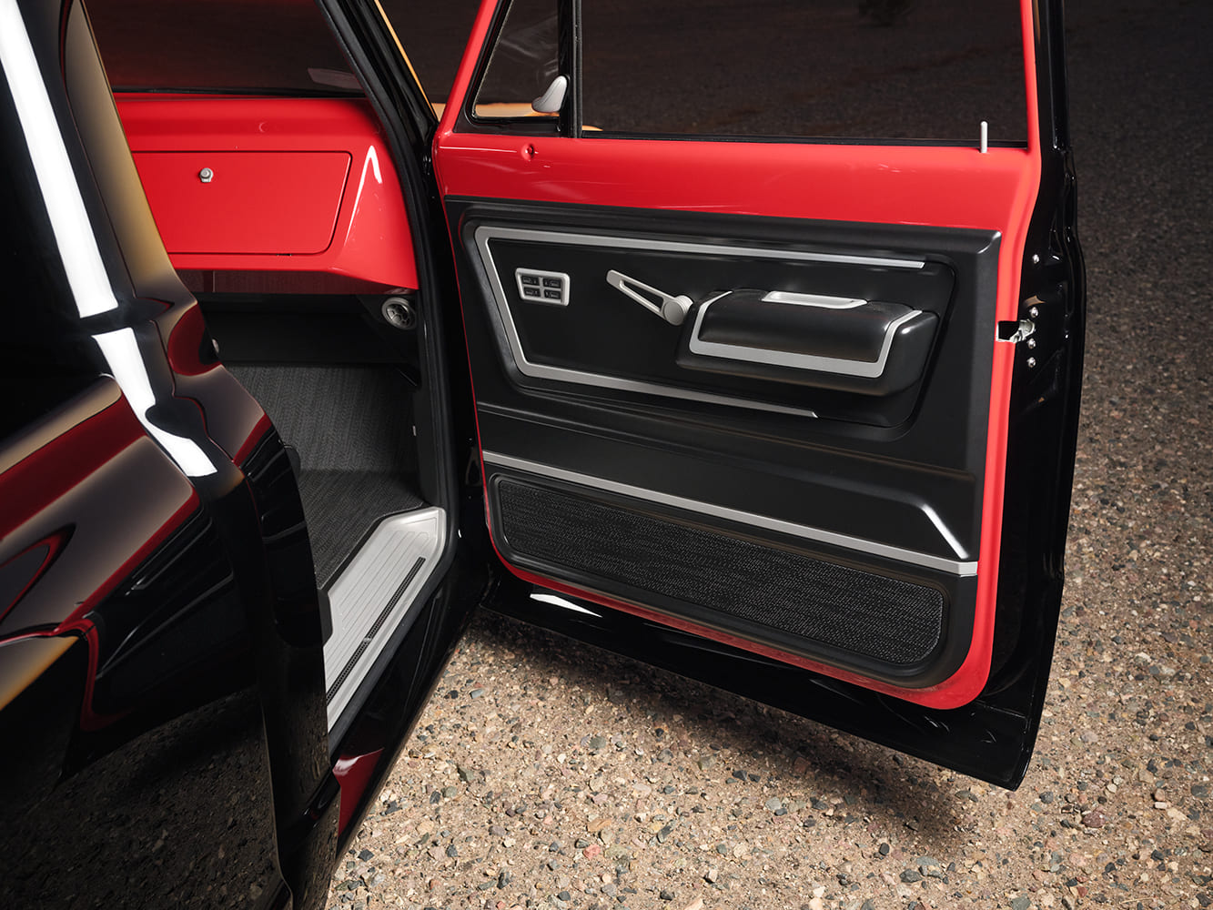 “A quick glance at the truck profile reveals a seamless, stock-like appearance. The factory windwings are intact, the A-pillars retain their upright position, and the front and rear glass are flush-mounted. The windows are now powered, replacing the original hand-crank operation. The body is painted in sleek PPG black with eye-catching red accents, and an impressive 800 hours were dedicated to painting, cutting, and buffing, not including the bodywork. All bumpers and trim are custom made, with gray trim treated with Cerakote at Hot Rods by Dean.