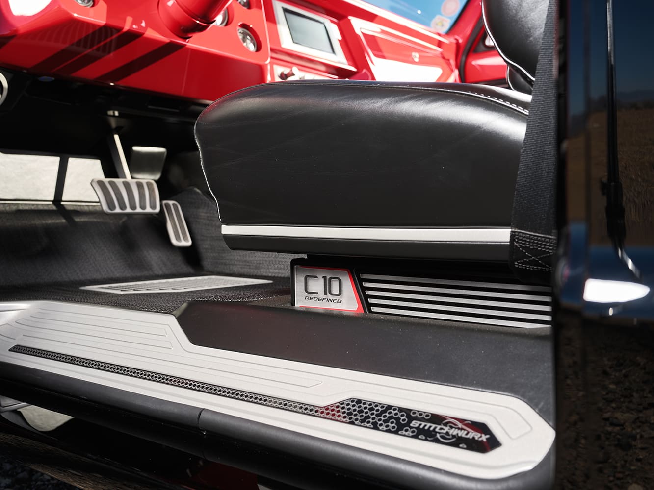 “Stitchwurx contributed by utilizing 3-D printing for all internal panels. These panels, routed out of a single block, are secured without screws—using magnets instead. The seating resembles a bench yet functions as individual bucket seats, featuring a center armrest that converts into a console. The interior (including the armrest/console) is finished in red leather with black and gray accents. An Ididit steering column is paired with a SPARC steering wheel featuring a flat bottom for added leg clearance. Above the wheel, the driver gazes at a full set of Classic Instruments AutoCross Series gauges, providing essential information.”