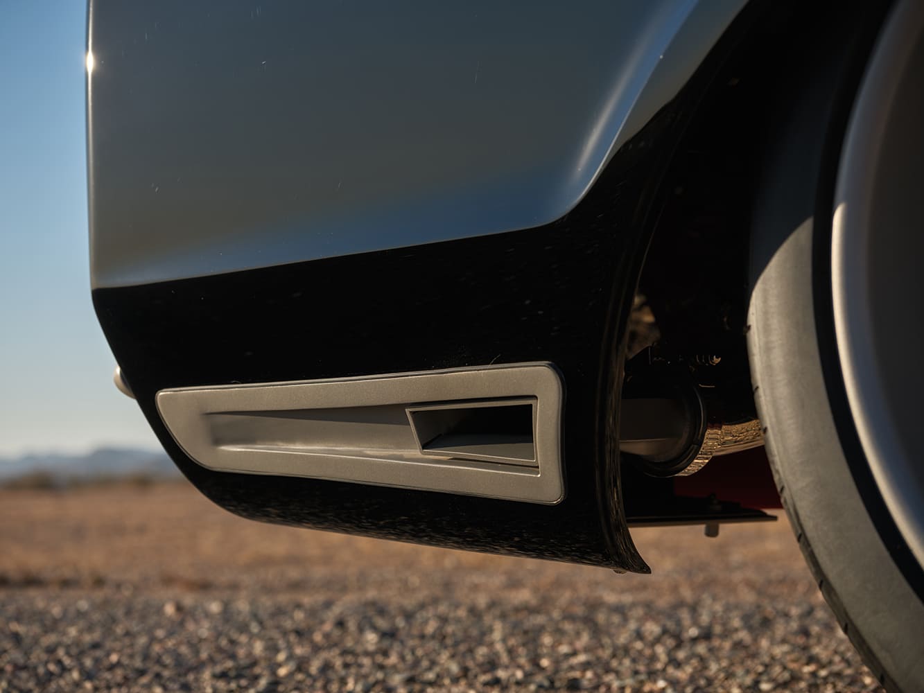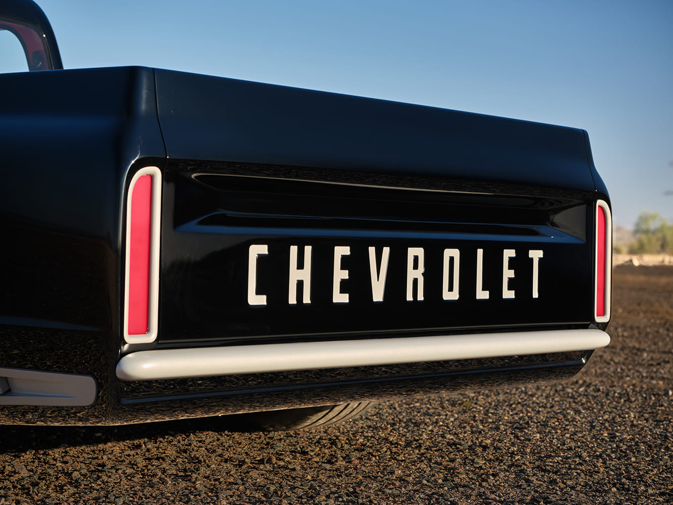 “On the bed, side markers were removed and filled, with reshaped wheel openings mirroring the front modifications. The tailgate features a ‘soft open’ mechanism, akin to modern trucks, with the latch relocated inside for a cleaner exterior. Despite tailgate access panels for its inner components, most of the tailgate’s sheetmetal remains stock. The custom taillights, crafted from scratch, integrate 3-D printing and LED lighting.