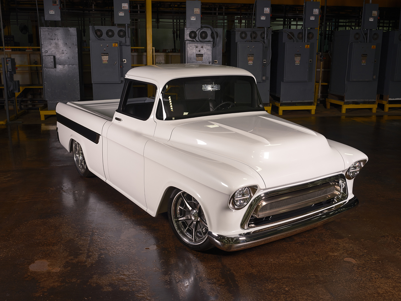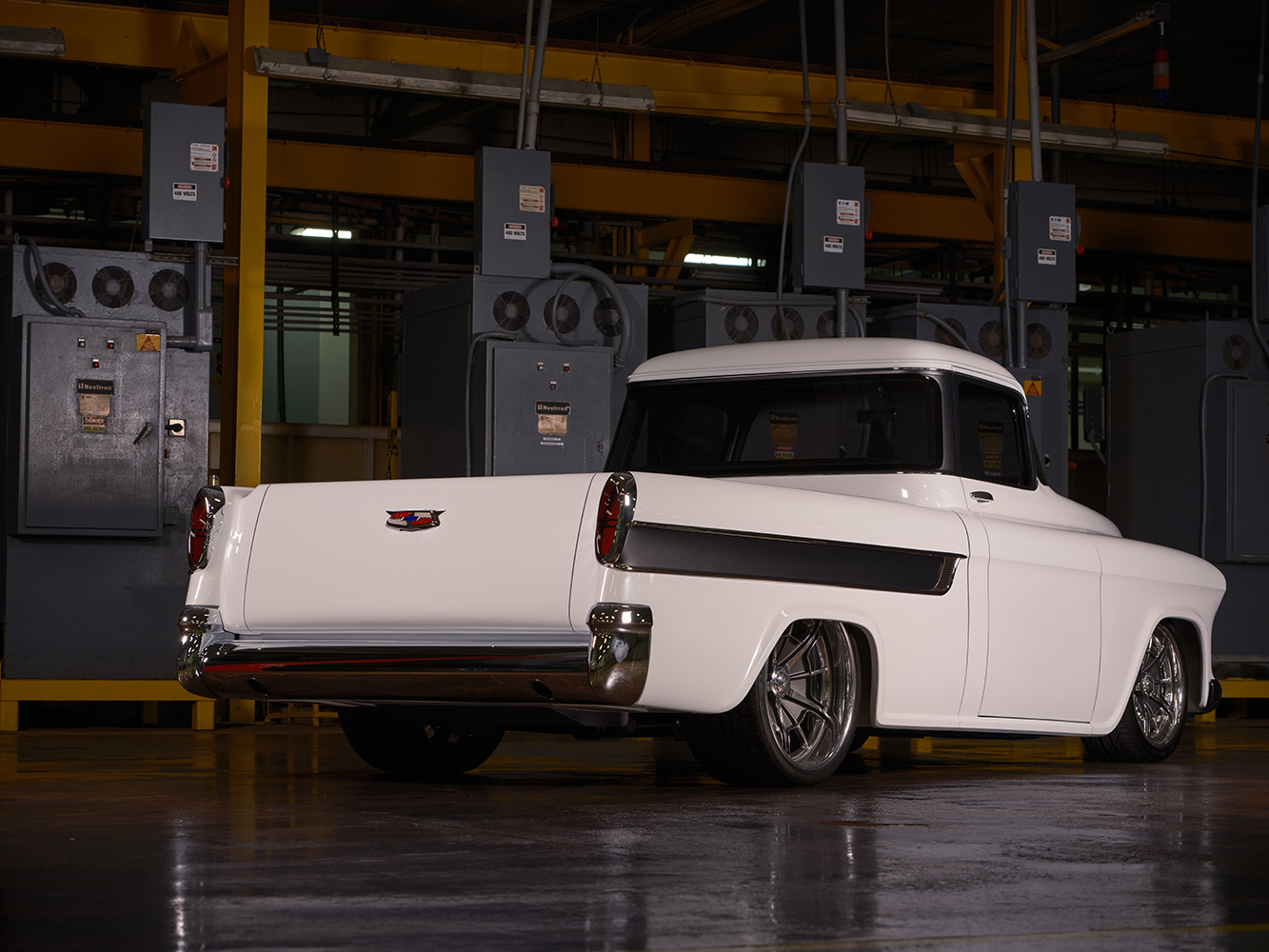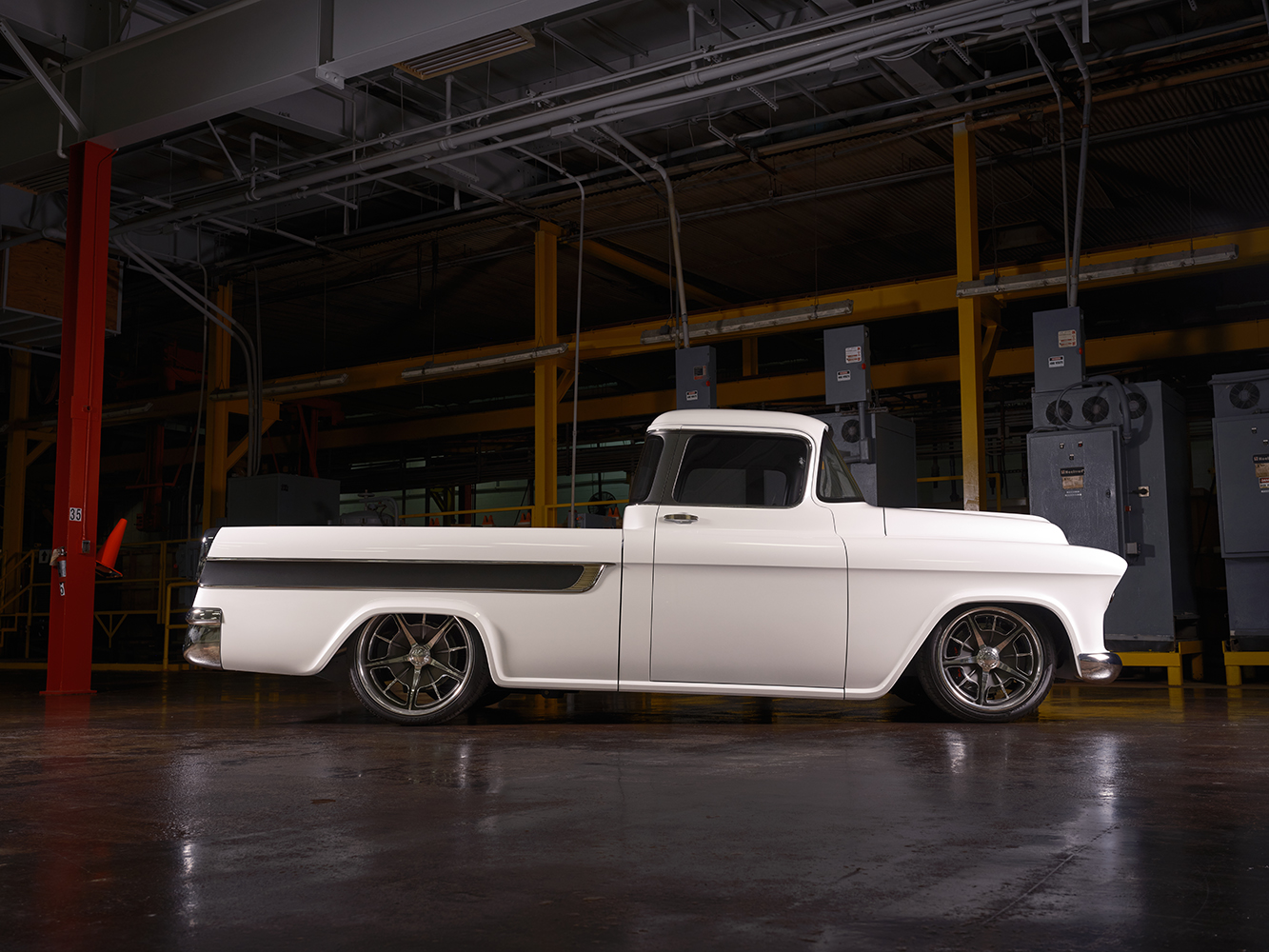 This, obviously, is where Jason Graham’s skills and visions factor into the story, and by 2020 he’d taken on Mark’s special project. First order of business was to de-sweet-meat the truck (i.e., convert from Pro Street to street cruiser) with a Roadster Shop Fast Track 1955-59 chassis (Baer brakes, RS SV Fox coilovers, 9-inch, and so on), ultimately hot rod stanced (not to mention fitted with a belly pan) with 19- and 22-inch Schott Split Windows and powered by an LT5 (custom shrouded in one of the cleanest Task Force engine bays I’ve ever seen) with a Bowler 4L80E.