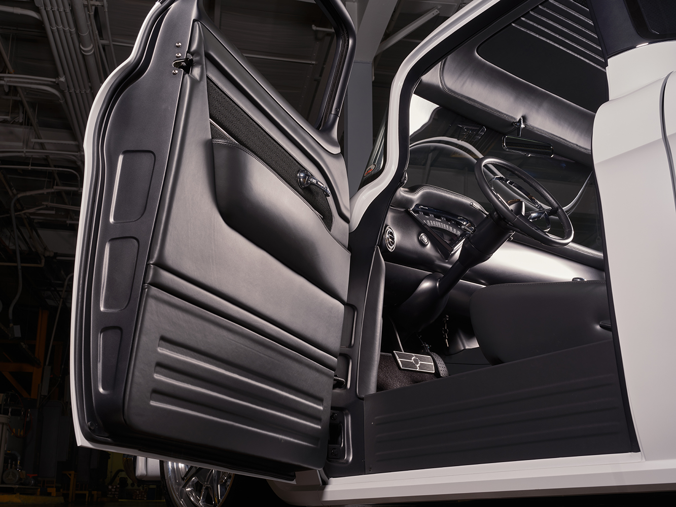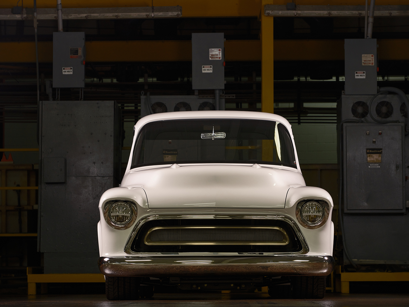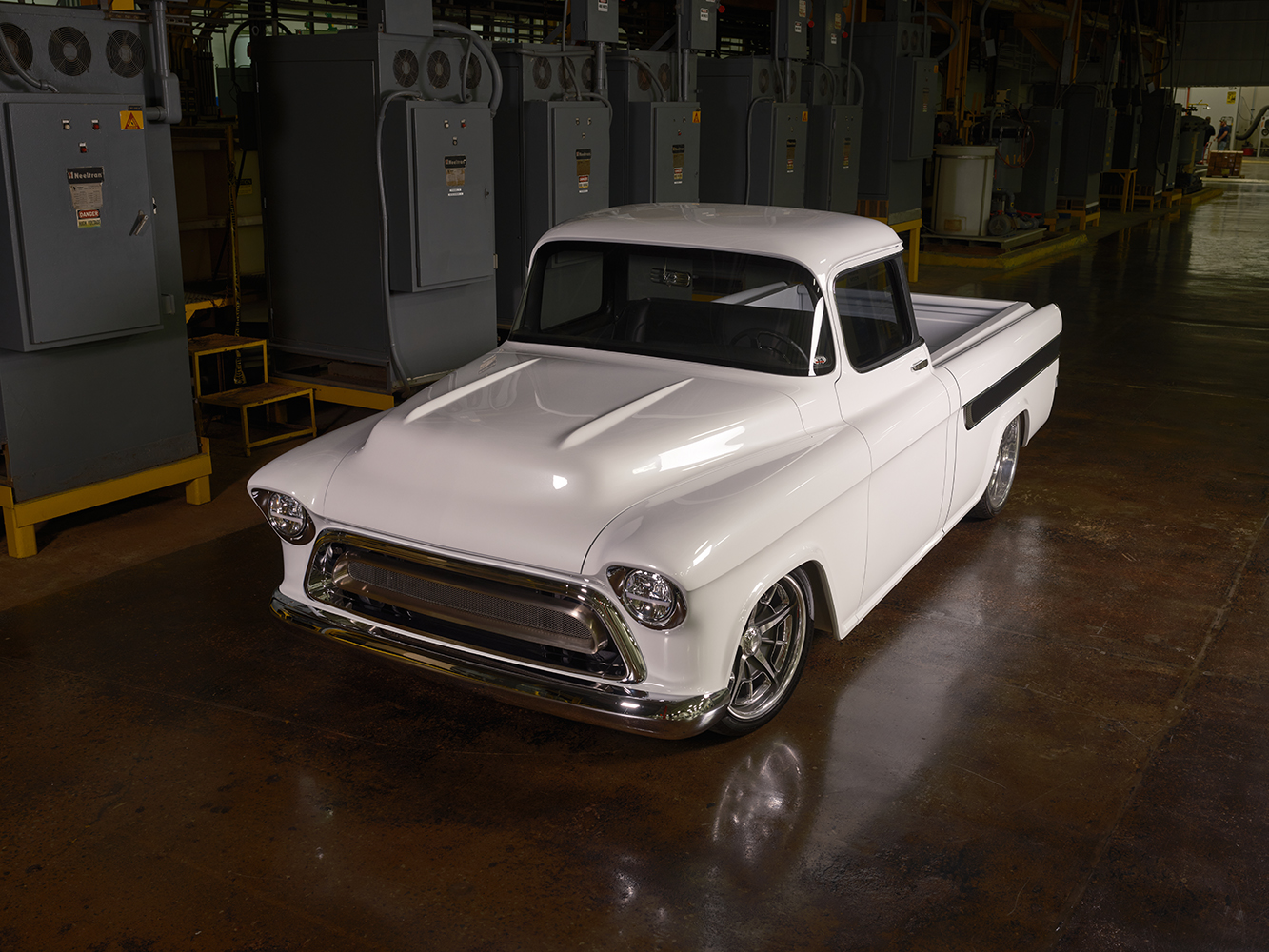 This, obviously, is where Jason Graham’s skills and visions factor into the story, and by 2020 he’d taken on Mark’s special project. First order of business was to de-sweet-meat the truck (i.e., convert from Pro Street to street cruiser) with a Roadster Shop Fast Track 1955-59 chassis (Baer brakes, RS SV Fox coilovers, 9-inch, and so on), ultimately hot rod stanced (not to mention fitted with a belly pan) with 19- and 22-inch Schott Split Windows and powered by an LT5 (custom shrouded in one of the cleanest Task Force engine bays I’ve ever seen) with a Bowler 4L80E.