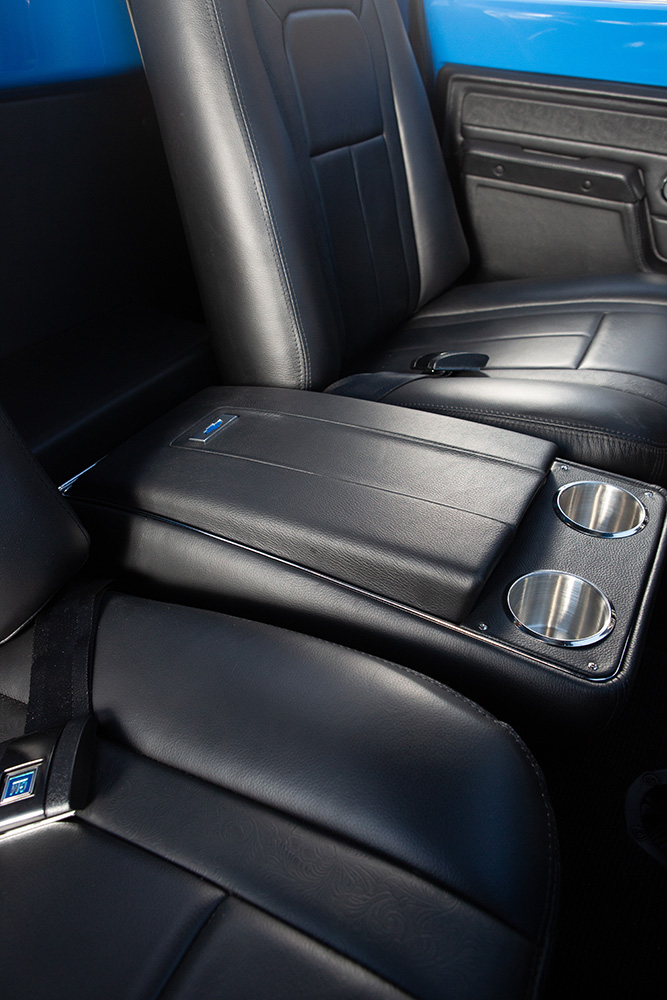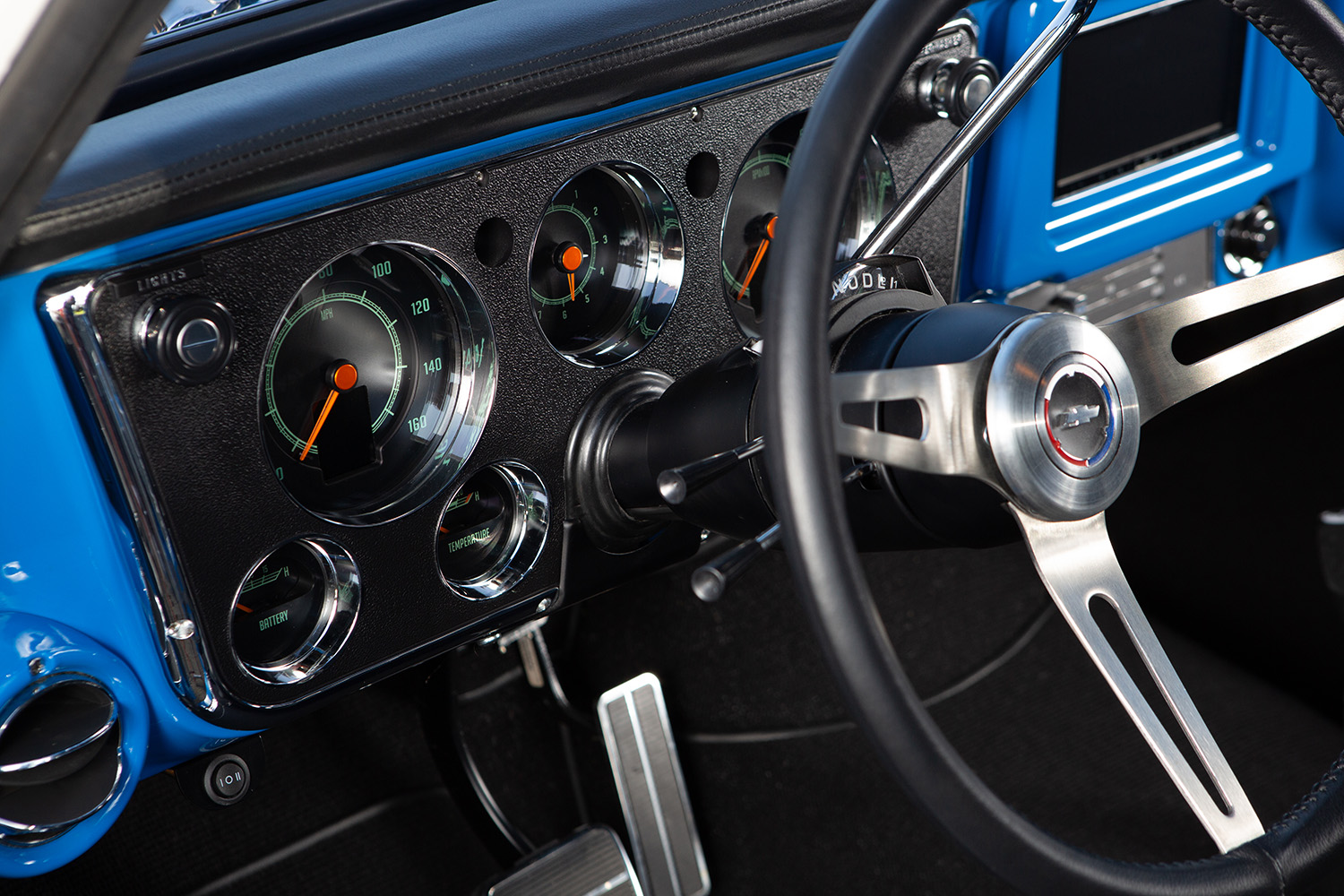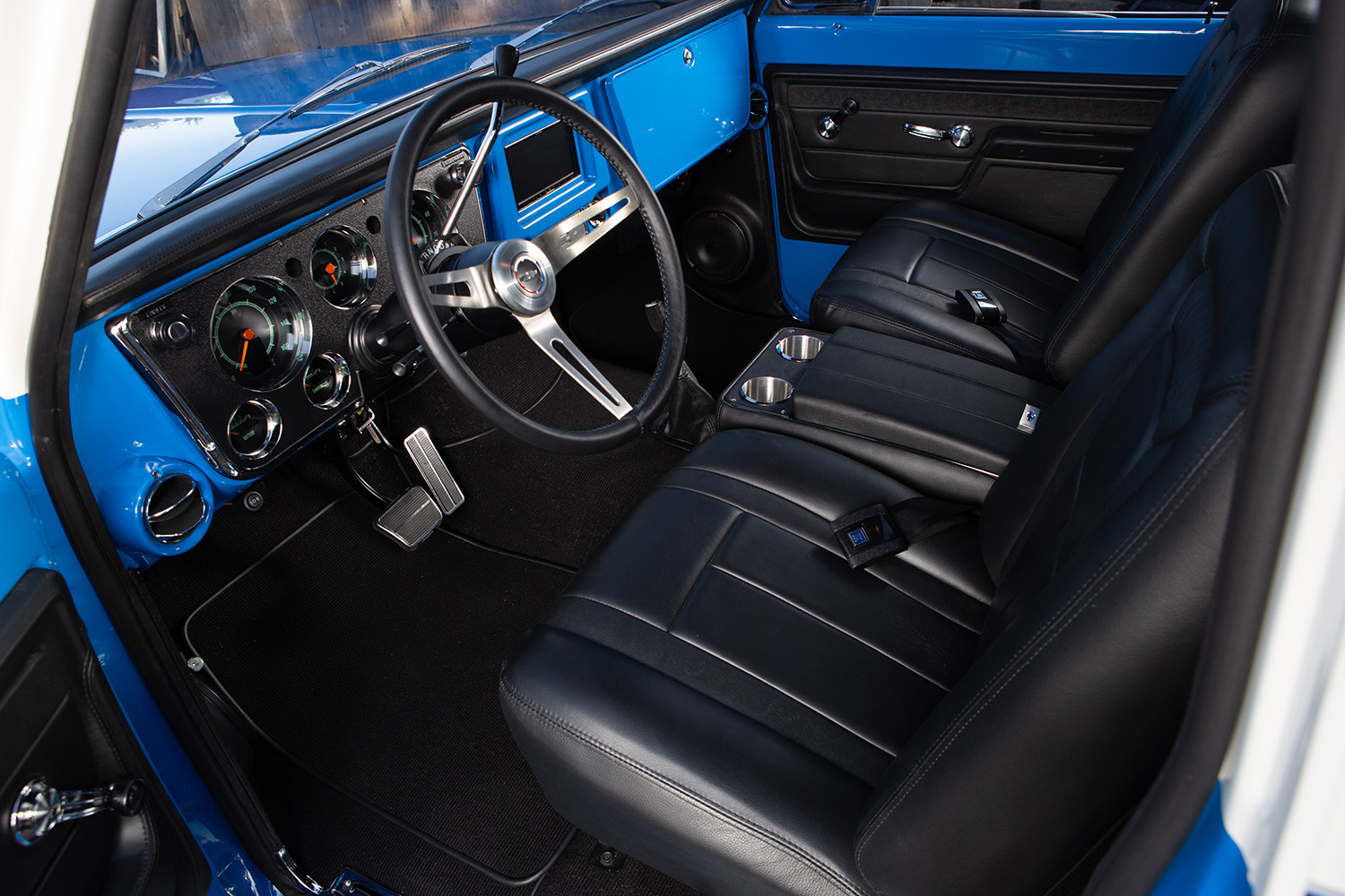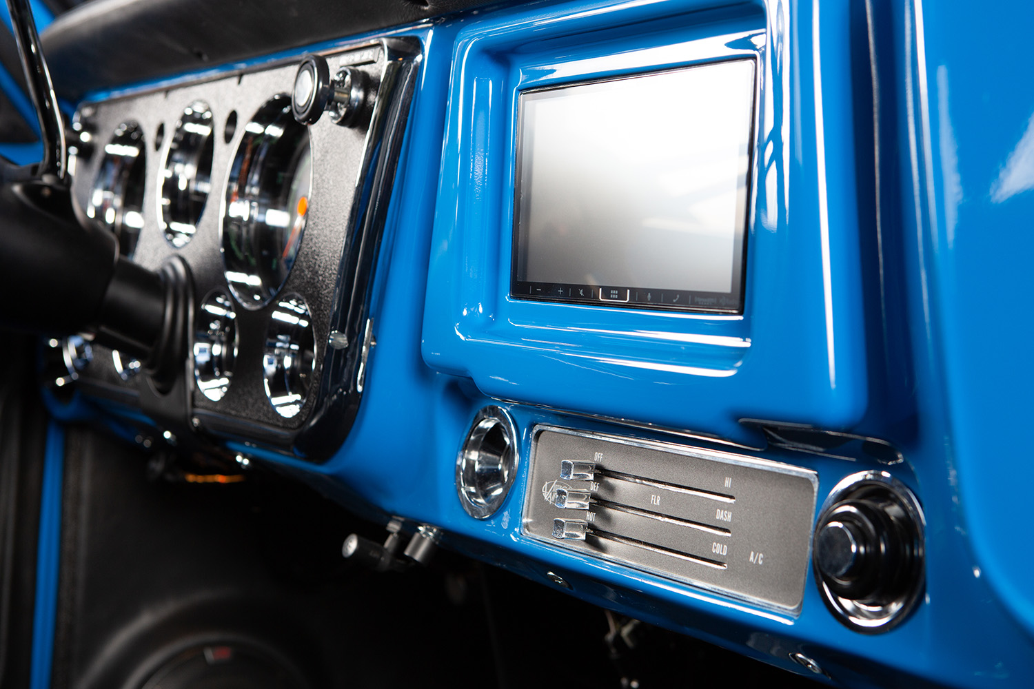 As this was a two-wheel-drive truck, an original four-wheel-drive trans tunnel was installed to clear the transmission and transfer case. The dashboard was modified to accept a touch screen stereo system that includes a pair of 6-inch subwoofers behind the center console is a custom enclosure. A Dakota Digital RTX gauge package replaced the original instruments and the fuse panel for the American Autowire harness was hidden in the glove compartment. For comfortable cruising regardless of outside temperatures a Vintage Air climate-control system was added.