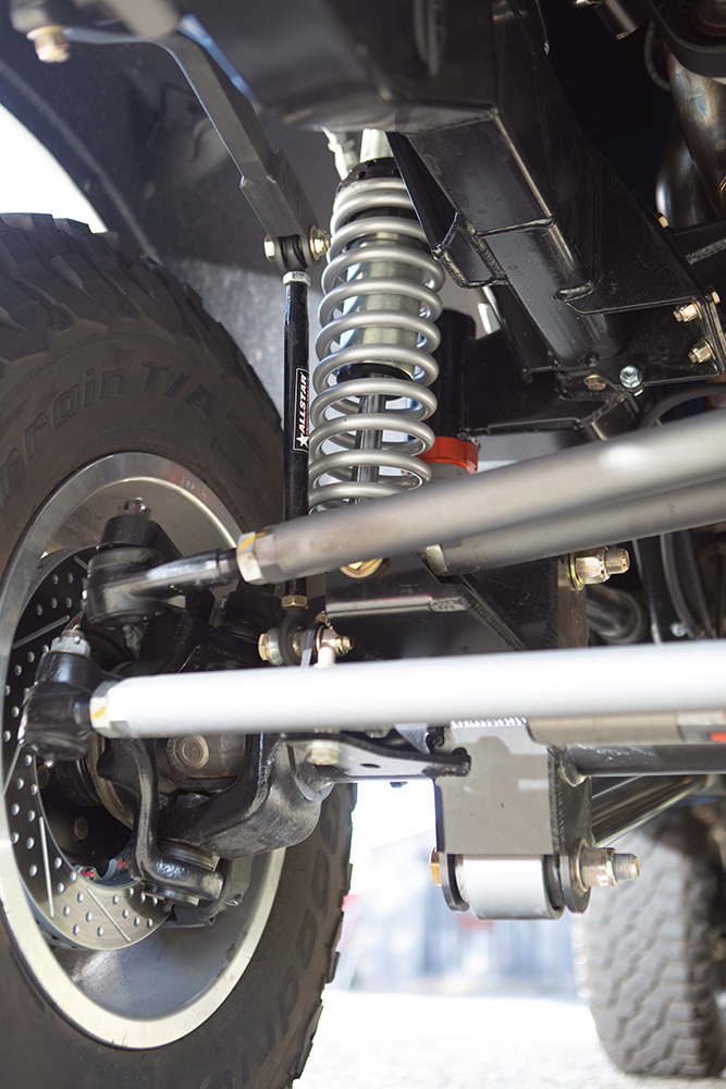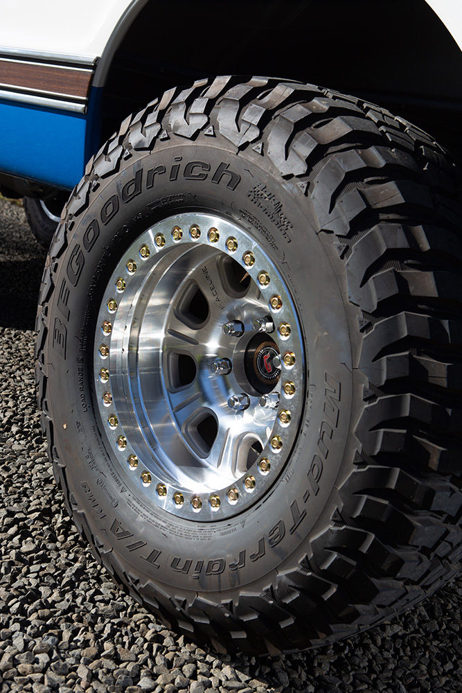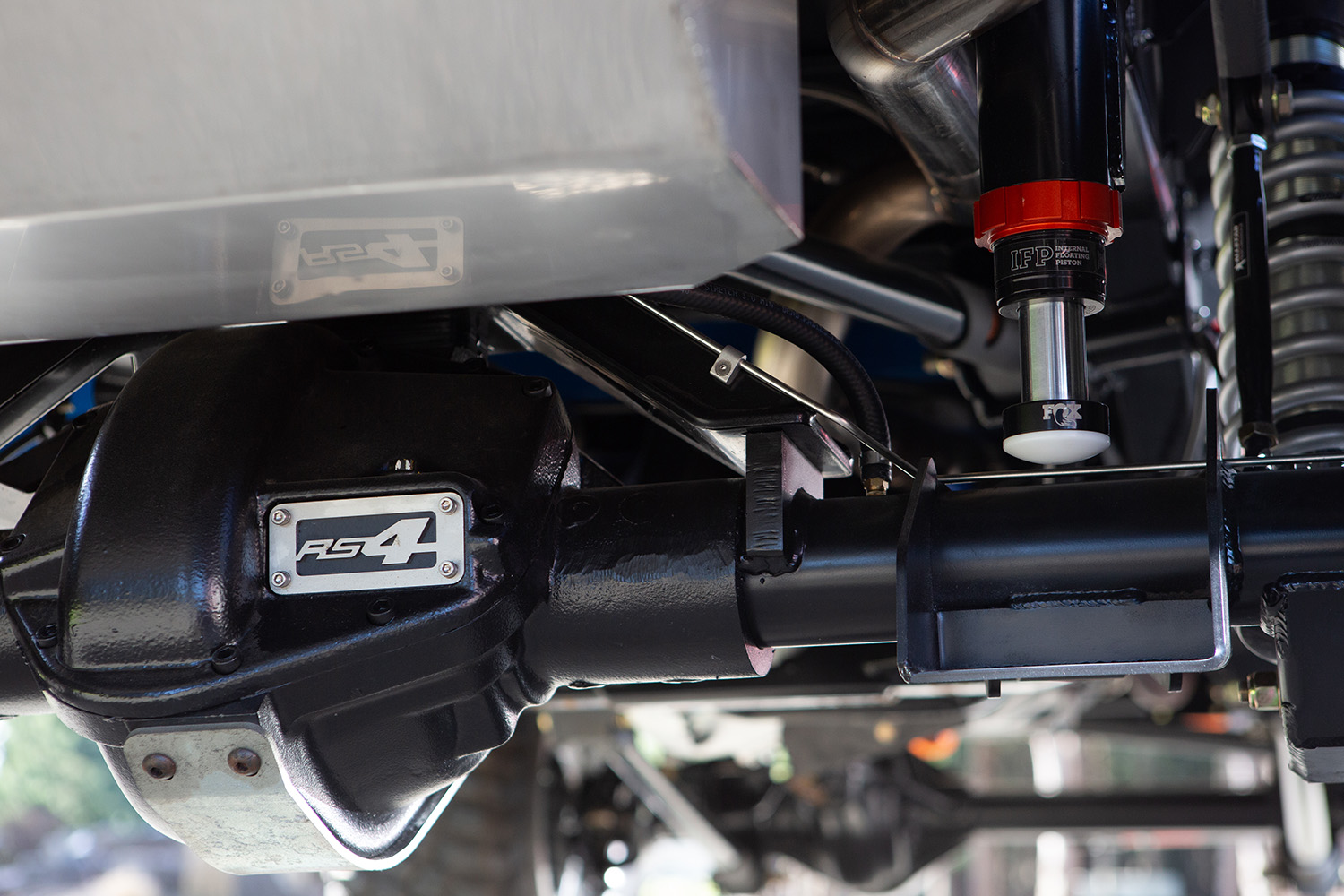 As we detailed in the Dec. ’24 issue of Classic Truck Performance, the MetalWorks crew started rebuilding the truck from the ground up. A new Roadster Shop RS4 four-wheel-drive chassis replaced the two-wheel-drive original. Up front is a Currie high-pinion Dana 44 axle; in the rear is a Currie high-pinion Dana 60—both are equipped with 4.11 gears and Detroit Truetrac limited-slip differentials. Driveshafts front and rear were provided by Tom Wood’s Driveshafts in Ogden, Utah. Suspension uses Fox Race Series coilovers and bumpstops along with sway bars at all four corners. Baer brake calipers with drilled, slotted, and vented rotors on both ends are activated by a hydroboosted Wilwood master cylinder. The new chassis rolls on 17×9 Raceline Monster Beadlock wheels rapped with BFGoodrich KM3 35×12.50/17 tires.