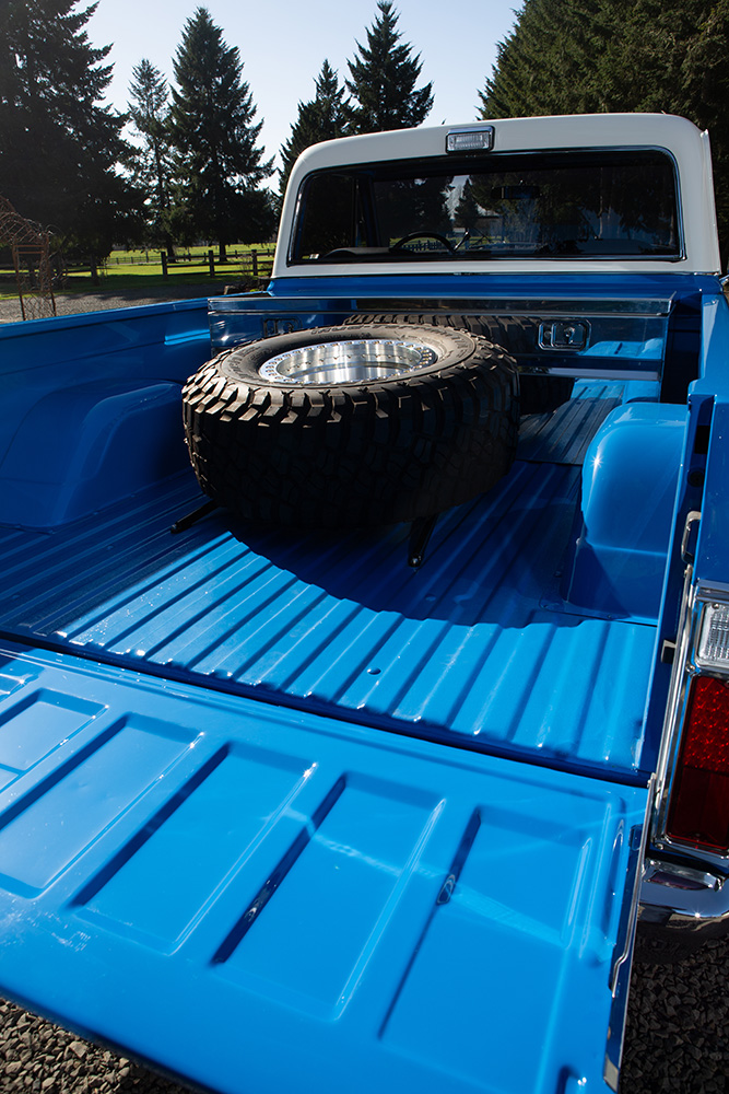 With the bodywork done the bare sheetmetal was thoroughly cleaned then given four coats of PPG epoxy primer. Next came five coats of polyester primer/surfacer applications that were block sanded until all the surfaces were laser straight. Finally, three coats of basecoat in the original Hawaiian Blue and Frost While color combo were applied followed by five coats of clear. To complement the exterior color the inner surfaces of the bed were covered with Raptor bed liner that was tinted blue, then a Pro Tech aluminum toolbox and custom spare tire mount were added.