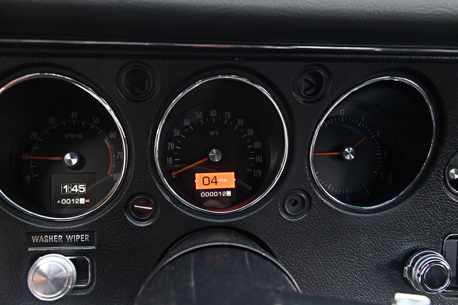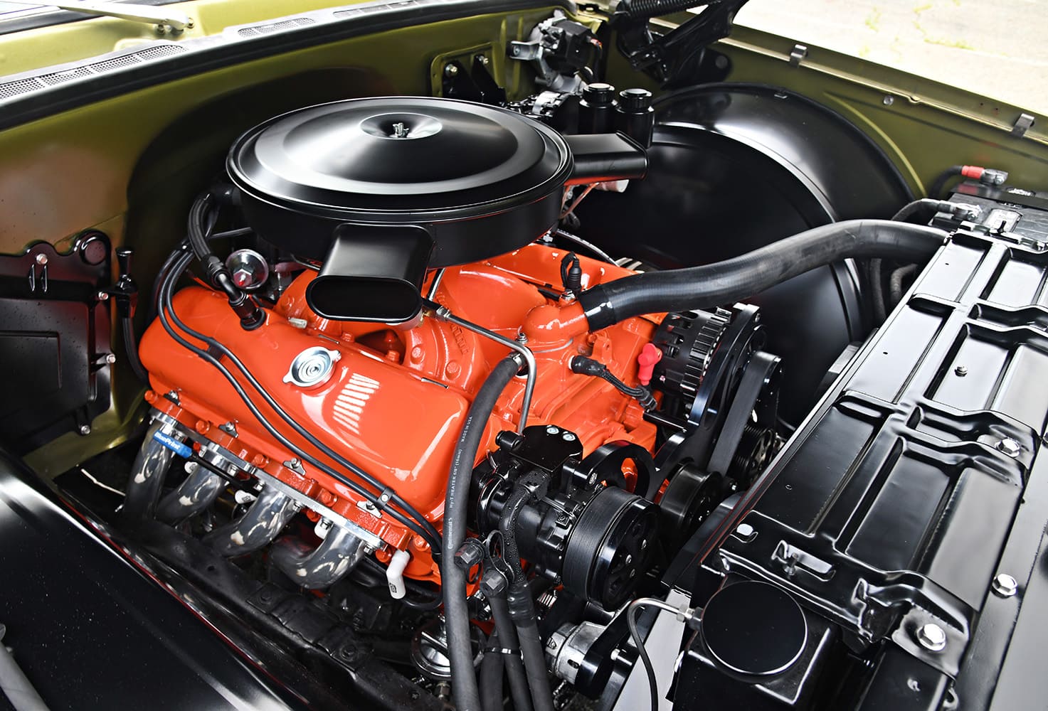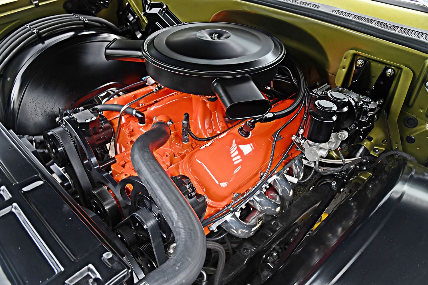 Next, let’s look at the powerplant that motor-vates this ride. “We ordered up a BluePrint Engines 496ci big-block Chevy and went to work on it. It was torn down and painted with new add-ons to make it look like an original early-’70s Chevy mill. Inside, nothing was touched, and mechanically it’s as delivered by BluePrint,” Barratt says. The engine is 600 hp right out of the crate and features a cast-iron standard deck block, forged steel crank, hypereutectic pistons, and a hydraulic roller cam. Topped with a set of BluePrint Engines Muscle Series aluminum heads, a dual plane intake, and Holley 850-cfm double-pumper, this 10.1 compression monster is the perfect stump puller, able to tow a big load, all wrapped up in a bright Chevy orange package.