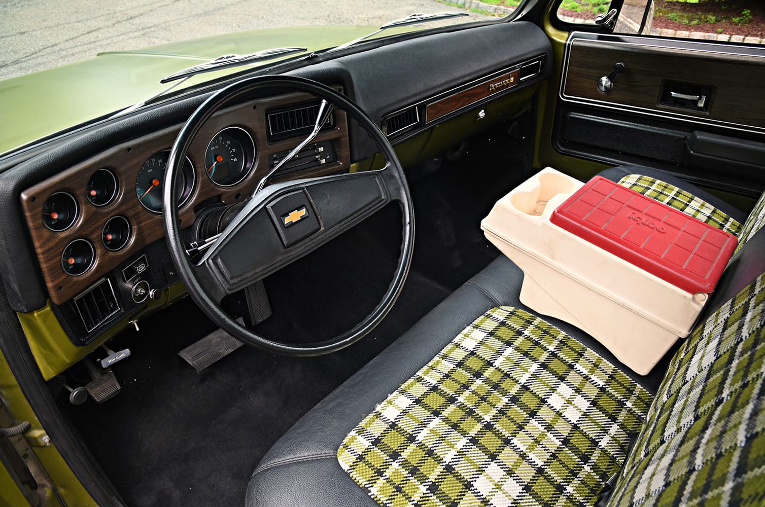 Once the underside was finished, the guys jumped on the interior. The C30 had some previous work already done in the cockpit, which was a big help. The bench seat was brand new and upholstered with stock upholstery. The matching door panels were in good shape and reused for the rebuild. Blue Sky worked on the dash and stuffed it with new Dakota Digital gauges to keep track of the vitals. An Ididit shorty steering column from Squarebody Syndicate, along with a stock steering wheel help keep this ride pointed in the right direction. Vintage Air controls the HVAC to keep the cockpit comfy inside on those steamy Carolina summer days. Oh yeah, that “custom” console sitting on the bench is actually a vintage Igloo armrest/drink holder that Michael just couldn’t live without. “It’s just a cool vintage piece that just has the vibe I’m going for in my vehicles,” Michael states.