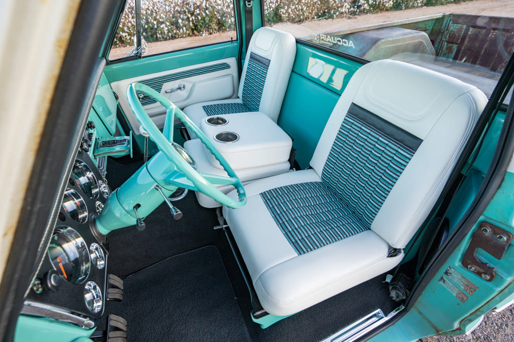 All the wiring/air lines I ran through the frame to keep them hidden; I put all the electronics, air/valve controls, and fuses behind the seats and built a valance to hide everything and cover it with custom, green-dyed leather that perfectly matches the 503 green interior paint color. You won’t see any of the modern technology unless you really search for it. Also, Alpine amps and (two) 10-inch subwoofers were all hidden under and behind seats.