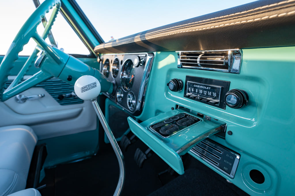 All the dash instruments I wanted as original-looking as possible, so I went with a Dakota Digital RTX instrument cluster with original ’68 script and colors but with all modern digital features. For the radio I went with RetroSound—again, looks original but has all modern features, Bluetooth, hands-free, and so on. All the chrome trim was original ’68 trim from another truck. I had it repaired and repolished and I had to repaint the black stripe myself. I stuck my AccuAir e-Level push-button controls in the ashtray so that if I want to hide them for the original look I just have to slide in my ashtray. The seats are a Slosh Tubz Bench Buddy seat frame that match the original option available in 1968 (the truck actually came with a bench seat) to keep with the original theme. The ’68 seats were available in white vinyl with a fabric insert, so with that in mind my wife suggested white leather seats and door panels with fabric inserts. The fabric is not circa-1968 but it matches the interior/exterior colors perfect (I believe it’s from a late-’50s or early-’60s Bel Air).