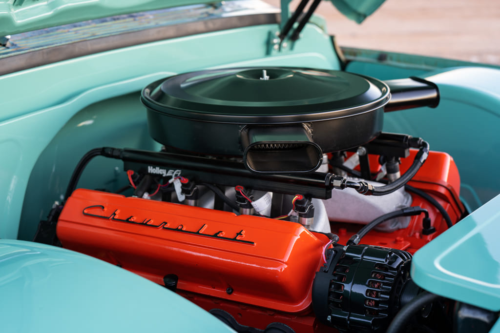 I didn’t intend to do a patina truck, but this one had such awesome OE paint I just had to keep it that way. I wanted a certain look, which was as original-looking as possible on the outside but with all the modern technology in and underneath it. I started with a Roadster Shop SPEC chassis. I wanted an LS3 motor and the fuel injection that came with it, but I wanted to make it look as old school as possible. So, I painted the motor Chevy Orange, added valve cover adaptors with the Chevy script valve covers, relocated my coil packs behind the heads, then added vintage-looking exhaust manifolds and an old-school air breather. The idea was to clean it up under the hood and the interior but keep everything else original looking.