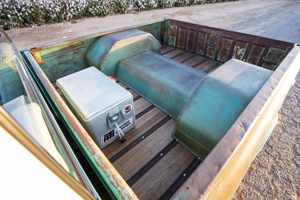 The hard part was what to do with the bed as I wanted to keep it old and beat up, but we had to build bigger rear tubs and a hump to accommodate the suspension raising and lowering. Hart and I were discussing it and I told him I wanted to keep the rust and dents in the bed but don’t know how we pull that off with all the new metalwork we had to do. He told me he had a guy who could match that patina if I wanted to try it. I said it’s worth a try—if it doesn’t work we were going to have to paint the inside of the bed anyway. After he finished all the metalwork, he sent the truck to Street Machinery/Patina Plantation for patina match. When I went and picked it up I could not believe the patina match—it’s mind blowing. If I didn’t tell you it was once a longbed you would never know it; Jerome with Street Machinery killed it. It is a piece of art, in my opinion.