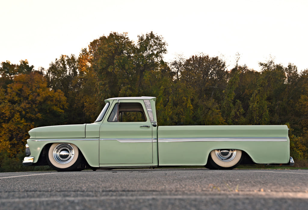 Knowing this ride needed some major work, Nick started looking at builds online to get some ideas. “I came across a cool ’66 C10 build online. I liked the look of this particular bagged longbed with big whites at the corners. I figured that would be my goal.” So, first things first. The bed came off and Nick dug into the suspension. The initial modification was adding a C-notch out back for more suspension travel. AccuAir’s E-Level air ride kit was the next big installation and the foundation for the C10’s stance and ride height. Drop spindles and a front disc brake kit from Classic Performance Products (CPP) finished off his early mods.