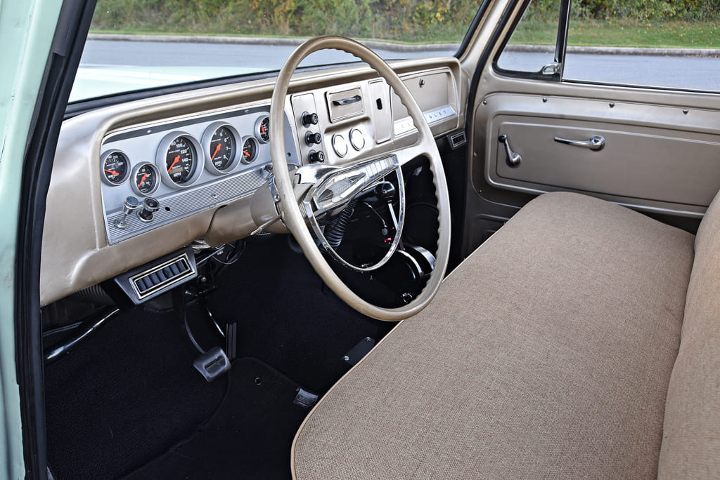 As for the interior, Nick wanted the truck’s cockpit to look basically stock with a few modern add-ons. “I painted the interior with Champagne Metallic paint and redid the bench with a kit from Classic Industries. I reused the original wheel and most of the interior’s hardware for the build. An assortment of Auto Meter gauges keep track of the truck’s vitals,” Nick states.