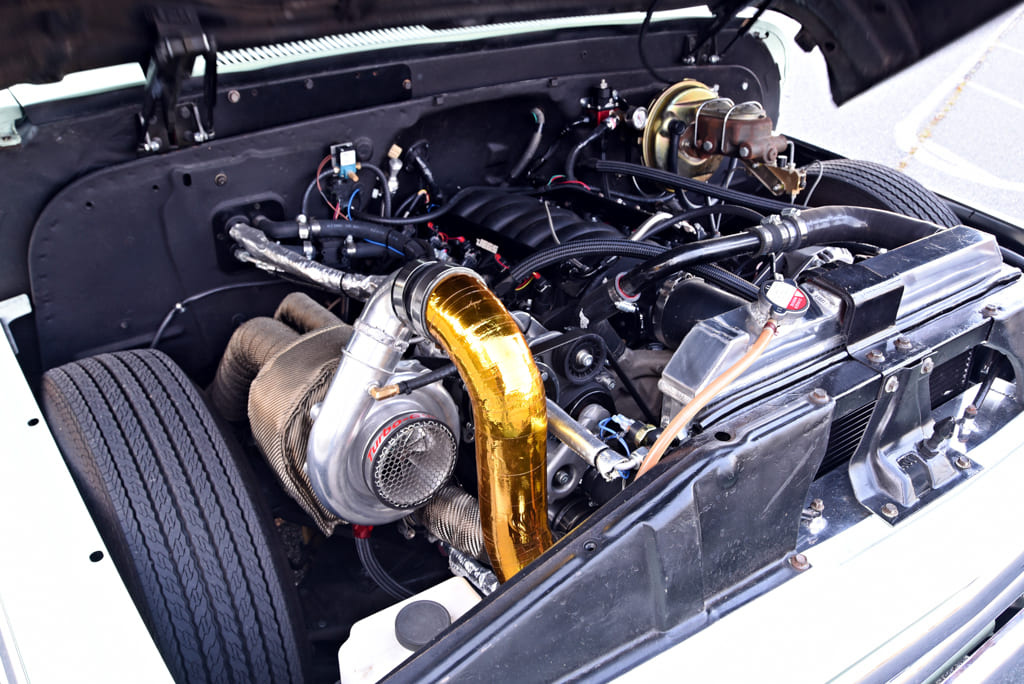 By the fall of 2019 the truck was back on the road, still running the 350/TH350 combo he had bought it with. Nick realized after redoing the truck he needed to upgrade its powertrain. “In the winter that year I started collecting parts; a 6.0 LY6 from an ’09 Suburban 2500 was the basis for the build, along with a junkyard 4L80E. I found everything I need for the swap and then decided it needed some more power,” Nick states. That would come in the form of a VS Racing 76mm turbo and a Mishimoto intercooler. A set of Hooker turbo manifolds get rid of the spent gases and help plumb the boost setup. A Holley Terminator X Max setup handles the engine management with ease.