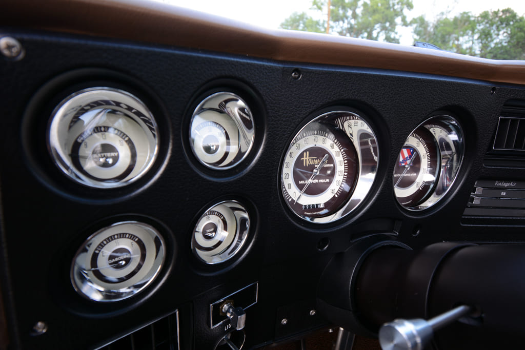 Harrison’s Rod and Custom dressed the big-block in polished aluminum components from Billet Specialties and installed a Vintage Air Front Runner system, complete with a Powermaster alternator. A Johnson’s Radiator Works radiator and Cooling Components dual electric fan setup keep it cool. The engine’s surroundings are super slick, thanks to a smooth firewall and inner fenders painted in a matte brown finish. Behind the big-block is a TREMEC TKX five-speed manual transmission from Bowler Performance. A Ram dual disc clutch applies the power.