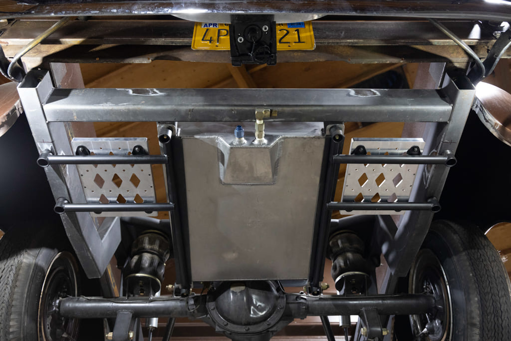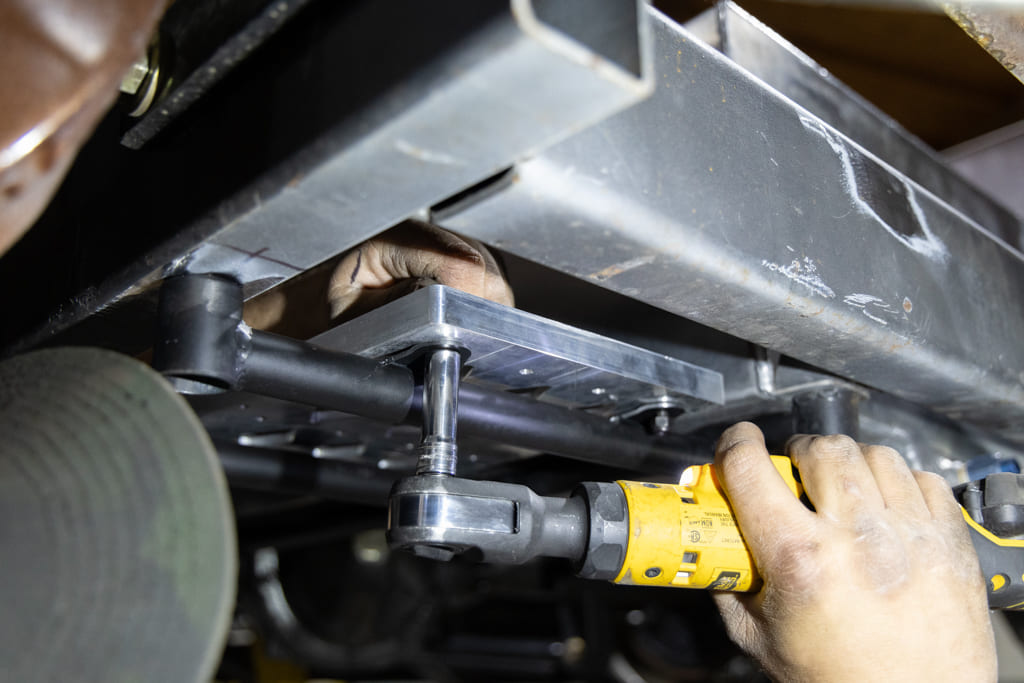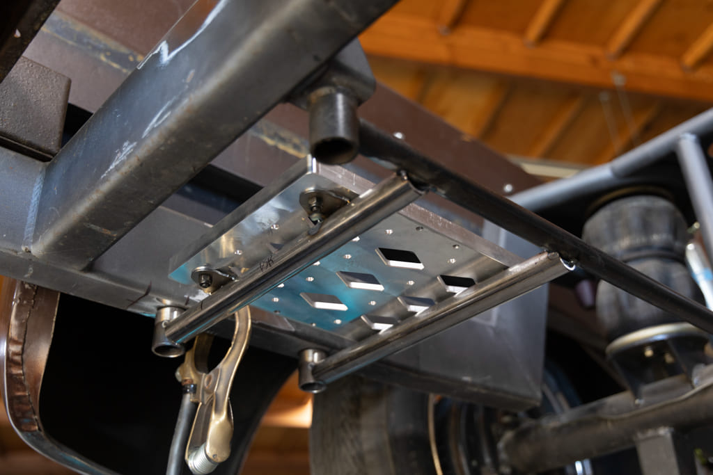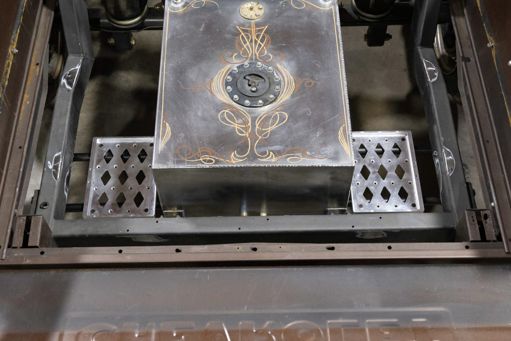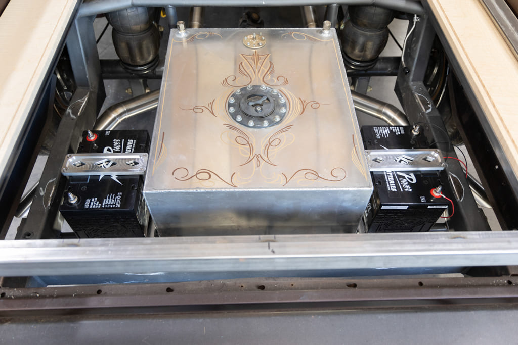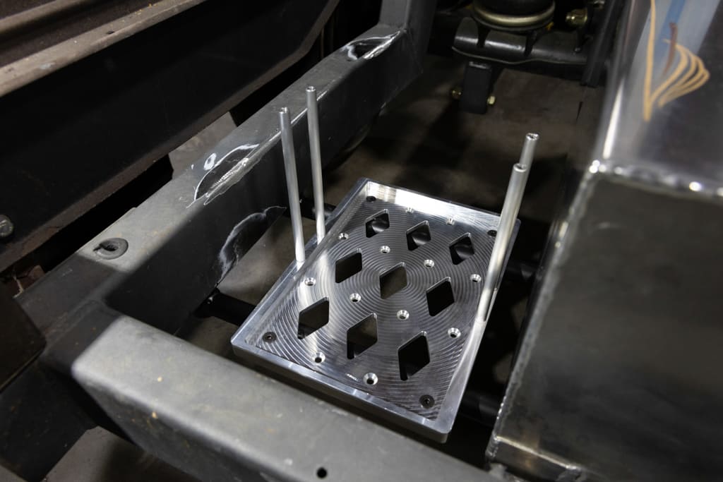 Well, as some of you may or may not know, Old Anvil is quite proficient with CNC—from small parts and complete wheels to full bed floor frames and, you guessed it, billet battery trays. If it can be imagined, chances are they can whittle it out. With the old manual-valve air-ride system removed from the rearmost portion of the chassis, Paul chose to locate the Old Anvil Group 34 battery mounts on each side of the fuel tank via a custom-fabbed subframe structure, which I had absolutely no problem with!