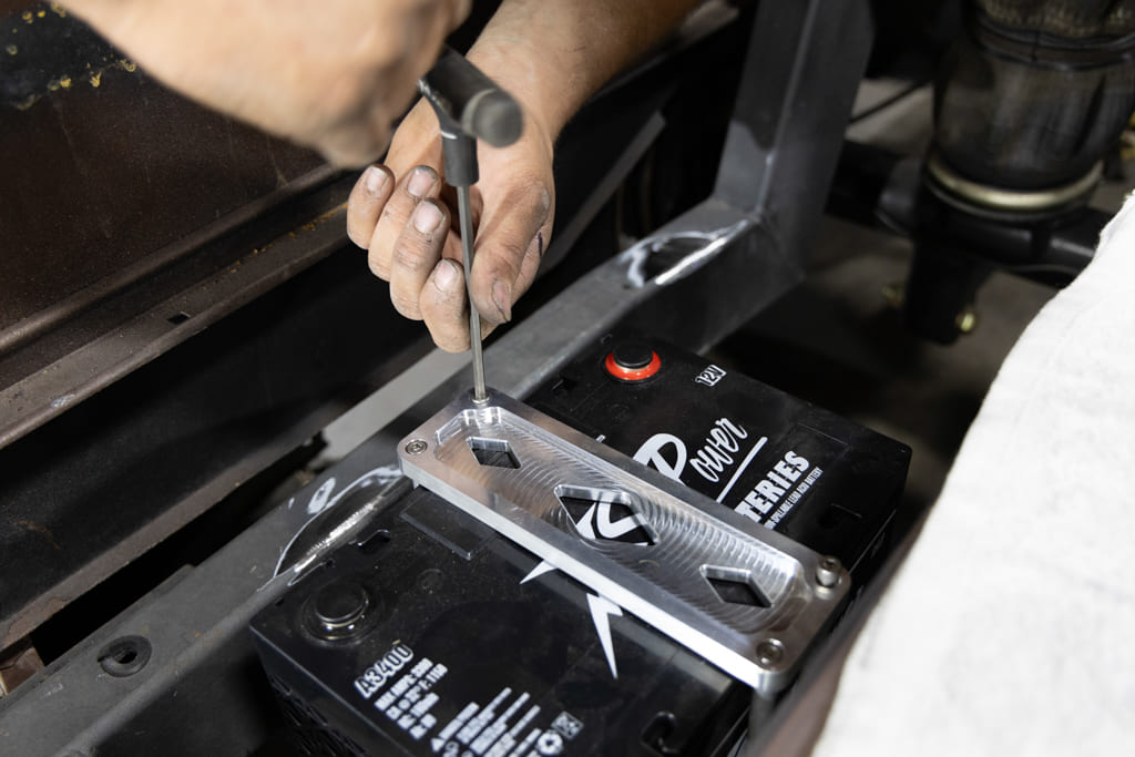 In preparation for the installation of the Air Lift Performance 3H/3P air management system, “… the dual ViAir 485C compressors draw as much as 46 amps combined. Without dual batteries, this draw can create a voltage drop to other components, such as EFI, stereos, and fuel pumps, as well as overload the alternator,” Paul explains. OK, so that means I’ll also need to upgrade my alternator, correct? “No. Actually, the dual batteries help the alternator a lot—they take the load off peak needs, like when the compressors are on. When they are off, it’s storing energy—kind of like solar panels with power storage.”