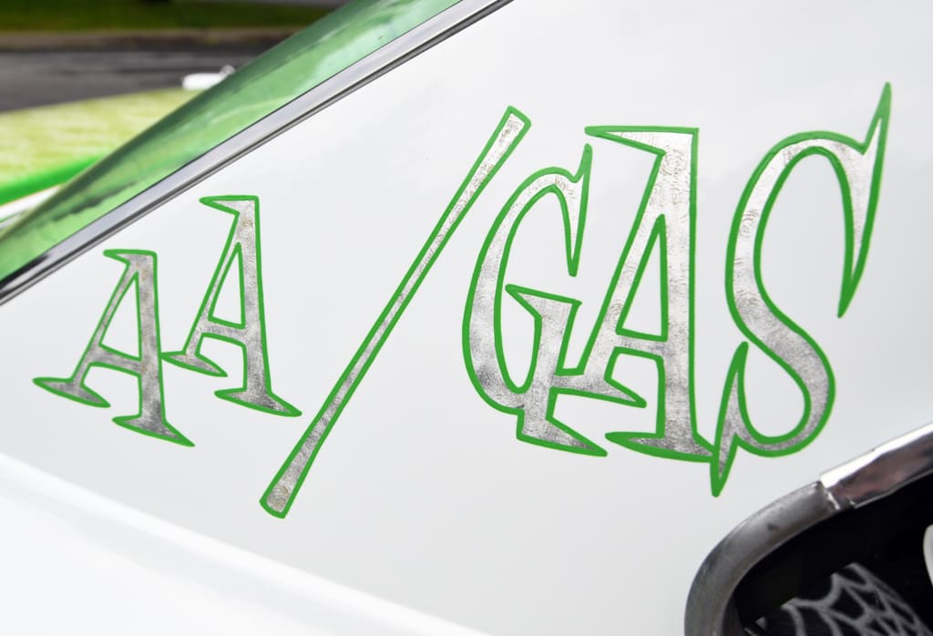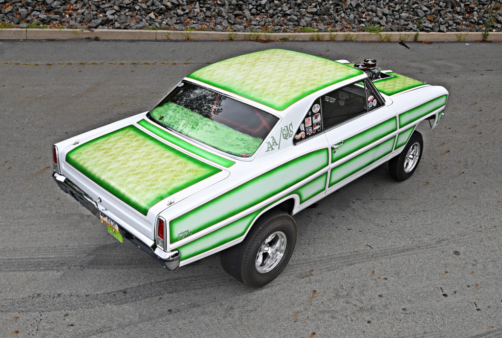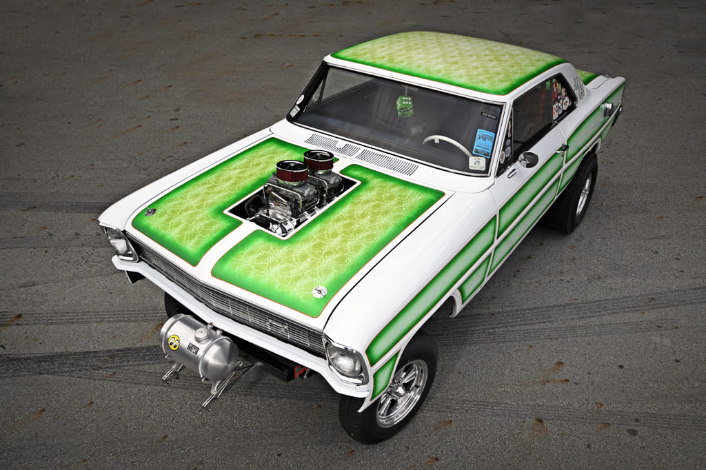 Conklin laid down six coats of ’68 C10 Riviera White to the Nova’s flanks. David joined in and masked the panels so Conklin could start the lace work. He started by misting the car with Jungle Fever Green, finishing off the edges with Synergy Green and pearl paint to accent the lace design then six coats of clear. Once dry, David unmasked the car and proceeded with the wet-sanding process prior to Glenn Yuengling’s myriad of lettering and pinstriping on the ride.