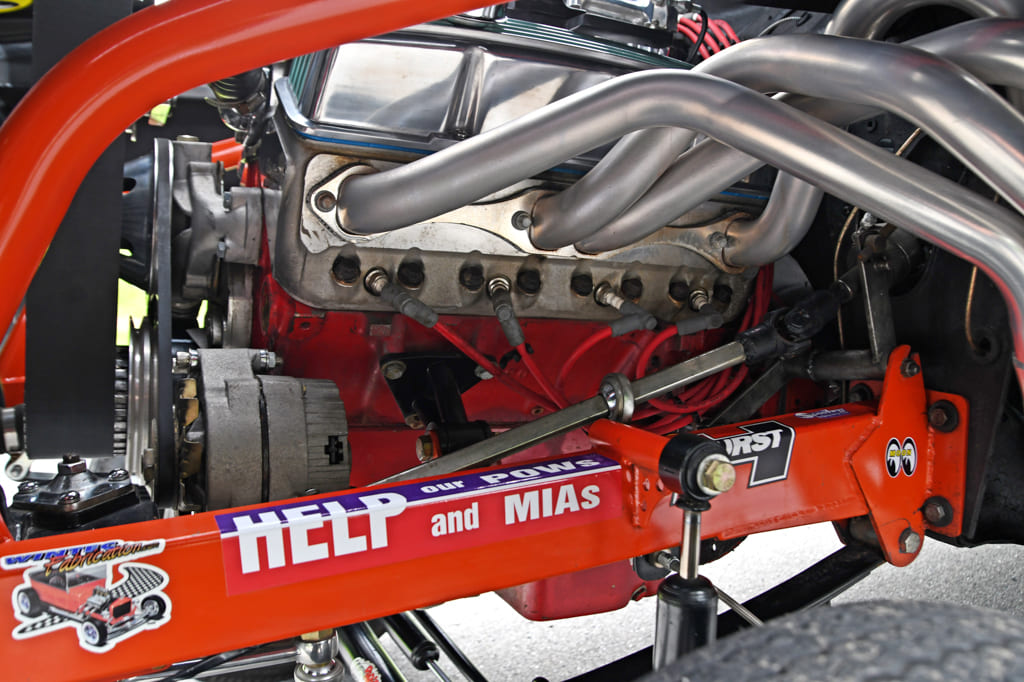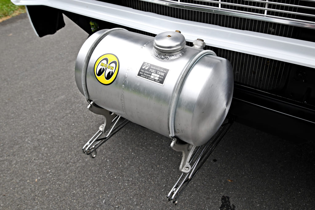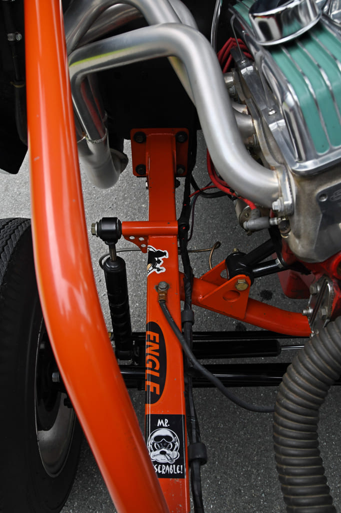 Front Suspension: Speedway “Zero Drop” straight axle, Chevy ’49-54 spindles, ’70s GM Twisty shocks, aluminum block risers