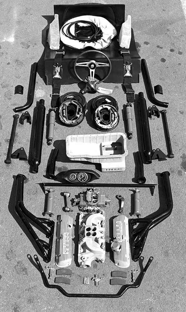 Our model is seen here holding a fiberglass hood (left) and the rear interior floor piece (right) that replaces the factory rear seating area and now serves as the new location for mounting the spare tire.
