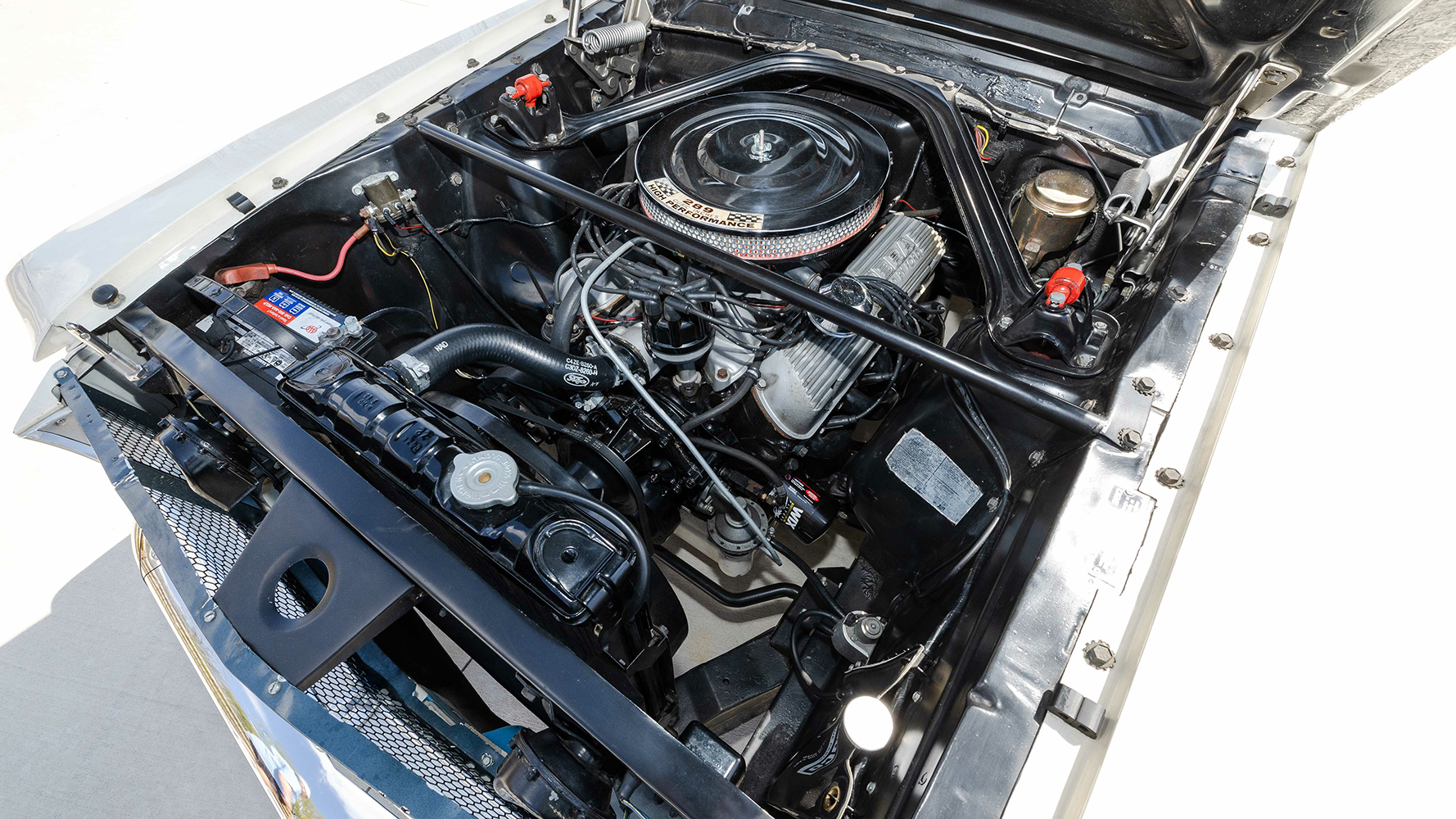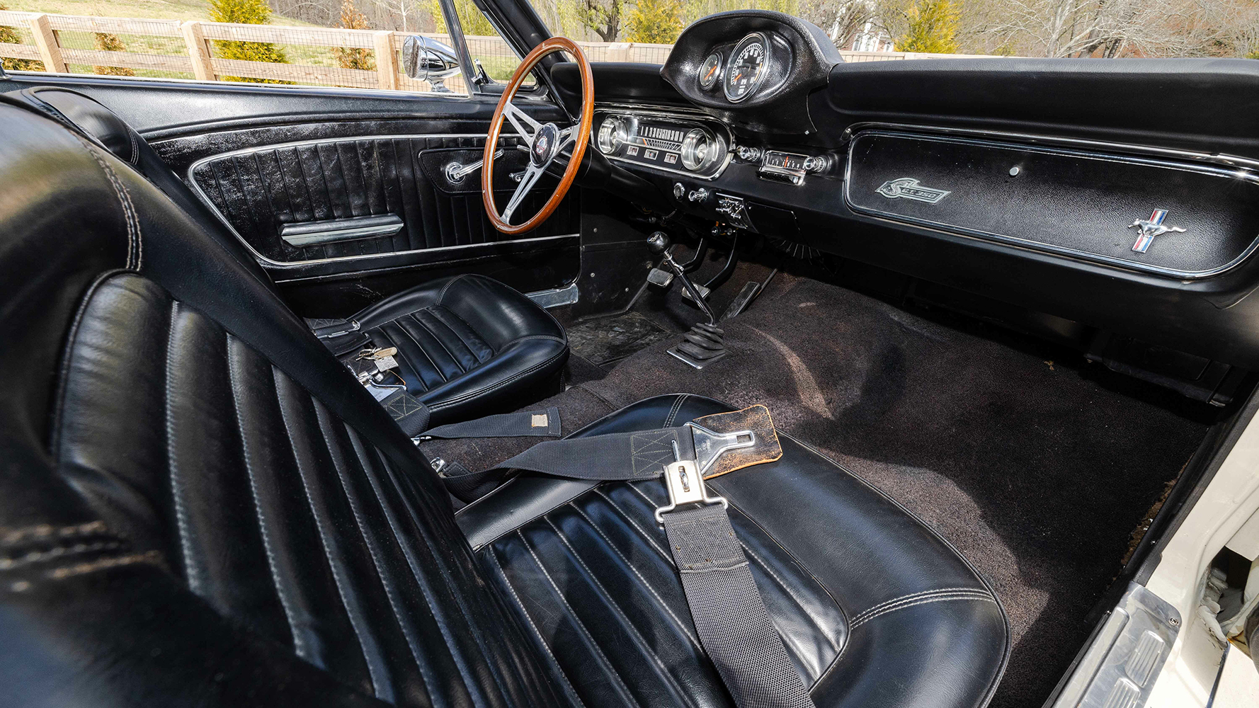 At first glance it looks like any 1965 Mustang Fastback front interior view but look closely and the distinctive add-on upper dash gauge package (oil pressure and tachometer) is one-of-a-kind to the Shelby G.T. 350.