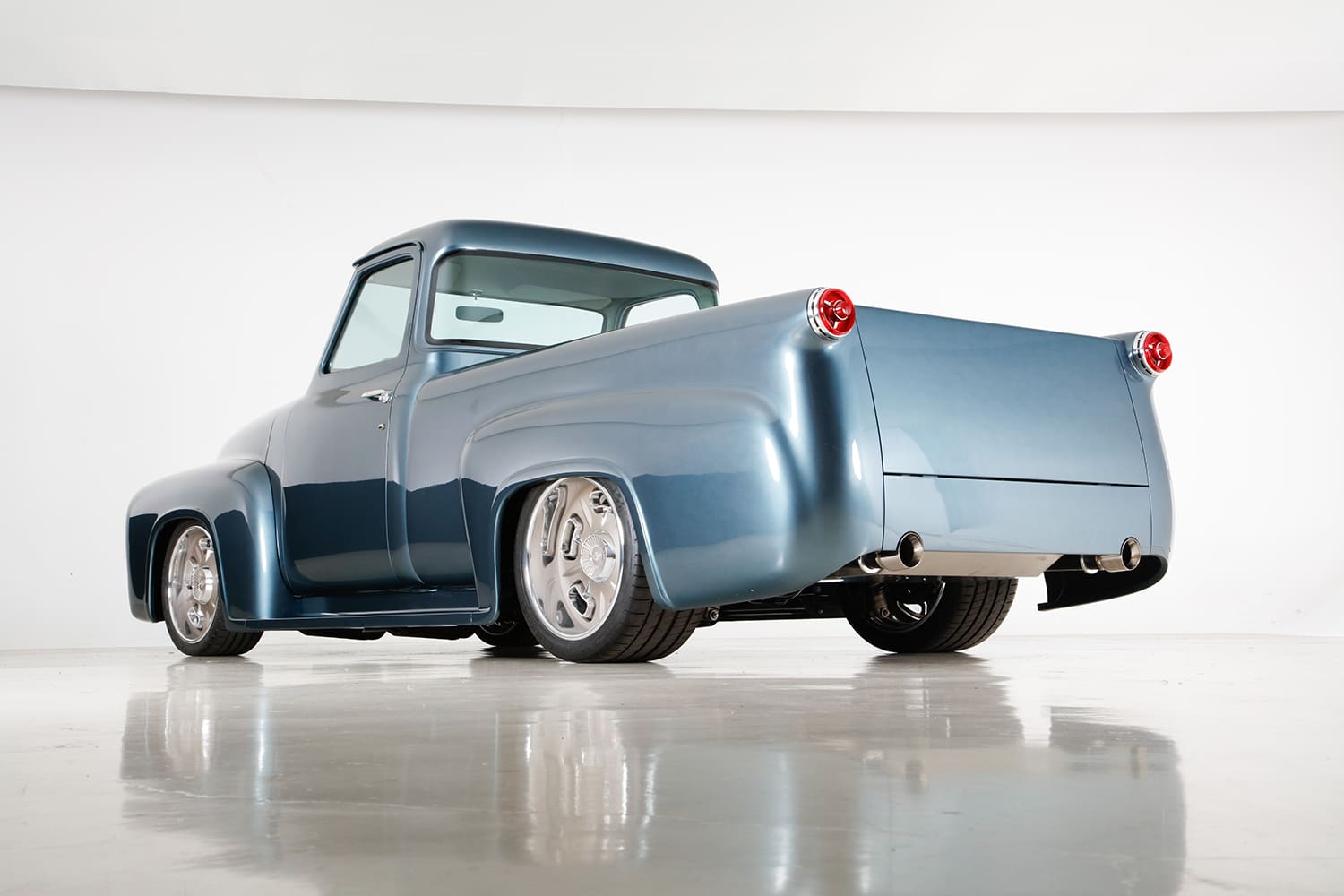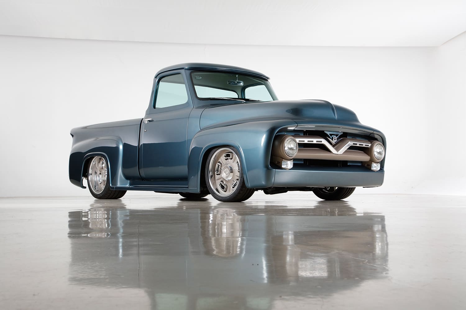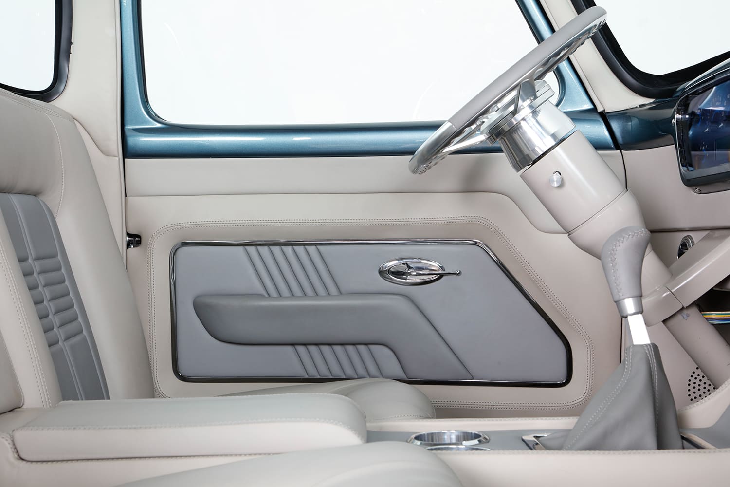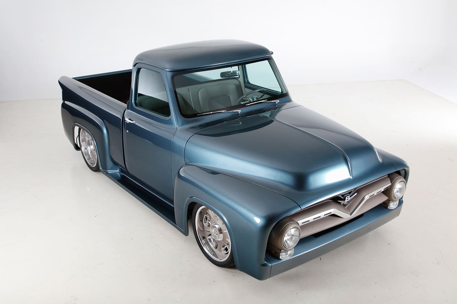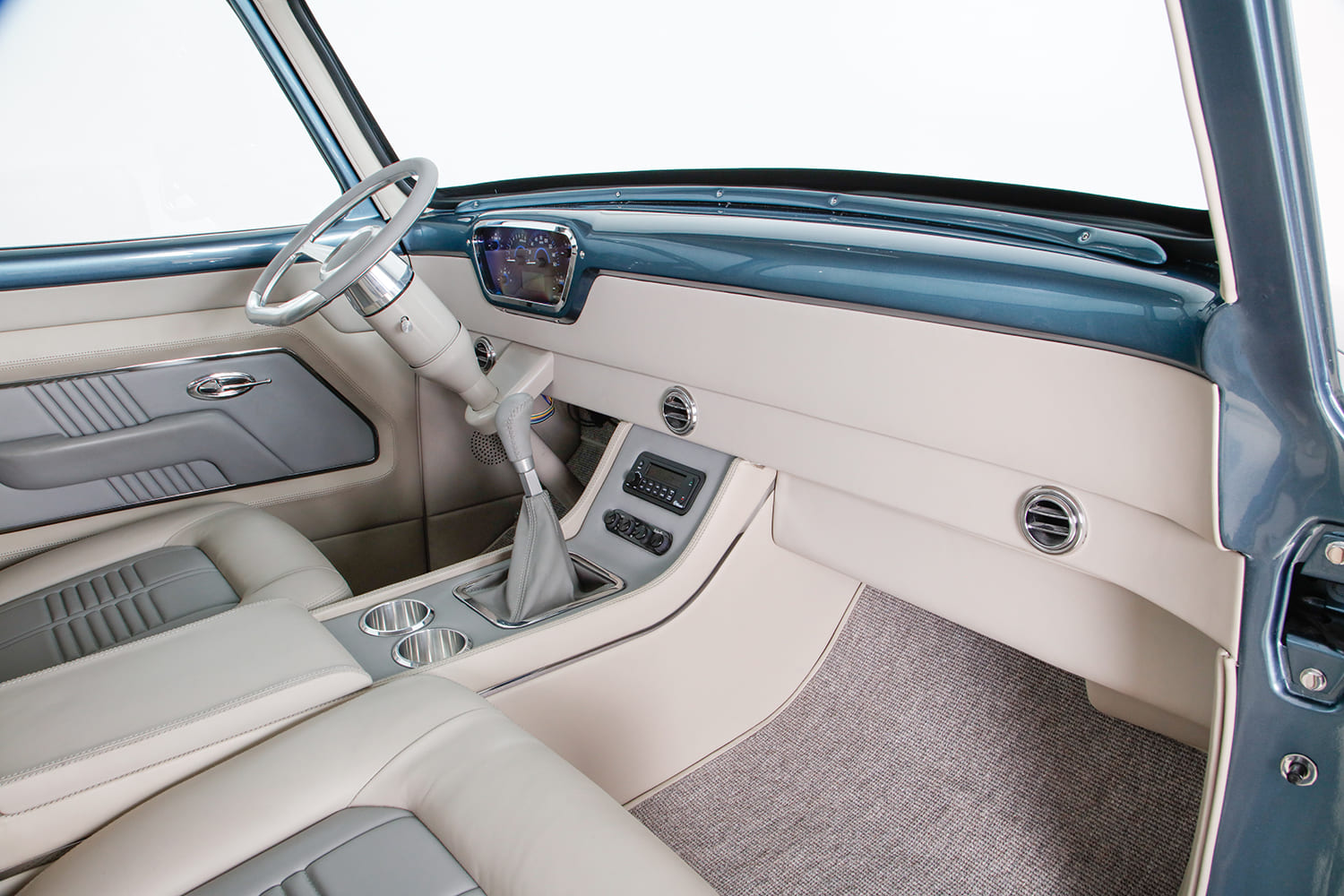 “I did the engine harness and computer installation, then took the truck to KR Custom Paint in Seabeck, Washington, for the body and paint (PPG BNW Blue Ridge Metallic), and while it was there, Keith Russell (KR) and Doug Braun did the final wiring. In total, I made four trips up north to work with Keith and did all the assembly. From there, the Ford went directly to Gabe’s Custom Upholstery in San Bernardino for the interior based off Eric Brockmeyer’s concept illustration.”