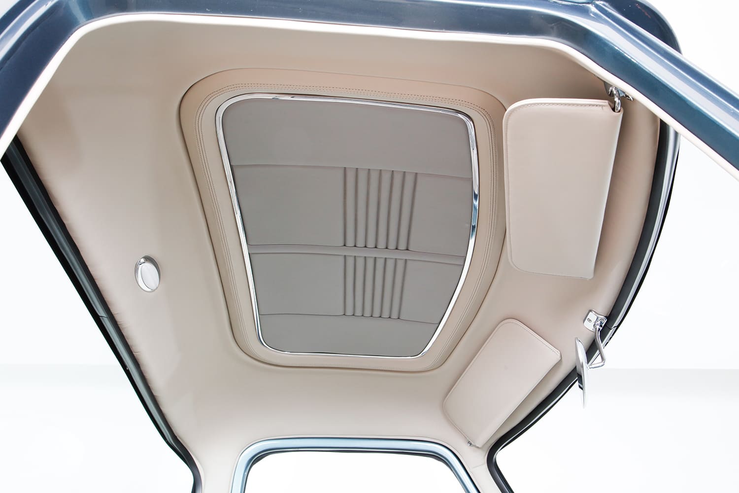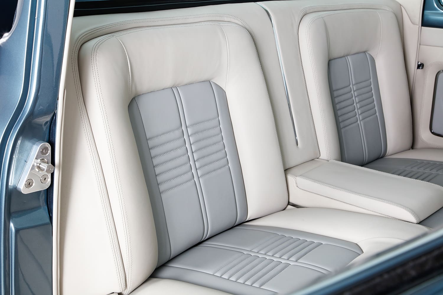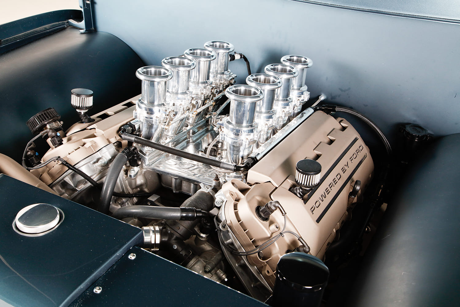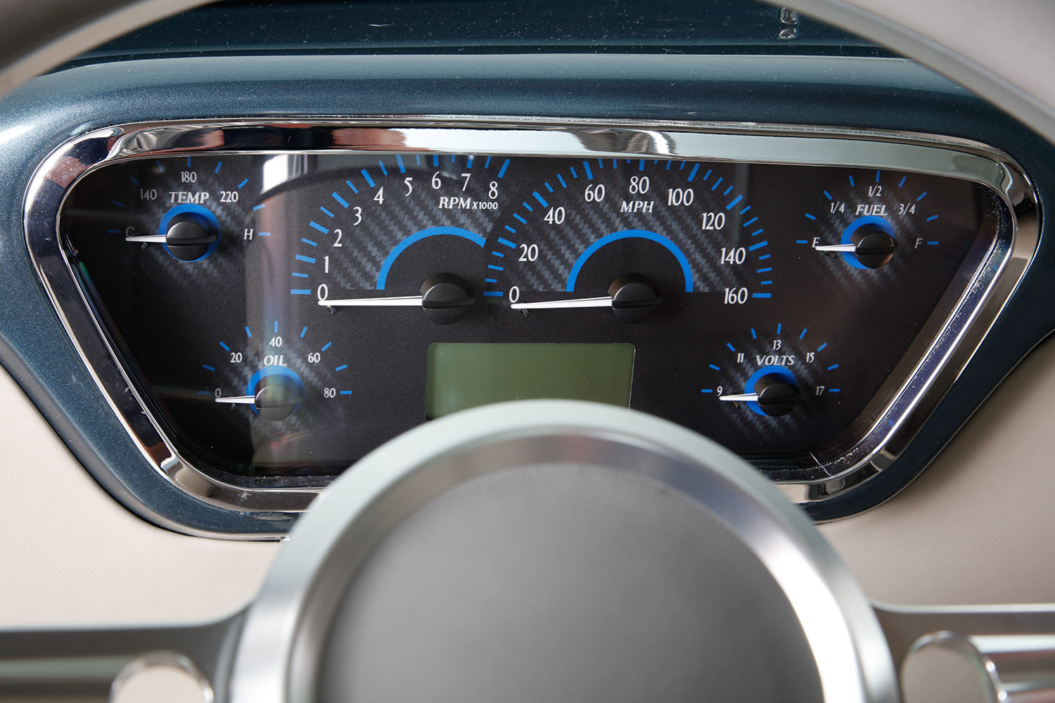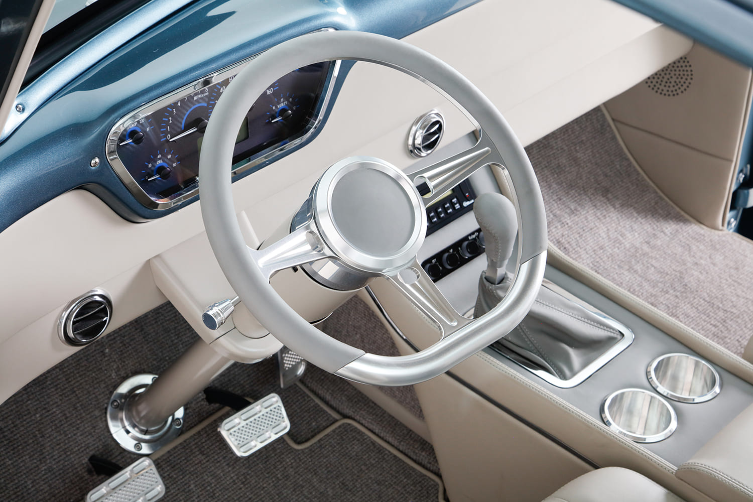 “I did the engine harness and computer installation, then took the truck to KR Custom Paint in Seabeck, Washington, for the body and paint (PPG BNW Blue Ridge Metallic), and while it was there, Keith Russell (KR) and Doug Braun did the final wiring. In total, I made four trips up north to work with Keith and did all the assembly. From there, the Ford went directly to Gabe’s Custom Upholstery in San Bernardino for the interior based off Eric Brockmeyer’s concept illustration.”