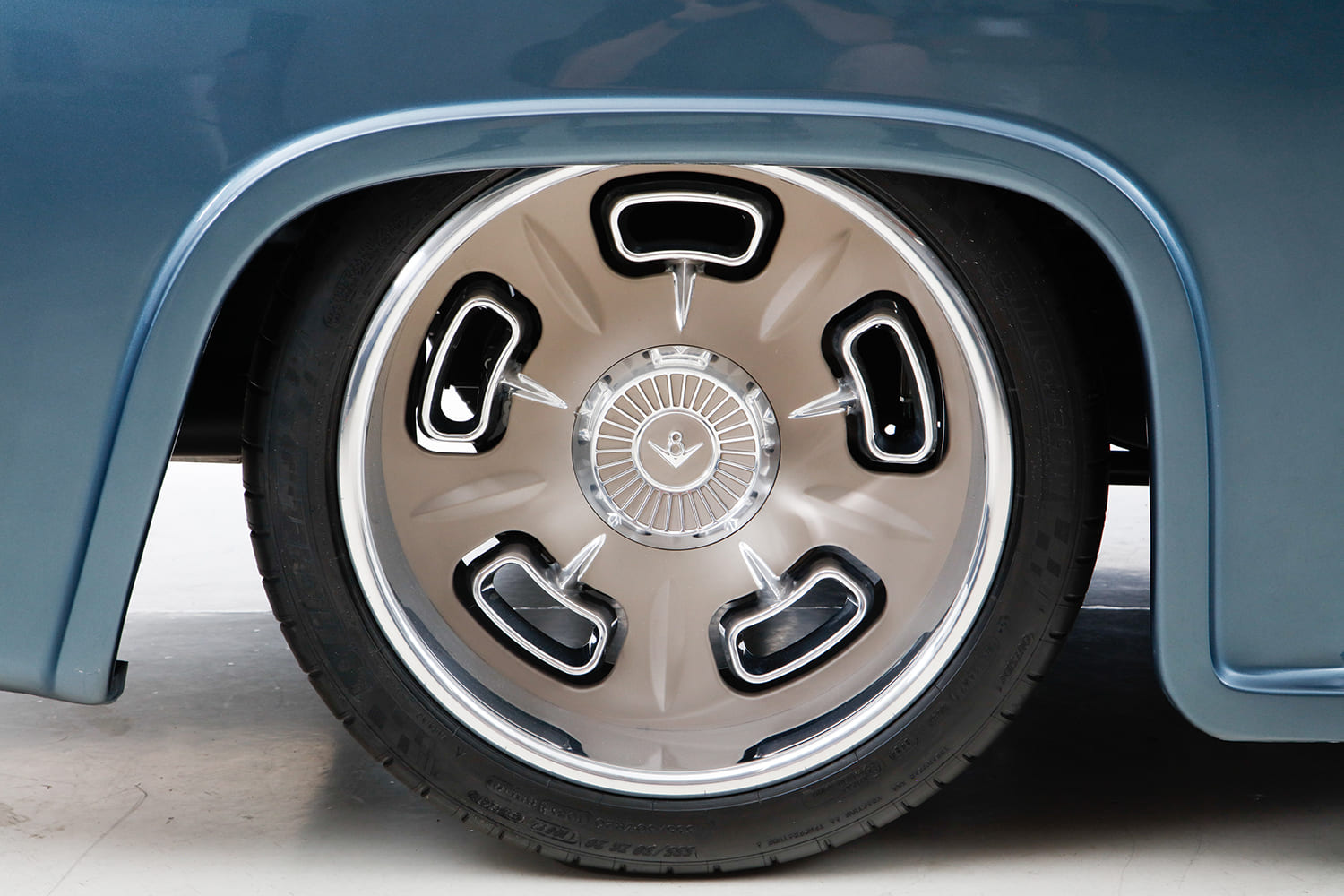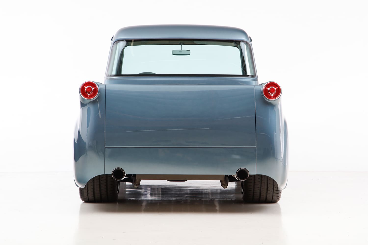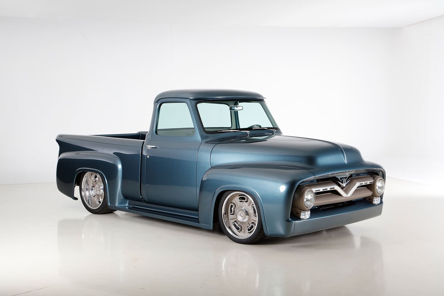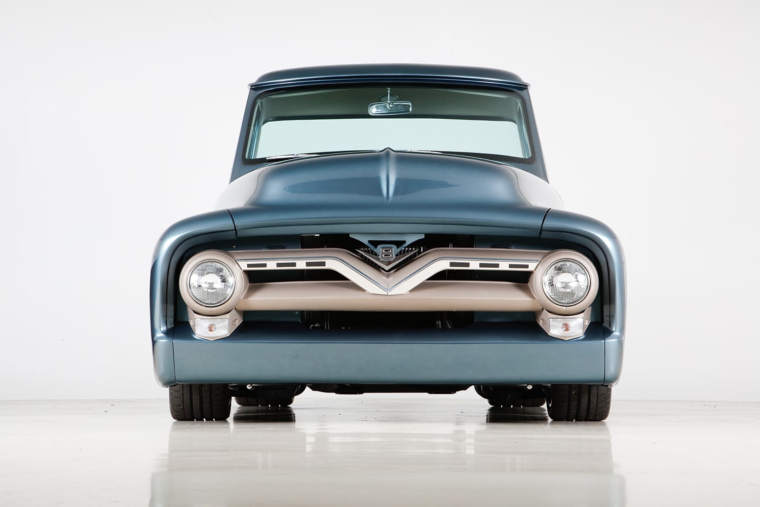 Chris Coddington contributed a signature element to the F-100’s concept with a set of one-off Hot Rods by Boyd 19/20-inch billets (based on their new Cleveland model wheel) that feature a polished and Cerakoted two-tone finish with unique “hubcap” centers. Additionally, Gabe’s two-tone gray and cream leather interior are complemented by a Dakota Digital cluster, Sparc Industries wheel on an Ididit tilt column, and Vintage Air Gen II climate control. That 5.0L modular V-8 beneath the nosed and peaked and reshaped hood is now fed by a Borla eight-stack injection (exiting via a stainless Borla exhaust) controlled by Holley’s latest Dominator controller. All in all, a properly executed “modern” concept reminiscent of that truly inspirational golden era!