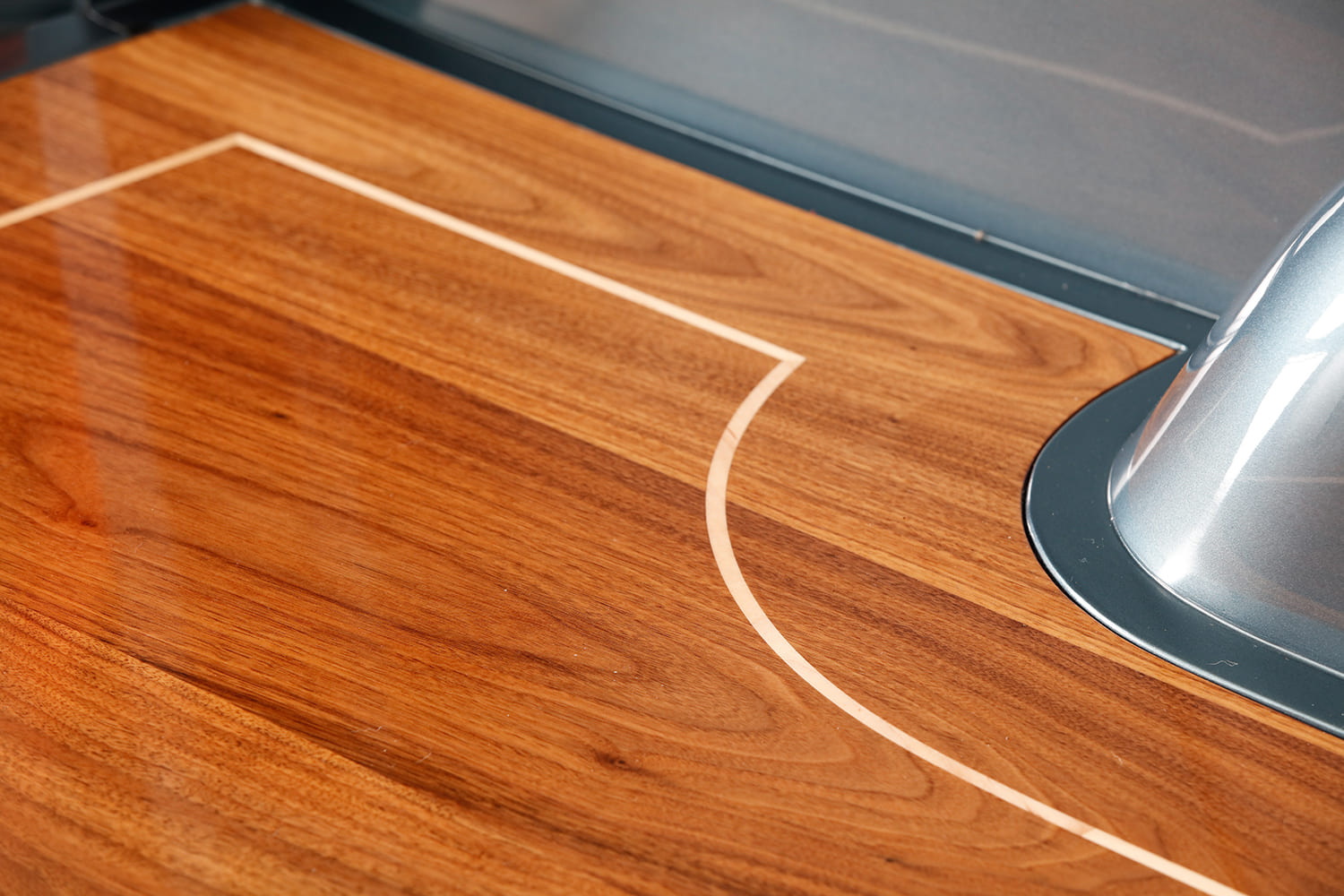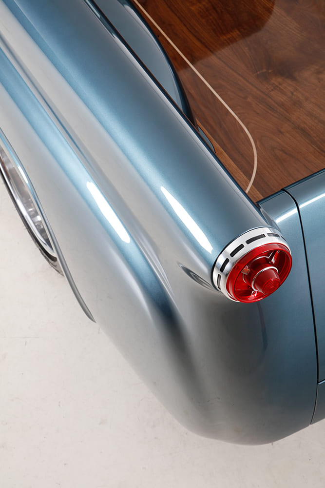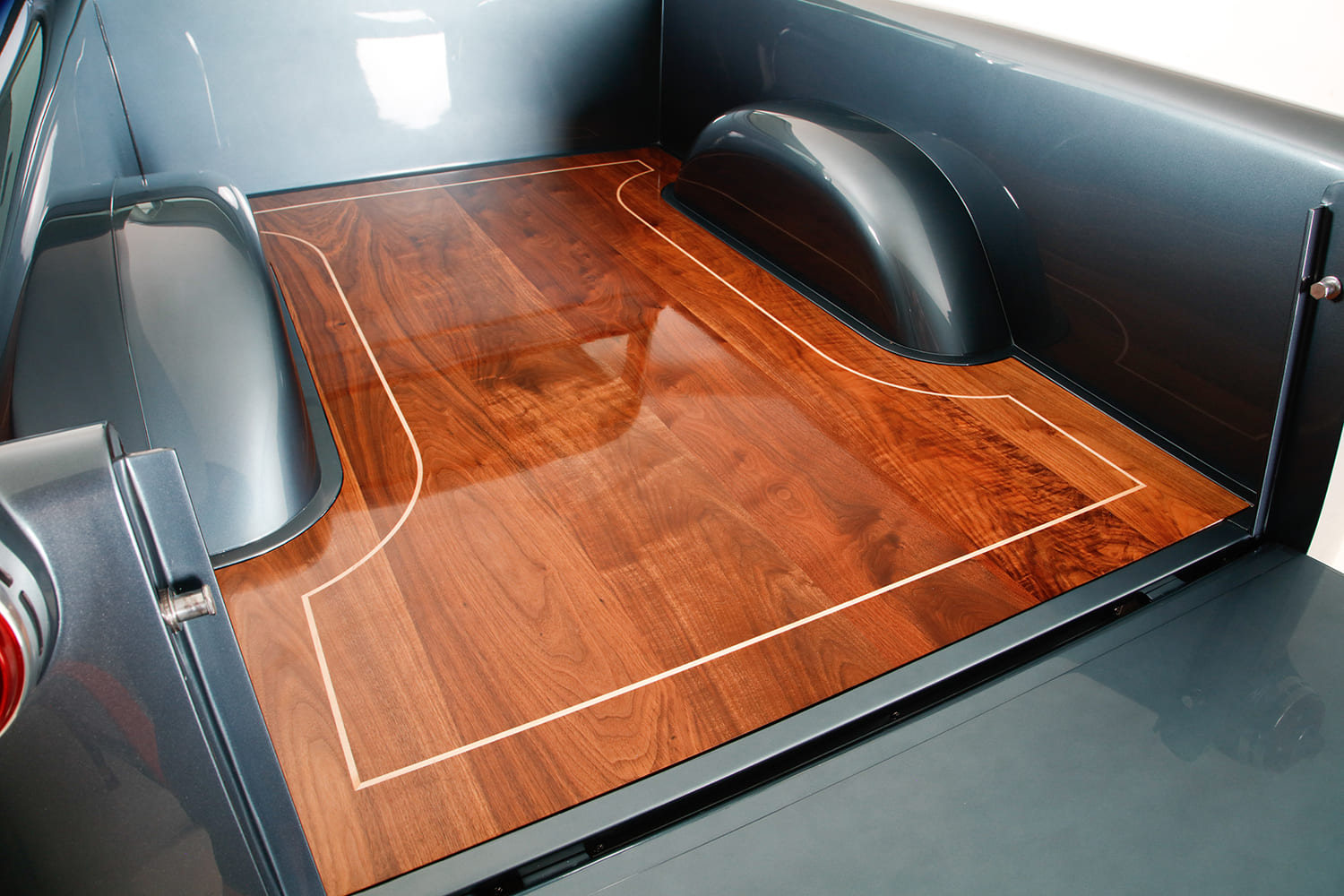 “After attending the SEMA Show, I acquired various sheetmetal fabrication equipment and began completing the truck myself. I ended up scrapping the hood, front fenders, doors, firewall, cab floors, and complete cowl. During the week, I could cut out the bad panels and make/tack weld new pieces; on the weekends, my good friend Sergio Suacedo, who’s been in the industry for 25 years, would come over and finish-weld all the panels. (The truck bed was made using ’55 Ford panel outer quarters with taillight sections from a 1954 station wagon; all other parts of the bed were handmade. The taillight housings were machined from billet by EVOD Industries. The bed wood is black walnut with a maple inlay that was CNC cut and fabricated at The House of Hardwood in Los Angeles.)