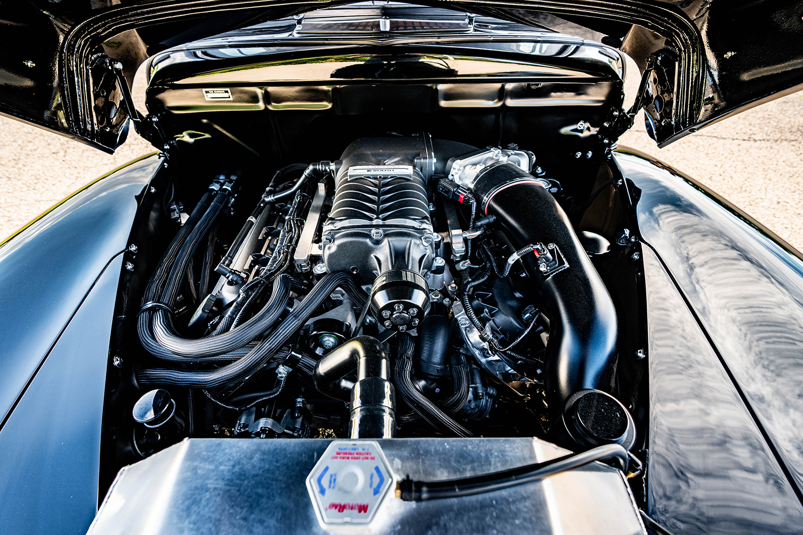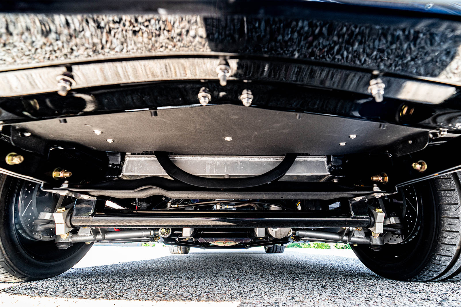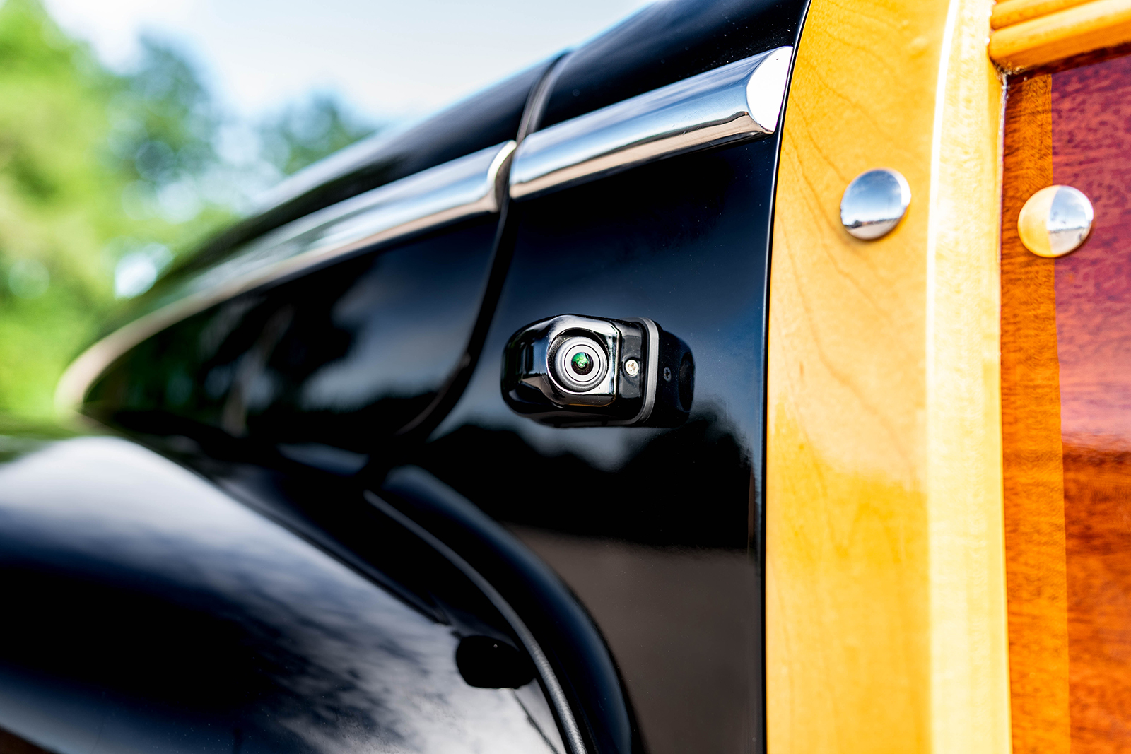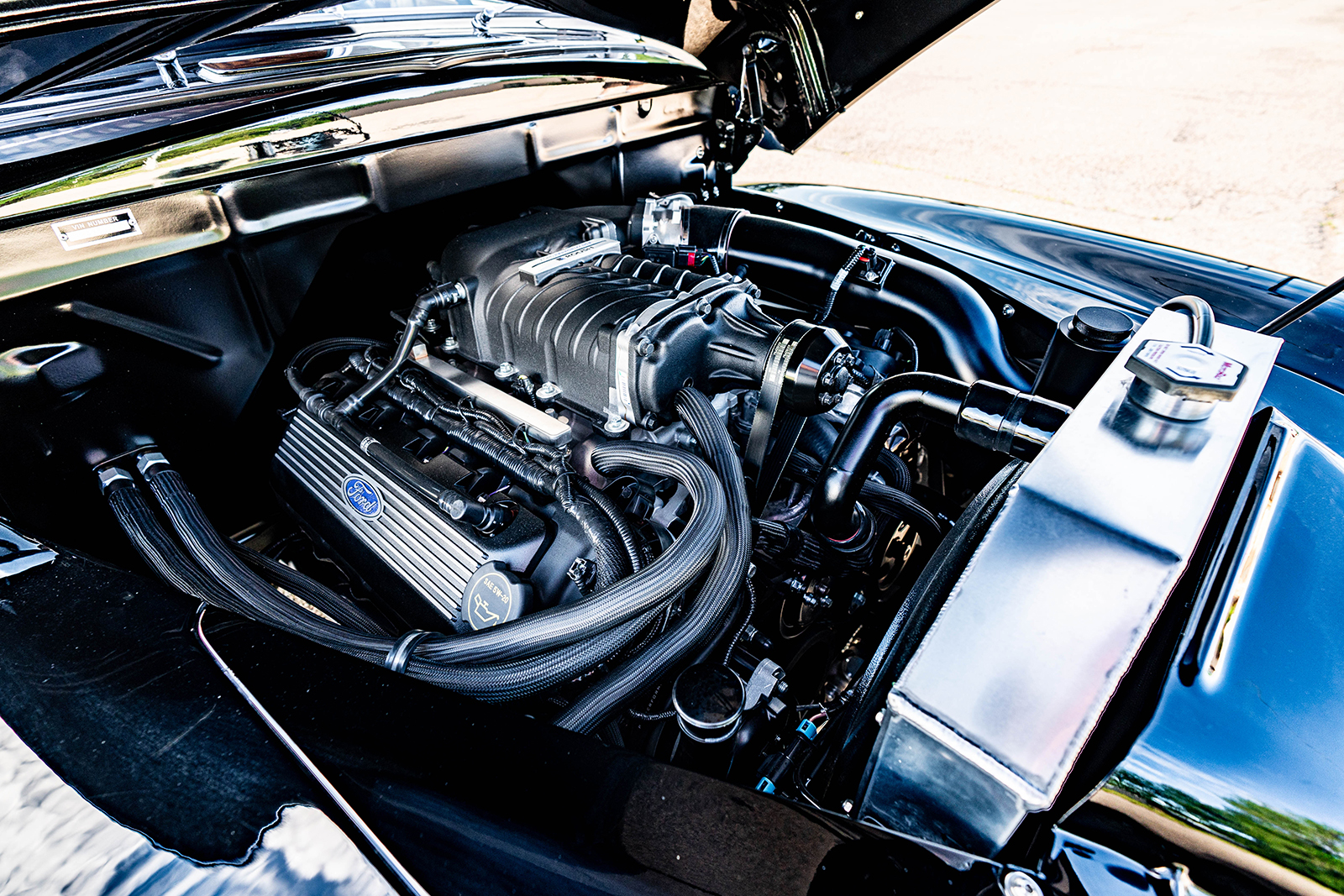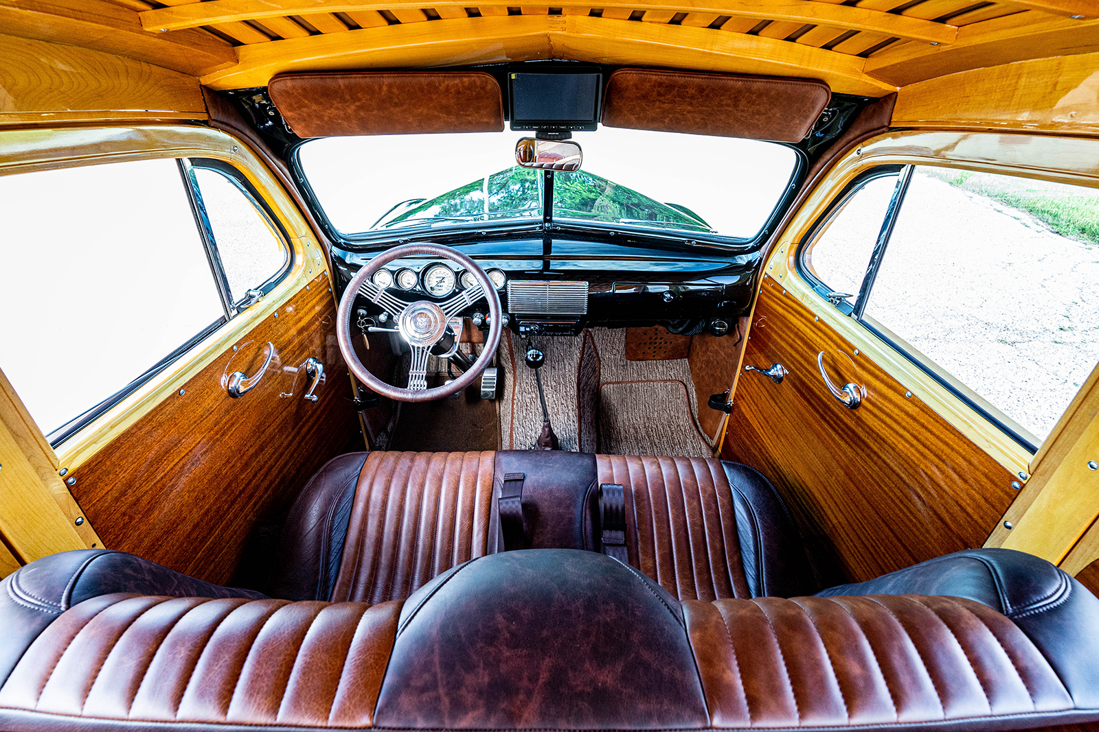 What started out as the obligatory 350 small-block Chevy V8 engine and Mustang II Independent Front Suspension would undergo a complete makeover at the hands of the builders at Schwartz Performance. While the outer skin remained pretty much as purchased in its stately black with impeccable woodwork, what is hidden beneath features creativity and performance. The firewall needed extensive modifications to fit the modular Ford Coyote engine. The woodie now rests on a custom Schwartz G-Machine chassis moved by a Roush supercharged all-aluminum 5.0L Coyote V8 engine managed by a Ford Performance CPU responsible for the Ford EFI. Other engine performance items include the Schwartz 1-3/4-inch stainless steel custom headers, power rack-and-pinion steering. They are mandrel bent and TIG welded, eventually feeding the spent gasses through the four individual 2 SLP Loudmouth mufflers with custom tips. Making sure this 580 rwhp and 620 lb-ft of torque comes to life at the turn of a key is through the remote-mounted Optima battery. Getting all this power rearward falls to the TREMEC T56 Magnum transmission that came as part of the Silver Sport Transmissions system that also features their flywheel and clutch assembly. In back accepting this power is a full-floater Moser rear end with the Baer brake kits, a Currie 9-inch third member, 31-spline axles, and 4.10 ring-and-pinion.